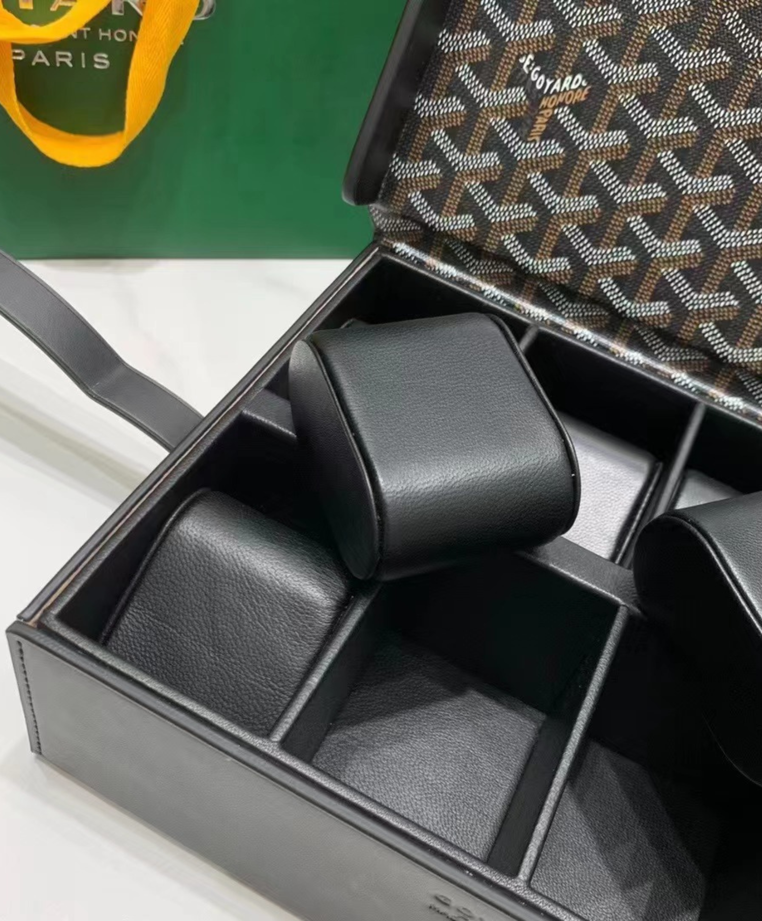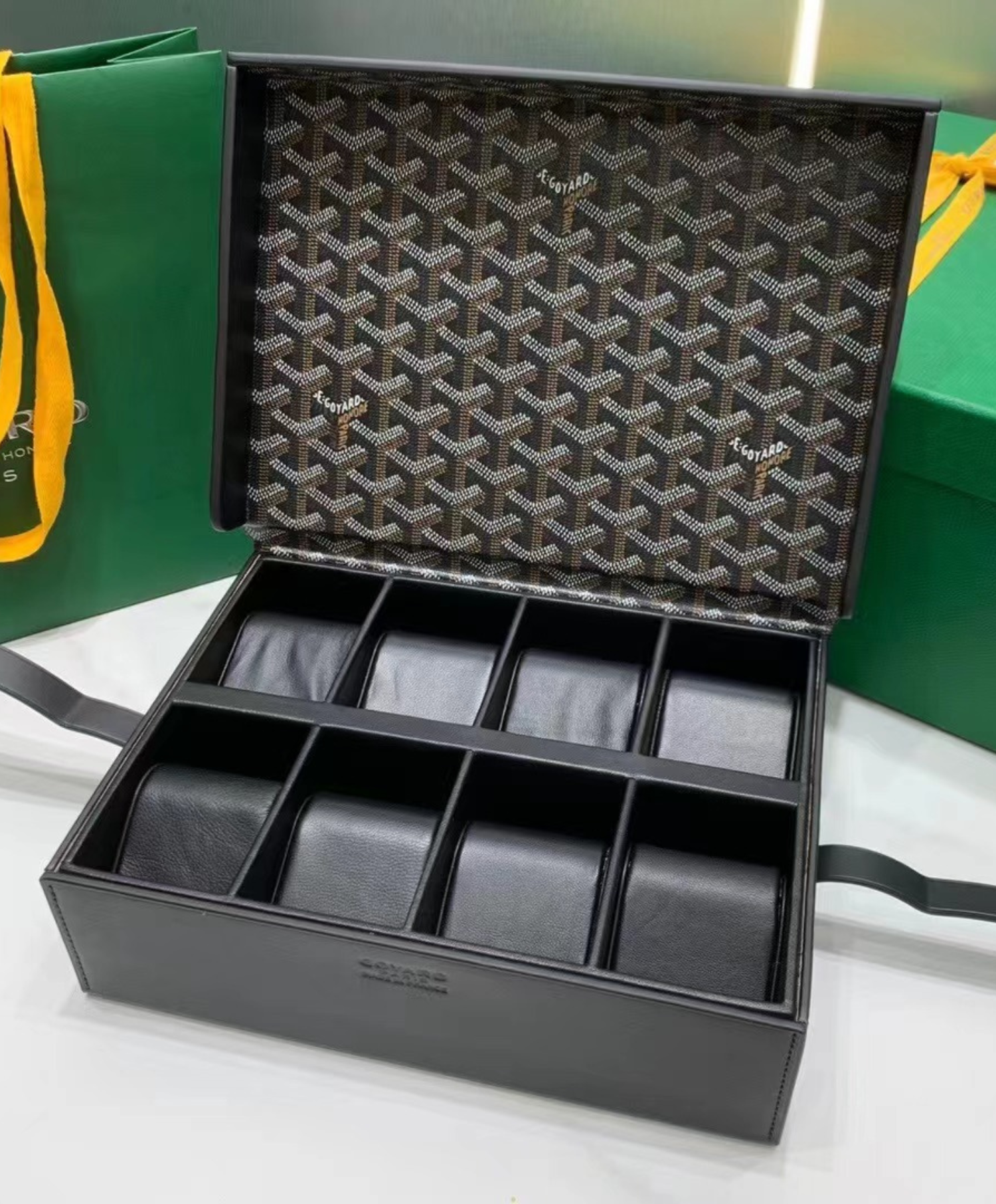 The 8 Watch Case is completely hand-made using traditional chest-making expertise, including the corner stitching - one of the key references to the craft. Its 8 interior cushions are perfect for transporting watches securely and safely.
