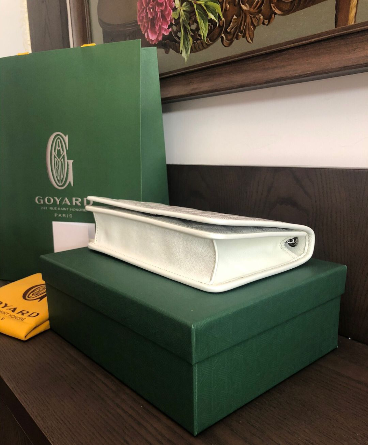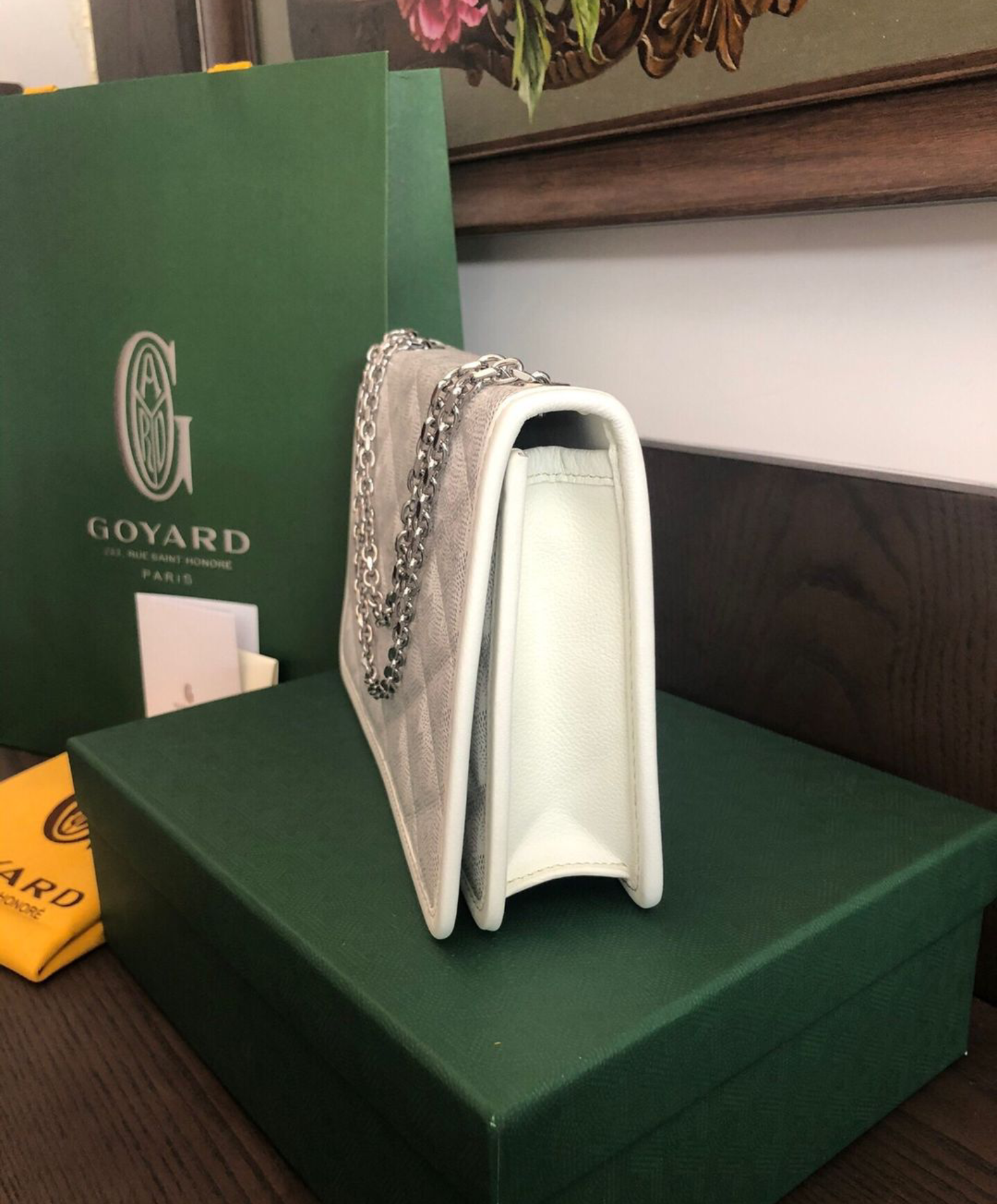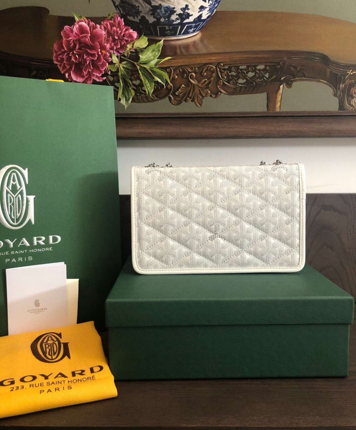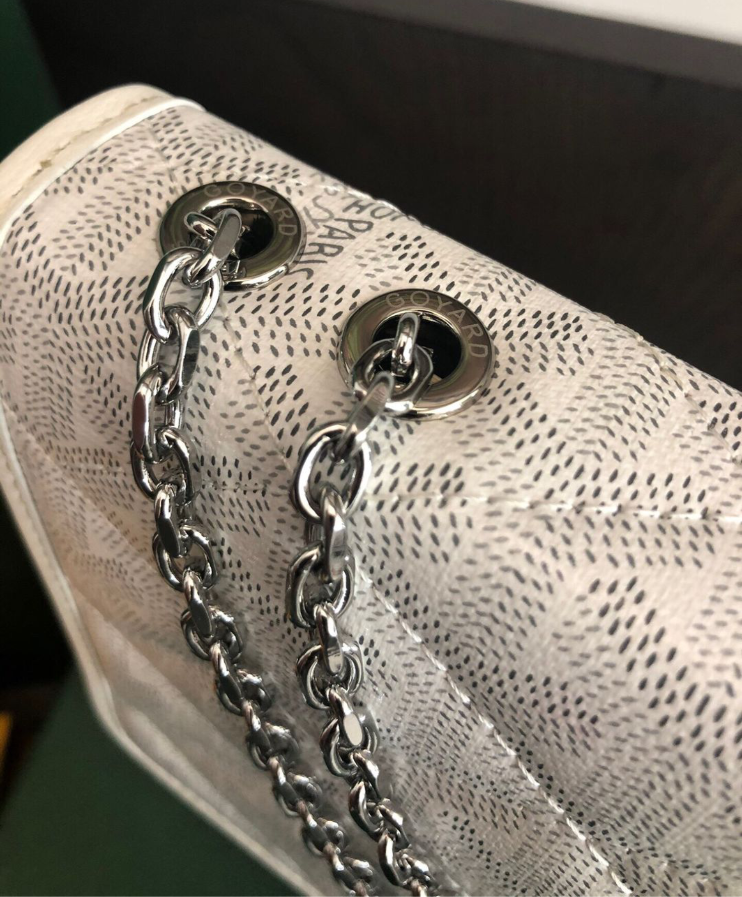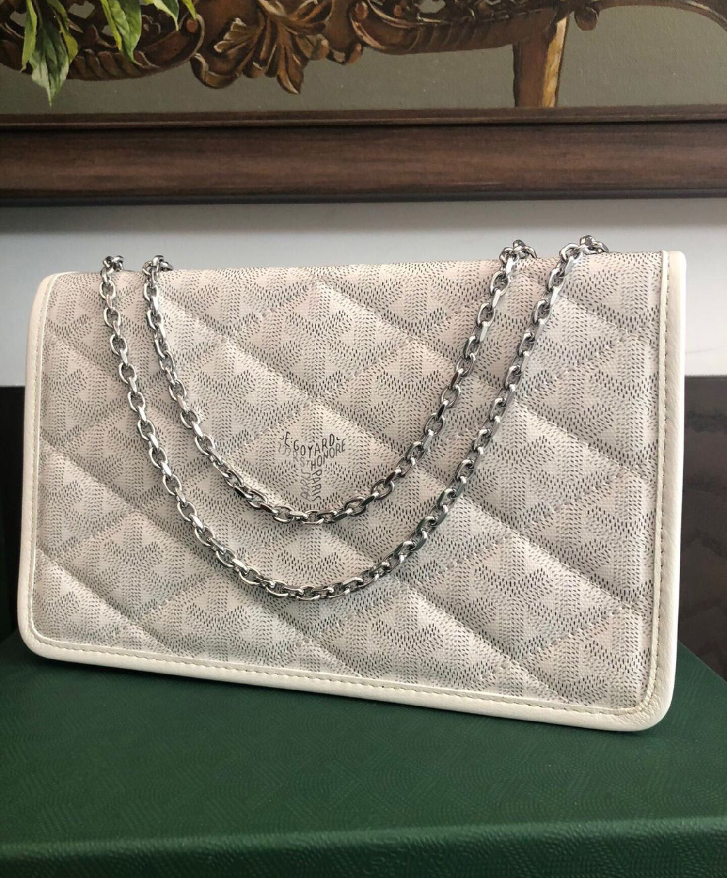 For the first time, the Alexandre III bag borrows an upholstery effect from our trunks in padded Goyardine. The chain can be altered to different lengths to match the style and the occasion.