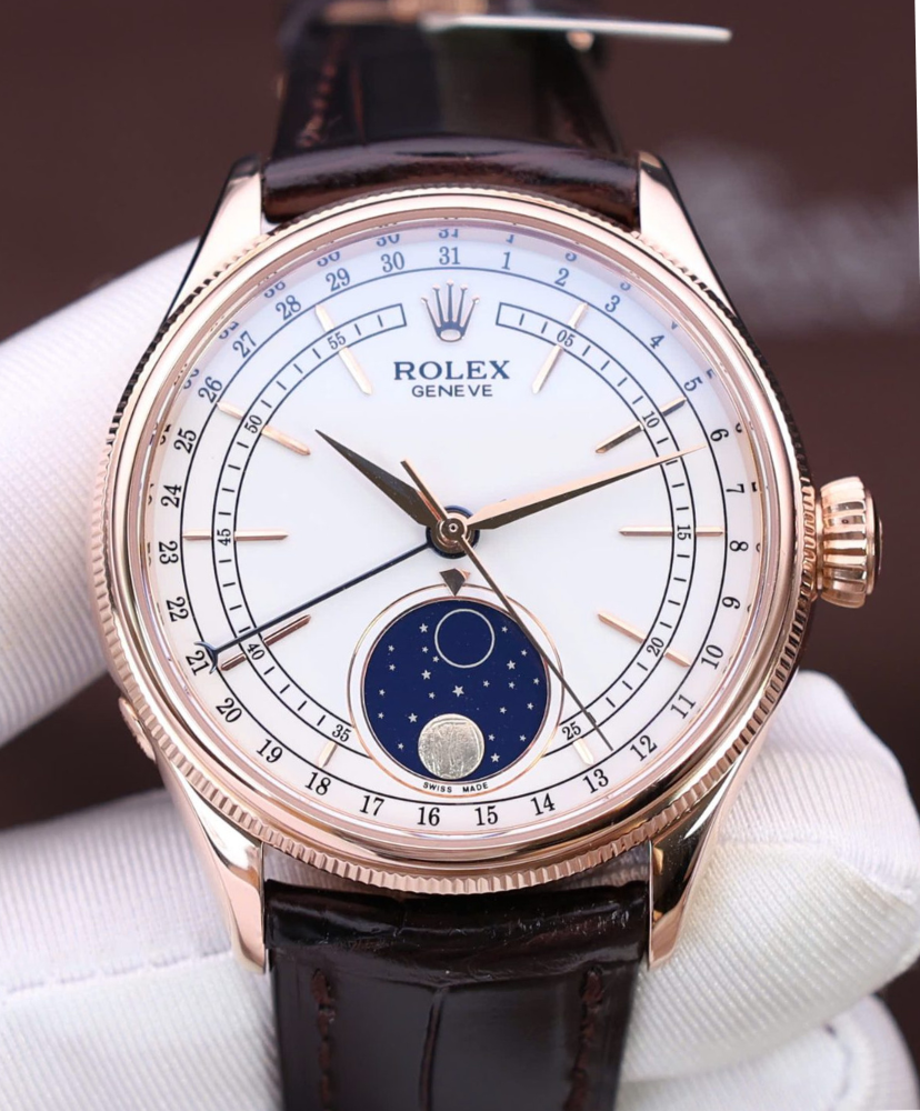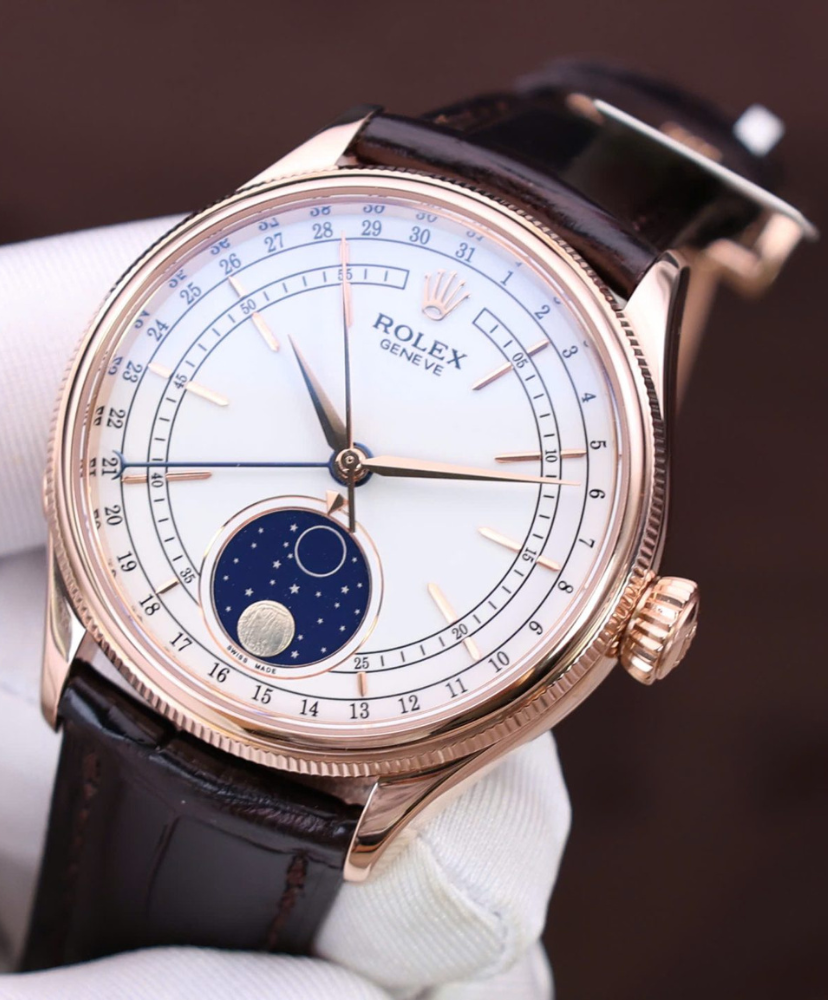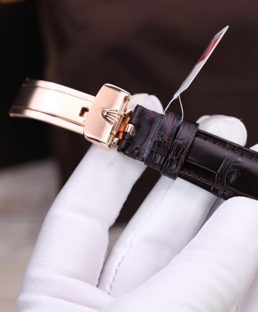 The Rolex Cellini is a refined masterpiece that embodies timeless elegance and artistic watchmaking. Crafted rose gold, the 39mm polished case exudes sophistication, with a double bezel design featuring a fluted inner ring for added detail.