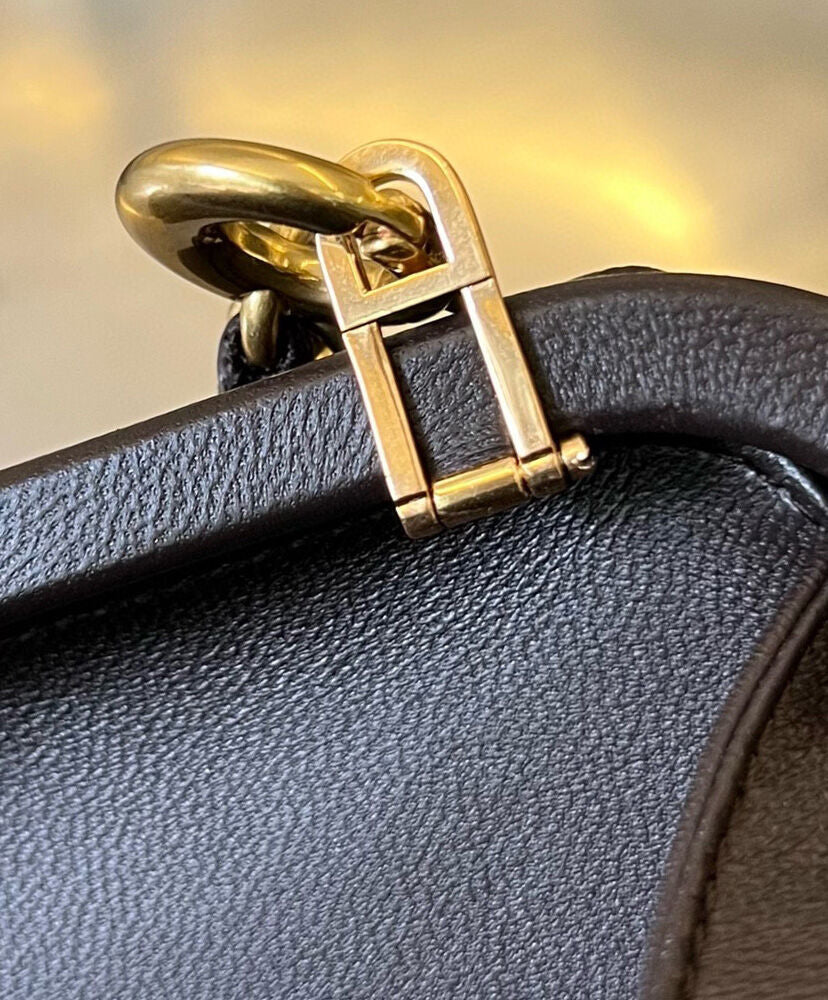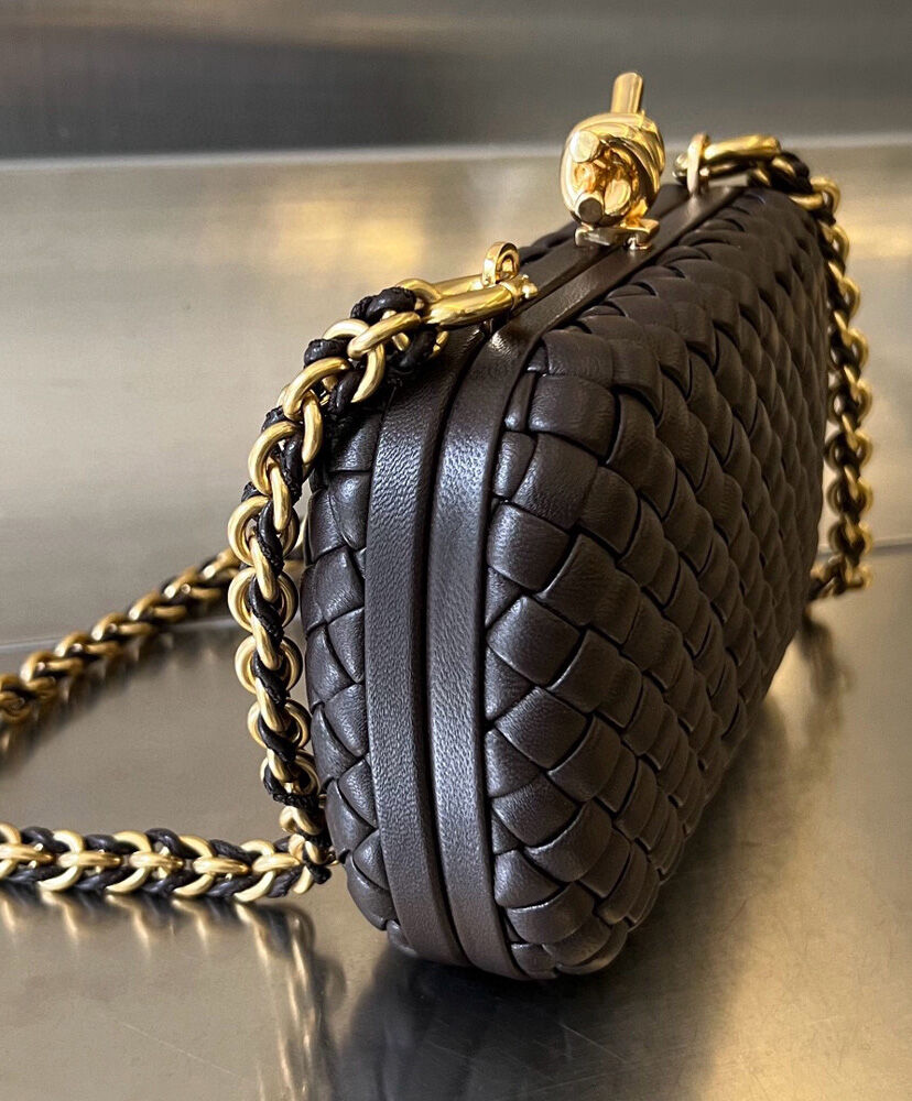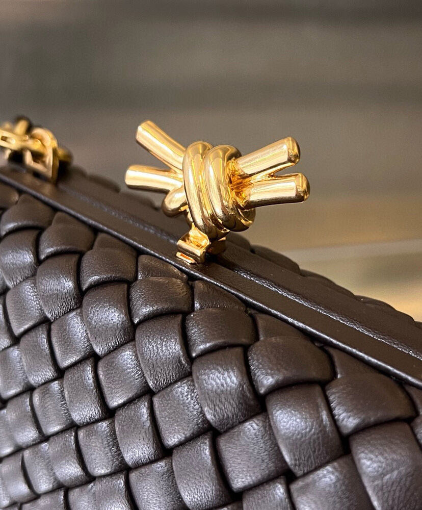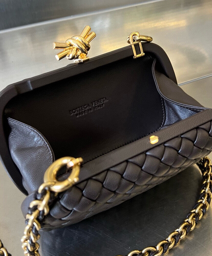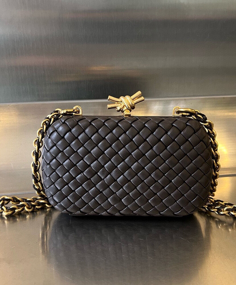 Matthieu Blazy amps up Bottega Veneta bags for Fall '23, adding artful, sculptural details to the intrecciato leather designs. This piece is decorated with a 'Knot' clasp, shaped in gold-tone metal to match the detachable chain strap.