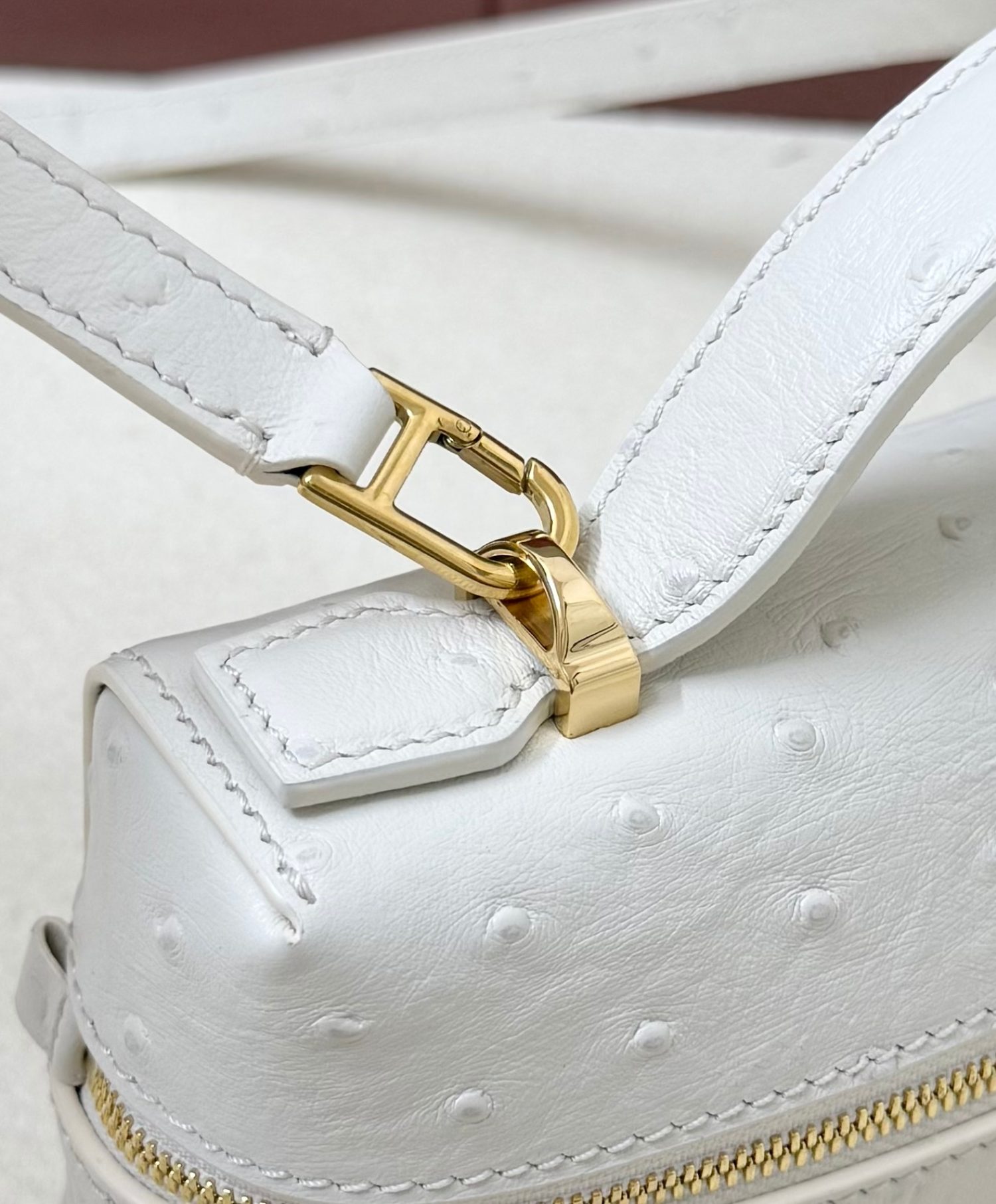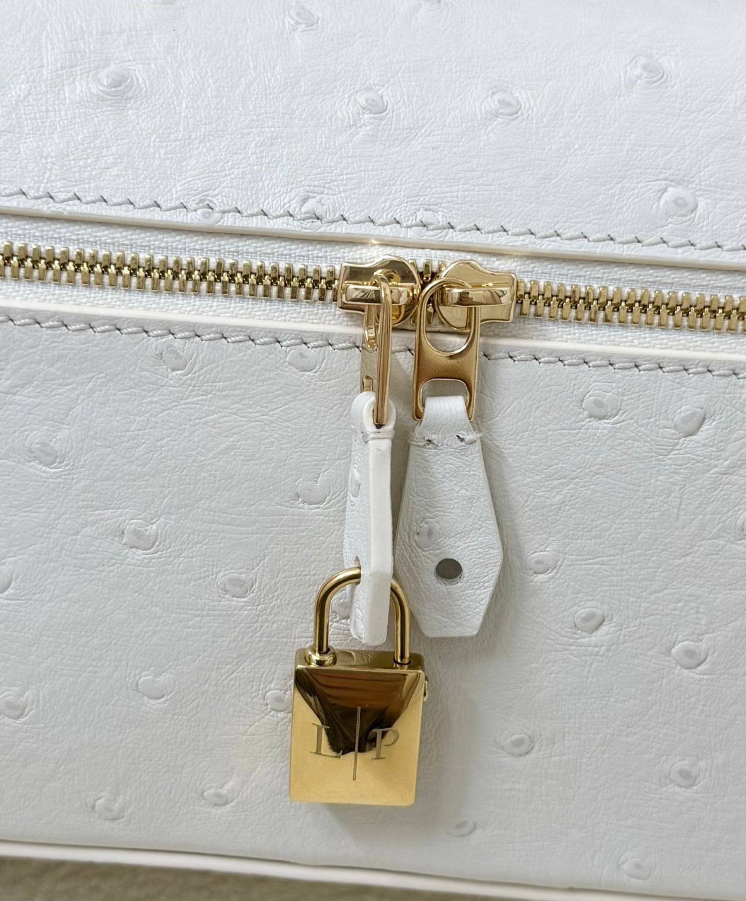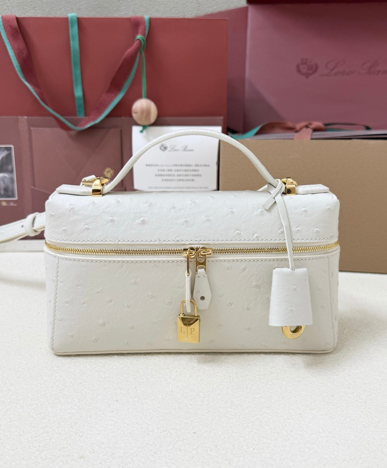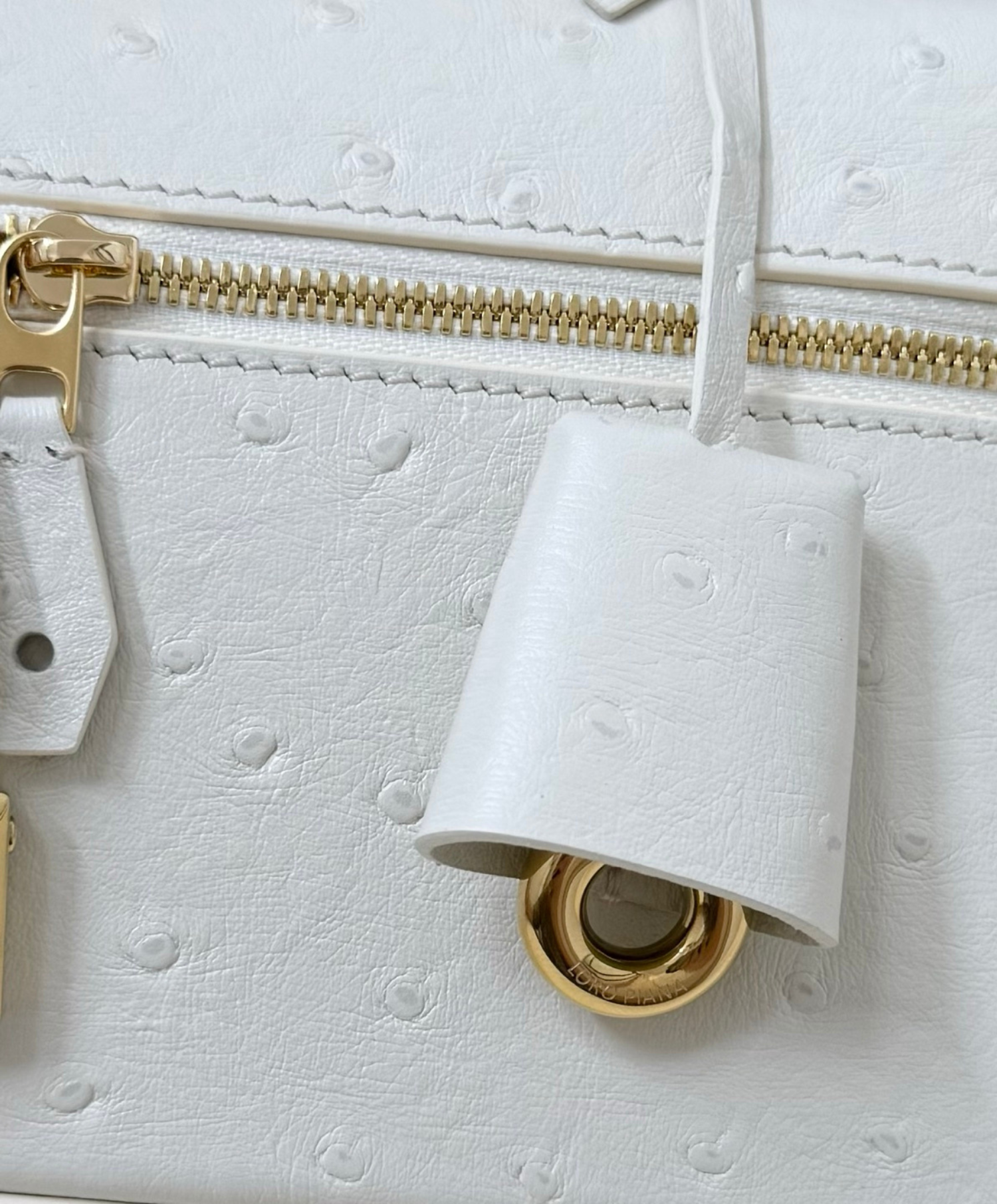 An elegant accessory with compact proportions, the Extra Bag L23 Ostrich Leather, combines timeless style with functionality. Primed for special occasions and everyday elegance alike, it is rendered in exclusive ostrich leather for ultimate sophistication. Suspended from the double-zip close are Loro Piana’s iconic charms, framed by a refined key holder.