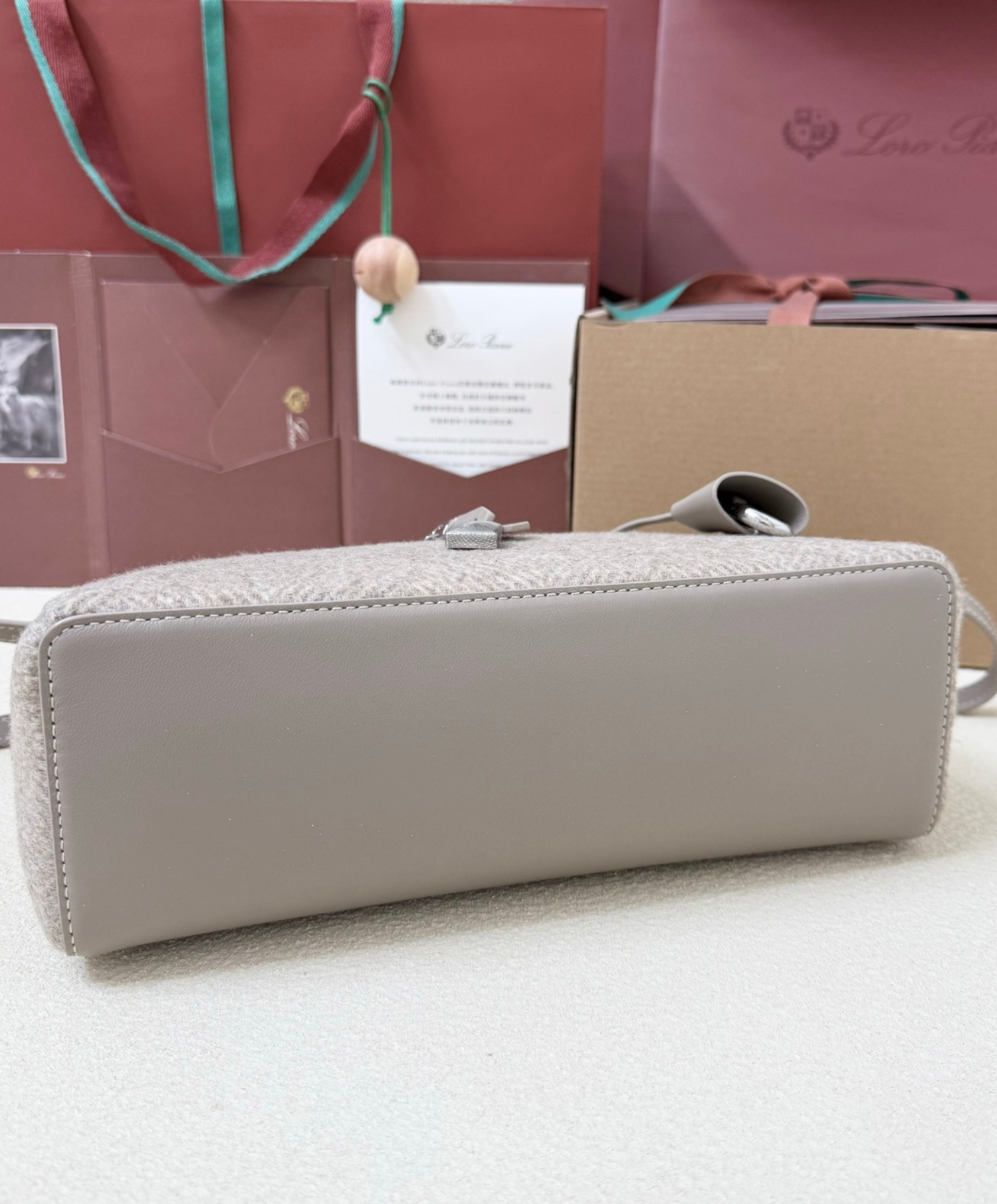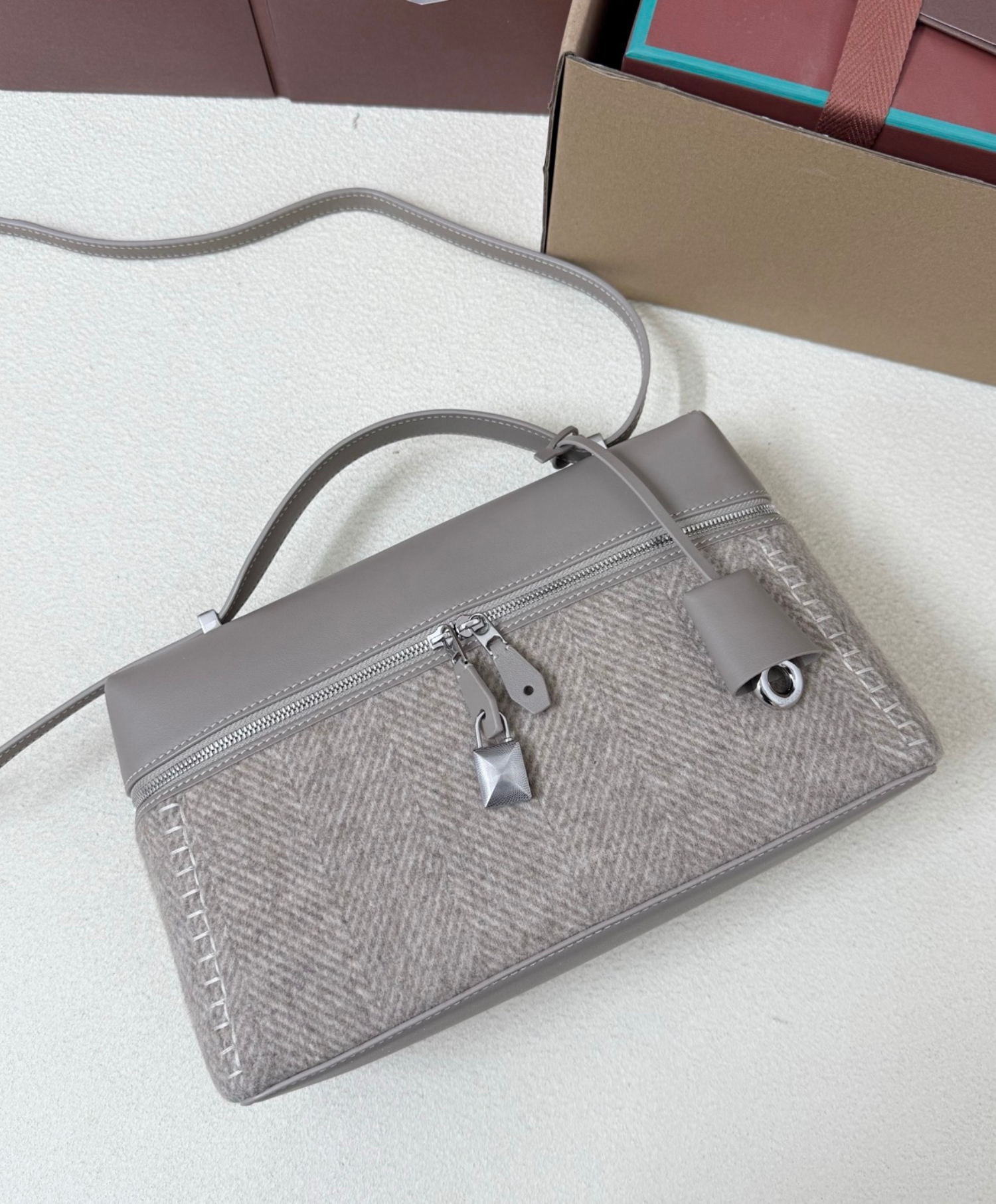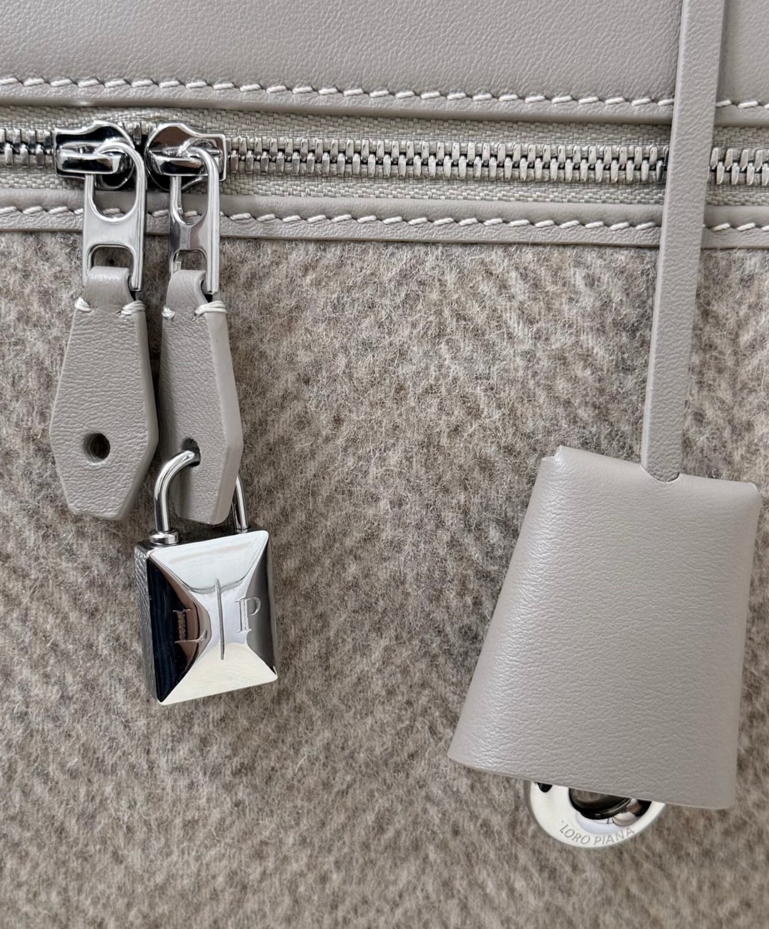 An elegant accessory with compact proportions, the Extra Bag L27 combines timeless style with functionality. Primed for special occasions and everyday elegance alike, it is rendered in Pecora Nera®, garnered from dark-hued Merino sheep and woven with an elegant chevron motif. Suspended from the double-zip close are Loro Piana’s iconic charms, framed by a refined leather key holder.