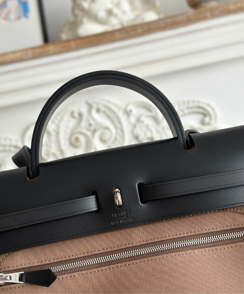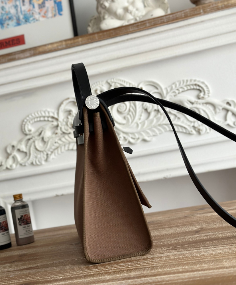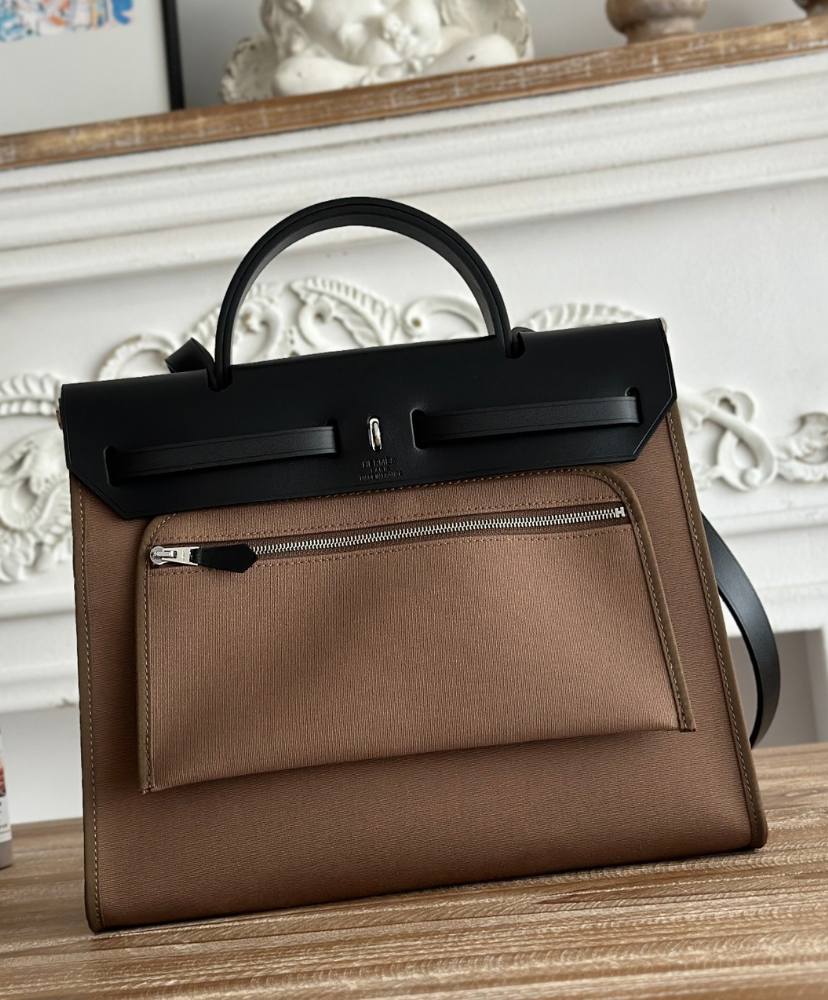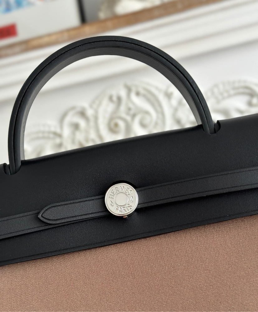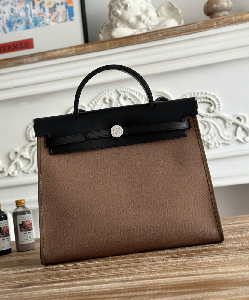 Widely considered the younger sibling of the Kelly, the Hermes Herbag 31 combines excellent quality with a more casual style. Its striking appearance is further enhanced by the combination of canvas and leather, complemented beautifully with silver hardware. Crafted by hand, this piece boasts the iconic "Clou de Selle" closure and Vache Hunter leather.