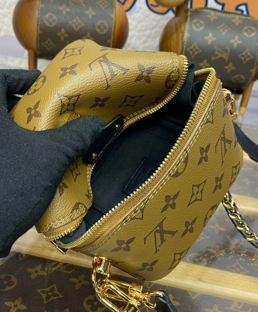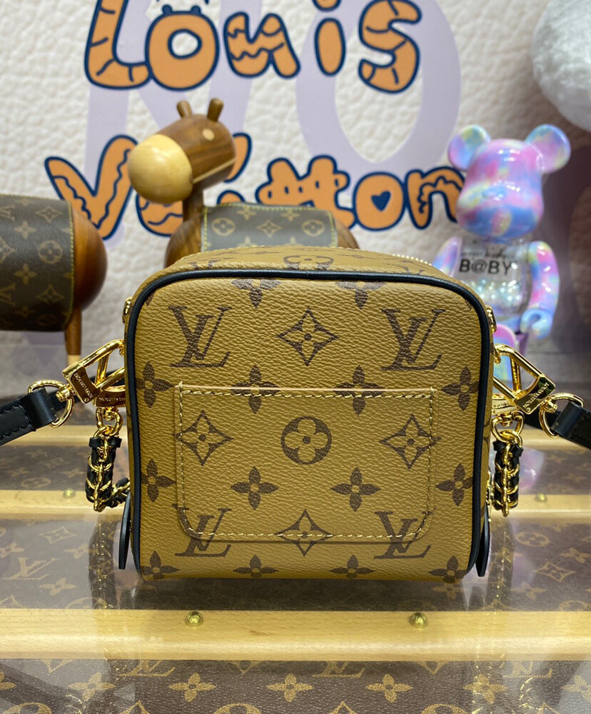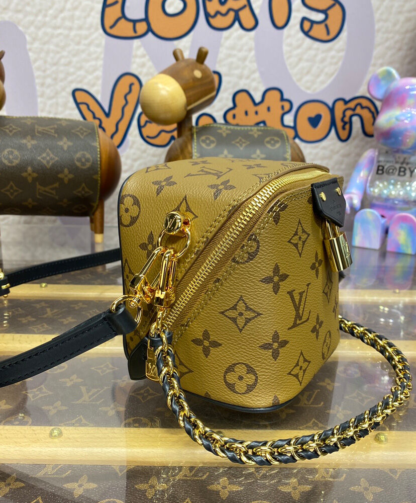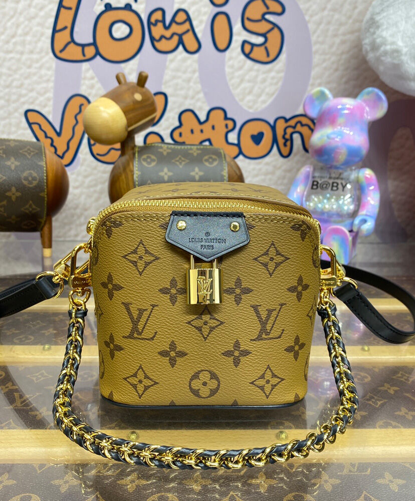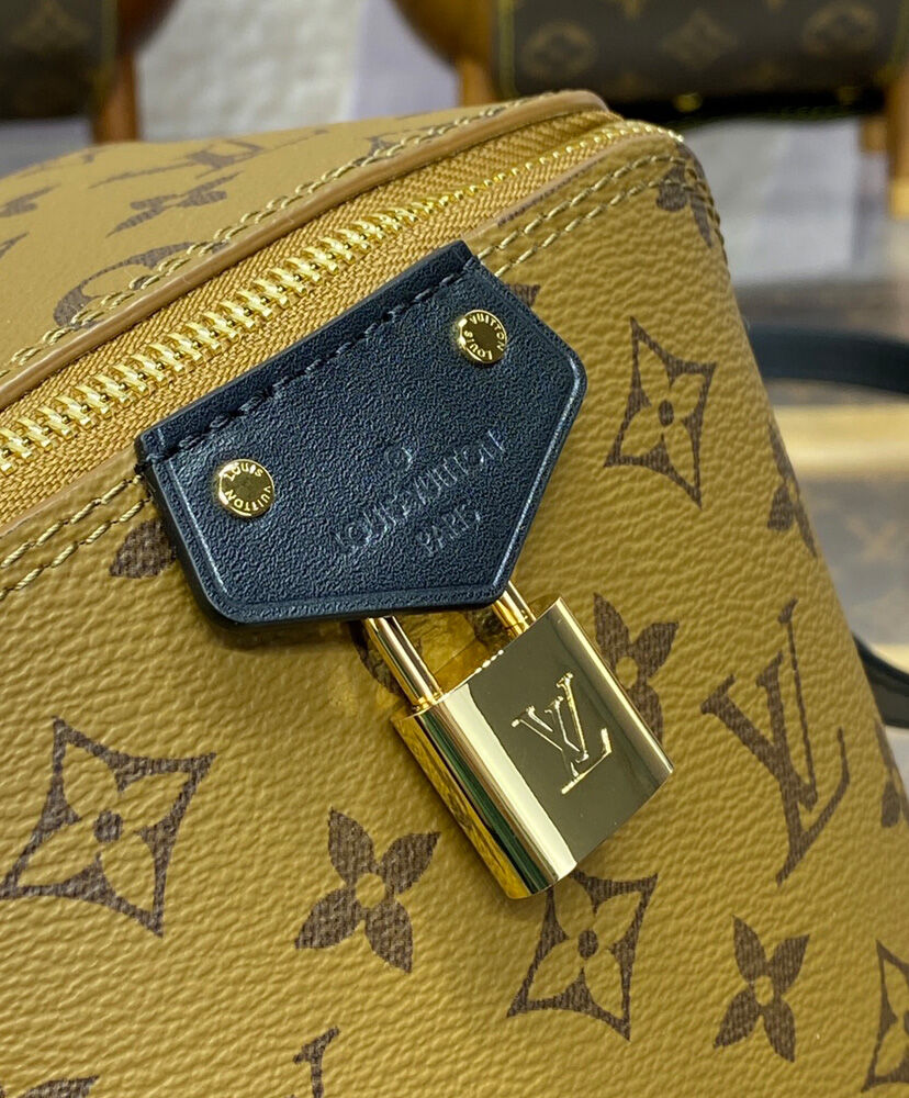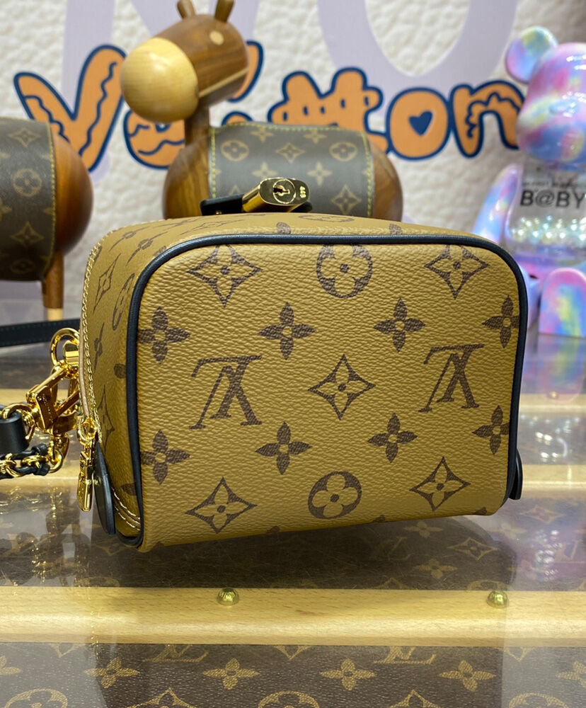 Nicolas Ghesquière revisits Louis Vuitton’s travel legacy with a trendy new vanity, the Just In Case in Monogram Reverse canvas, part of the Spring-Summer 2024 Collection. Compact proportions meet House detailing for a must-have travel companion to carry smaller accessories. The perfect bag to complete any travelling woman’s silhouette.