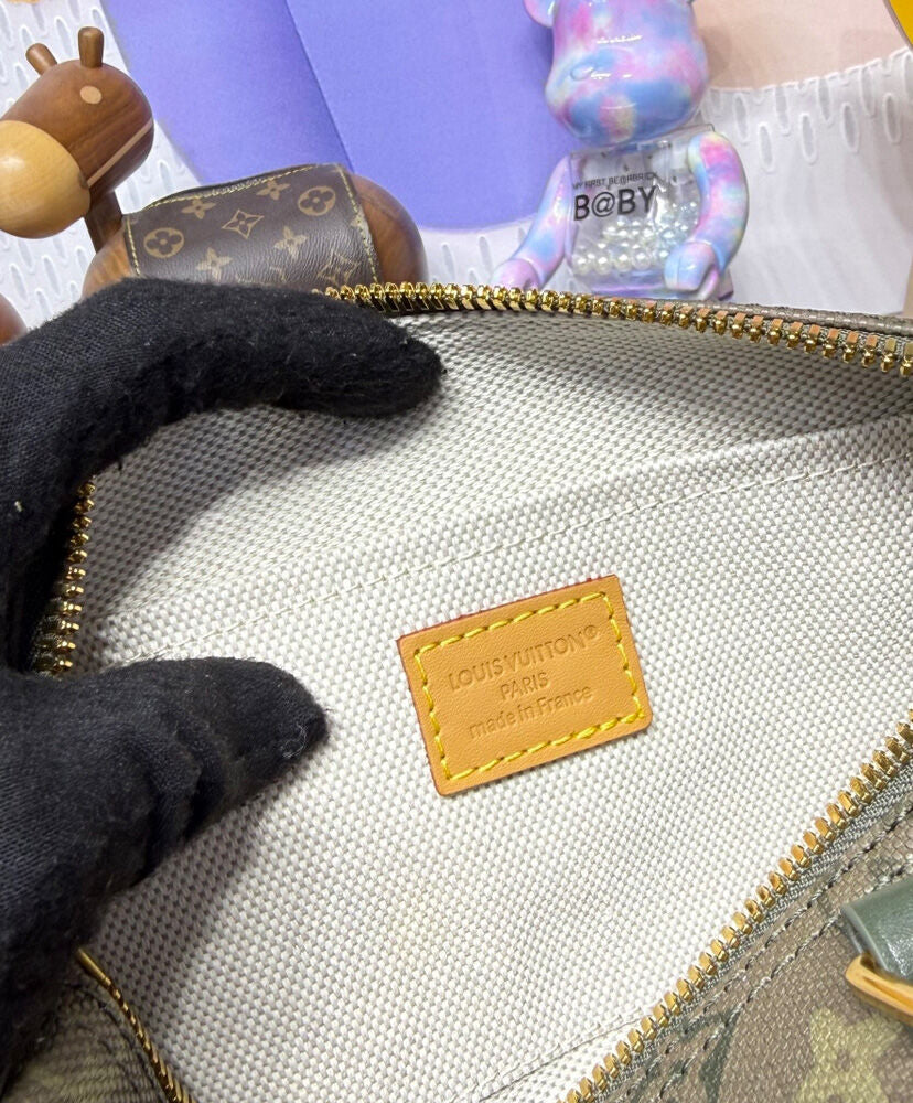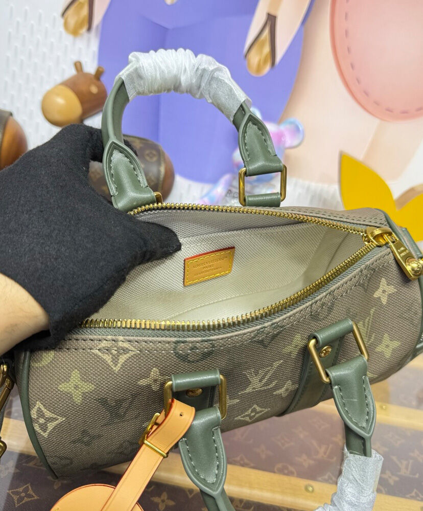 With its army-green colorway and irregular Monogram print, Monogram Surplus coated canvas gives this Keepall Bandouliere 25 a camouflage-inspired look. The main compartment closes securely thanks to an aged-gold-tone zipper. In addition to the top handles, there’s a wide, removable textile strap that adjusts for shoulder or cross-body wear.