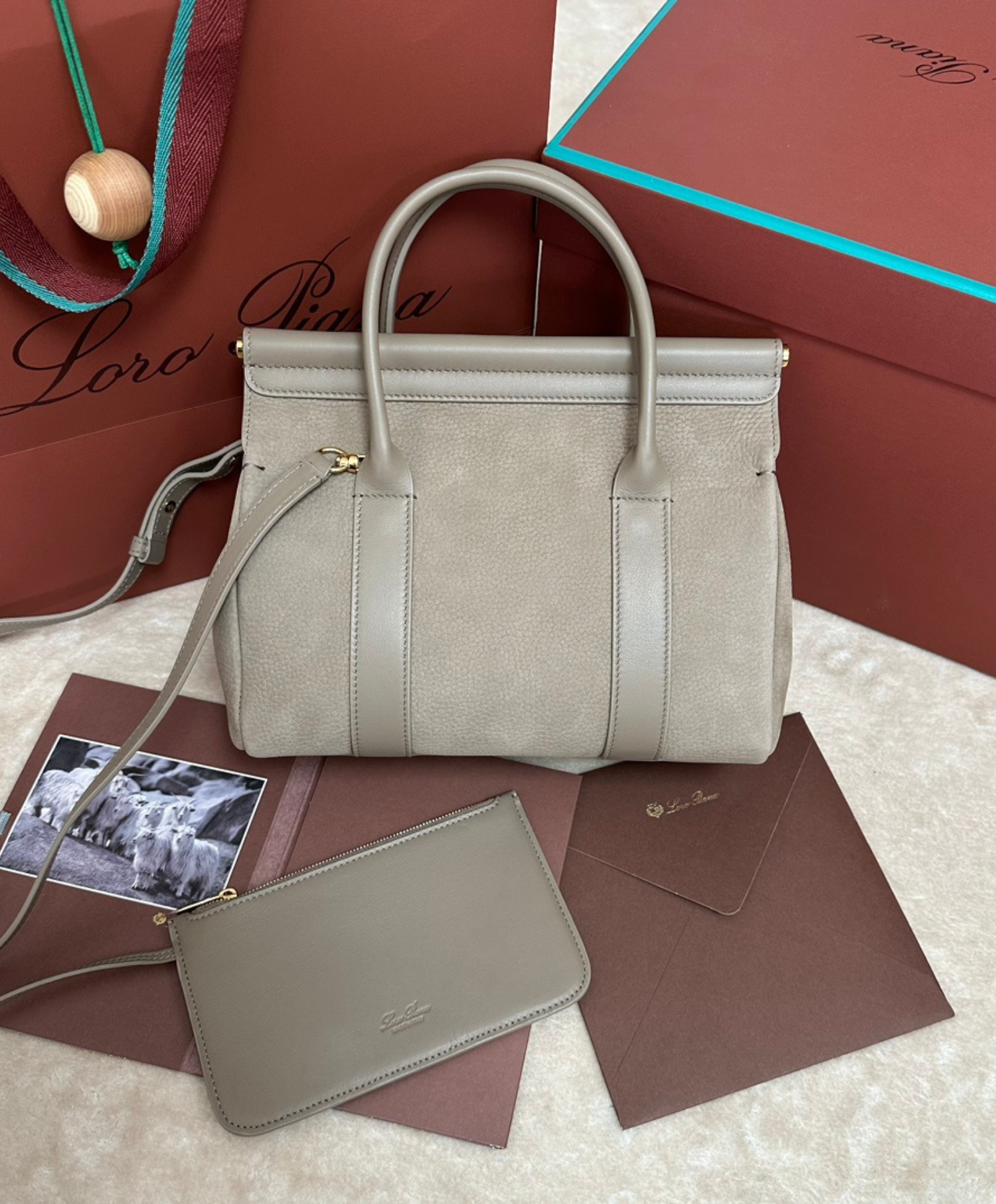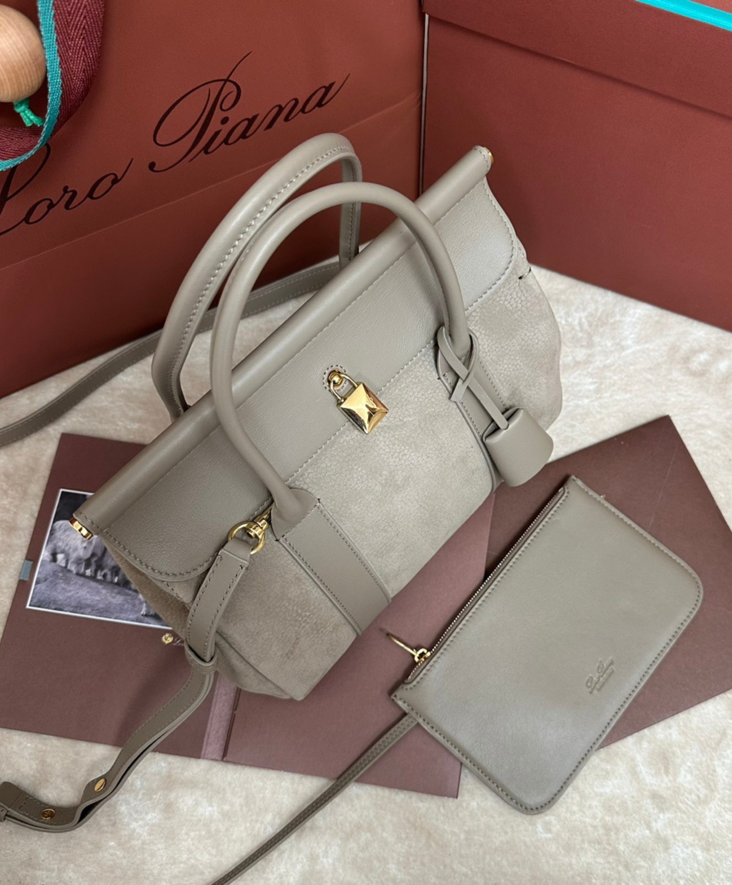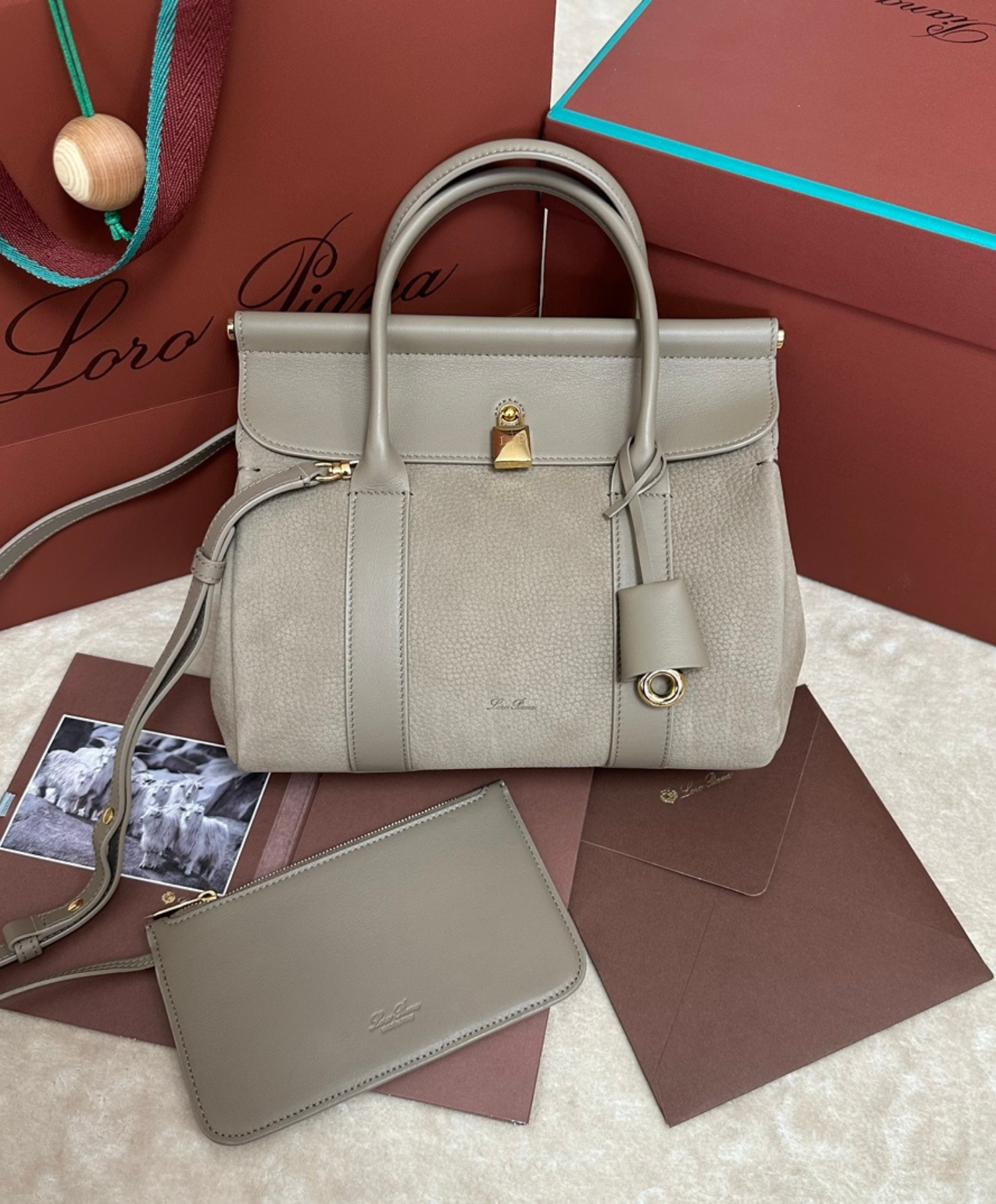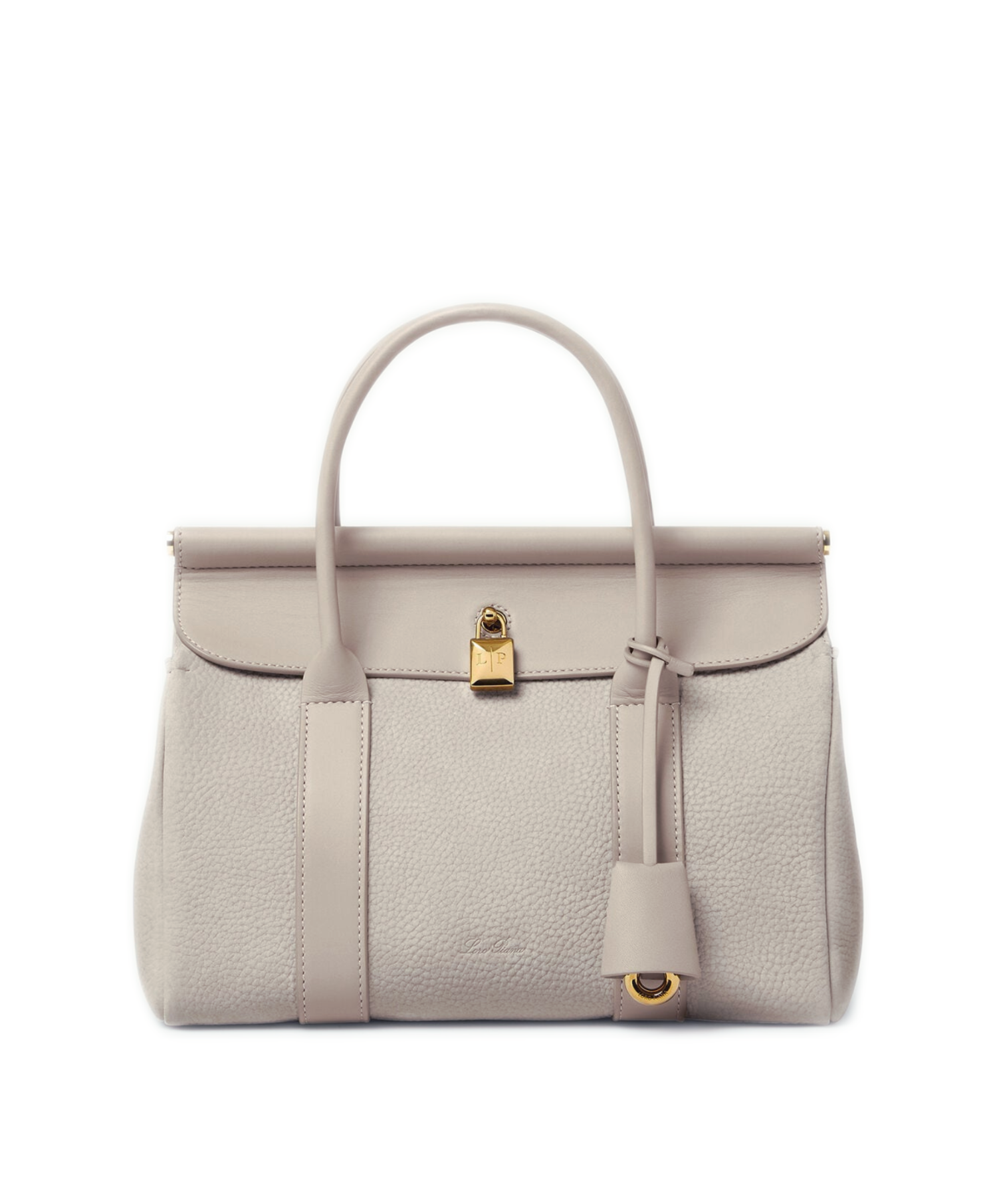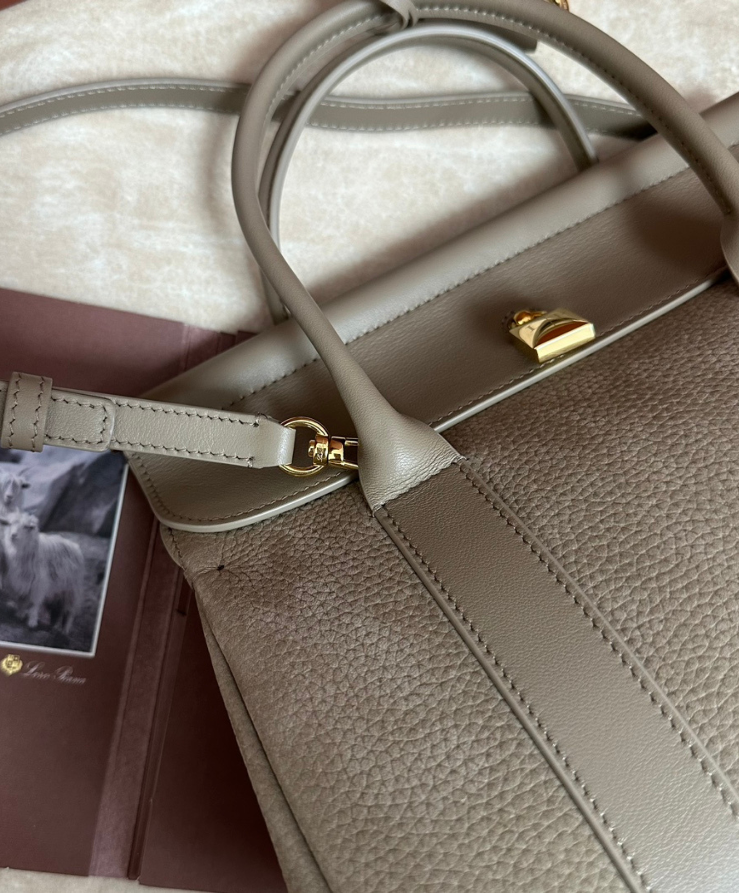 The Loom bag pays homage to Loro Piana's centuries-old textile heritage, with the metal bar beneath the flap evoking the gentle cascade of fabric draped across an artisan's loom - a subtle nod to the brand's storied weaving techniques. Beautifully crafted in soft, silky calfskin with a unique grained finish, the refined padlock that closes the bag can be unfastened, giving it a more relaxed look. Loom can be worn closed or open without losing charm and personality. Even when worn unfolded, the bag gracefully closes by itself. The bag can be carried crossbody.
