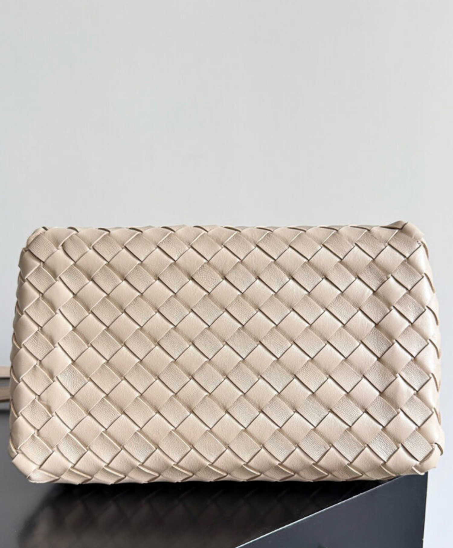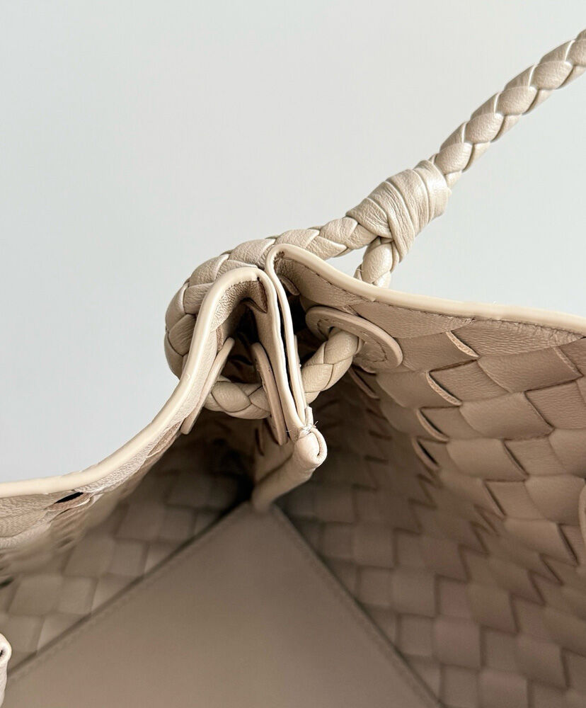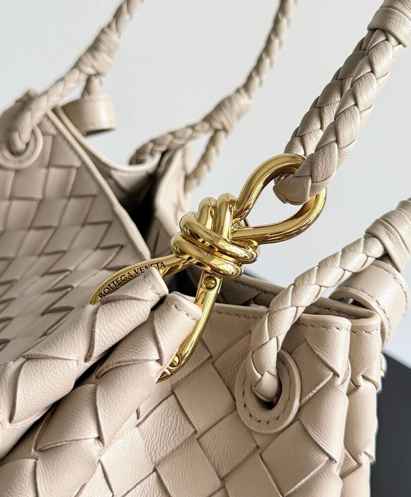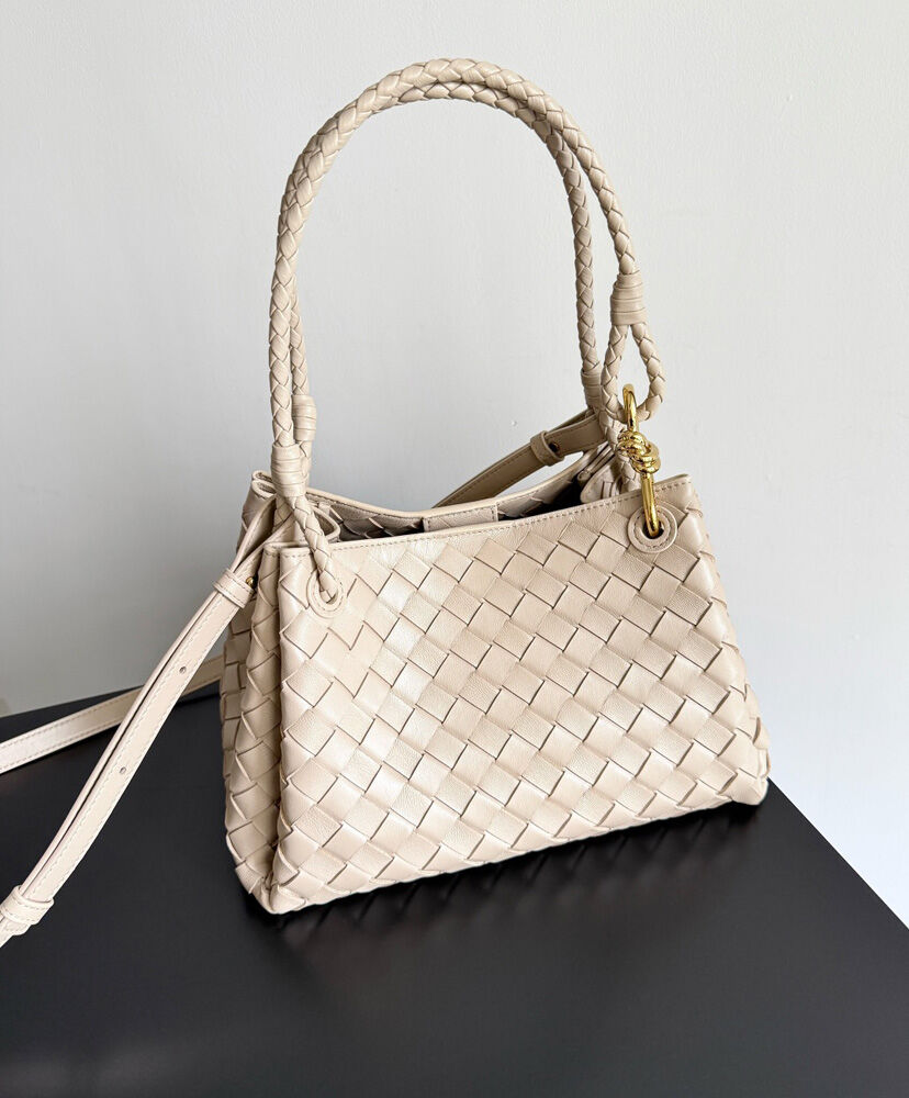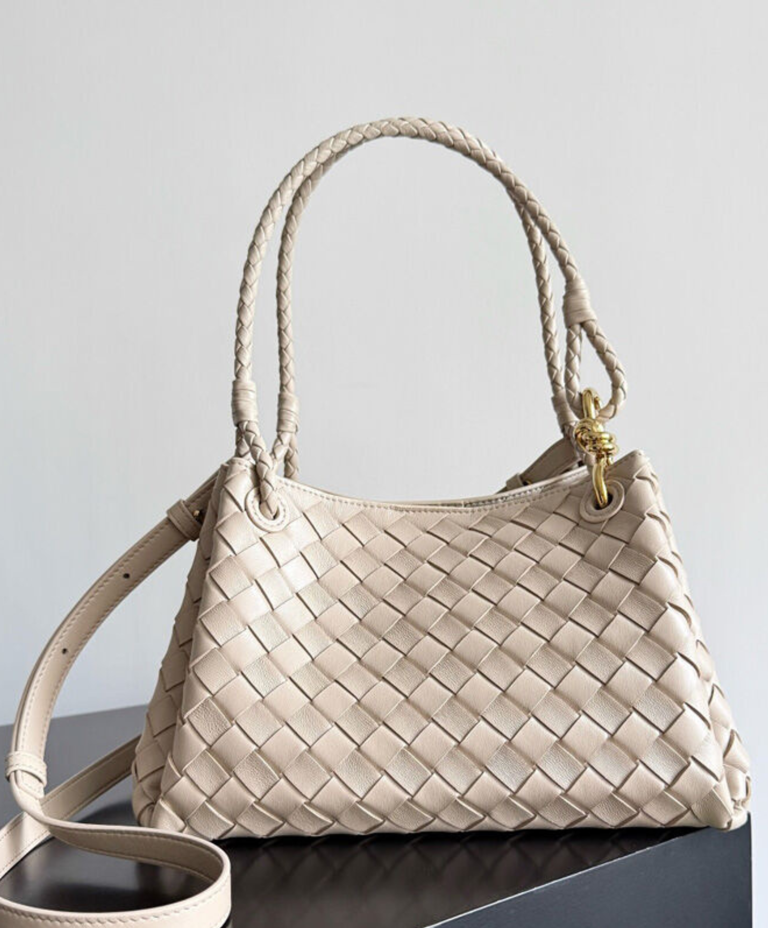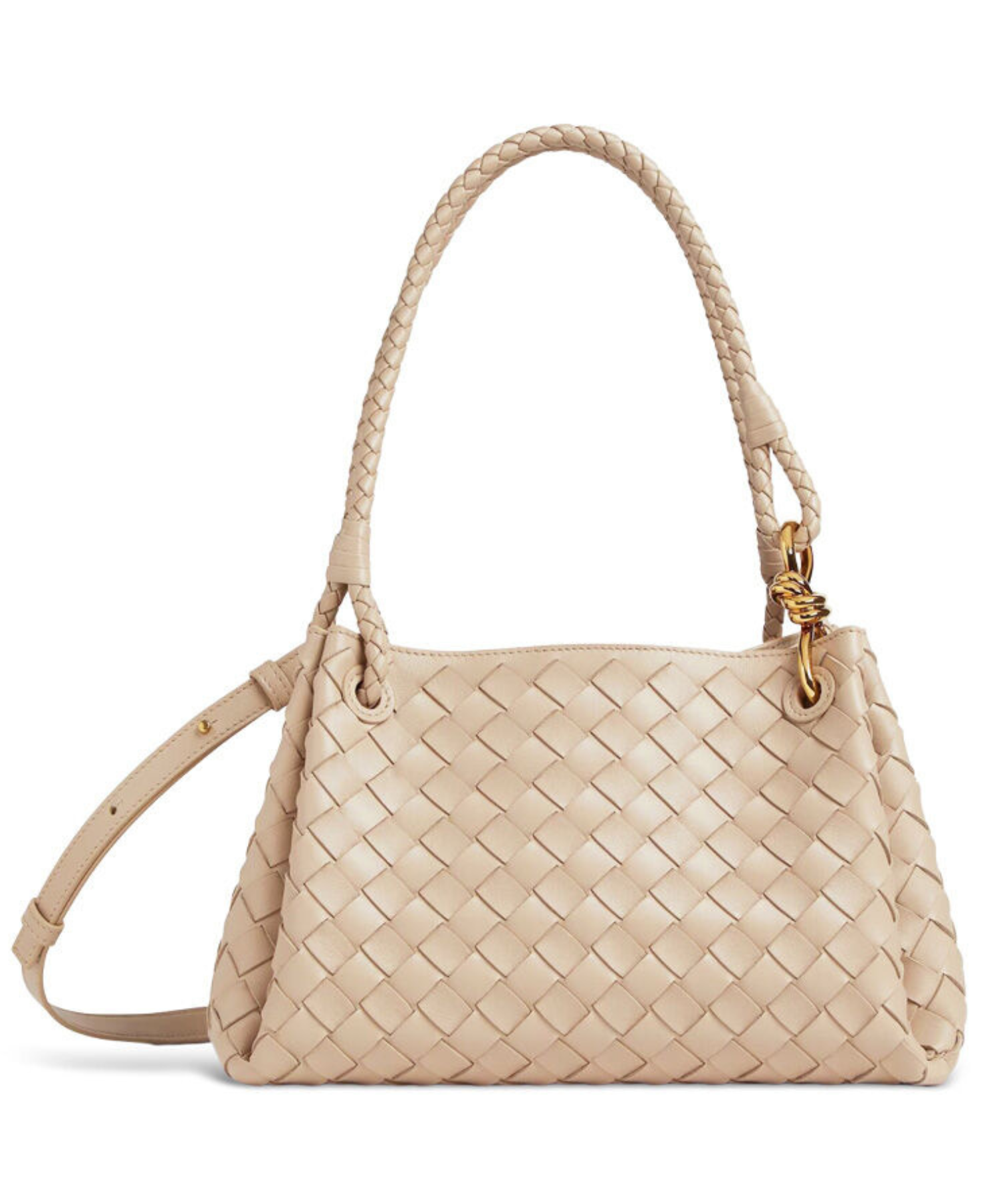 Bottega Veneta shoulder bag in supple Intrecciato leather in dark barolo with signature knot detail and detachable cross-body strap. Featuring one main compartment and magnetic tab closure.