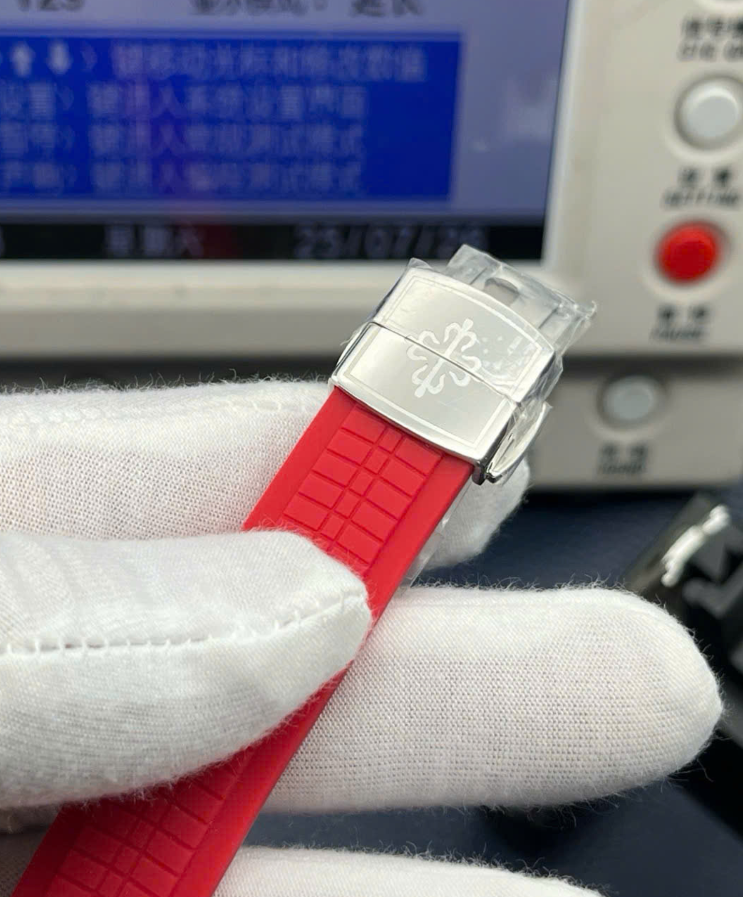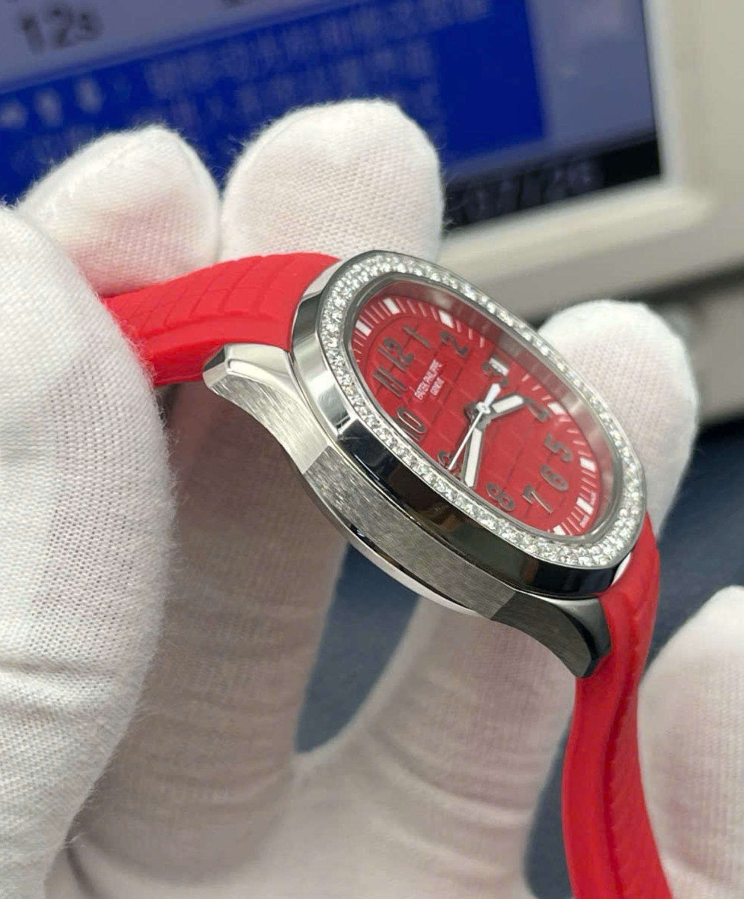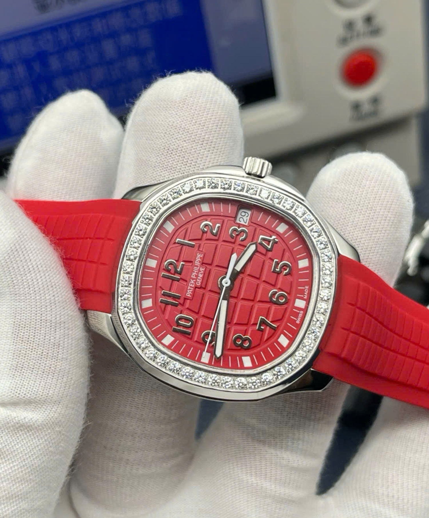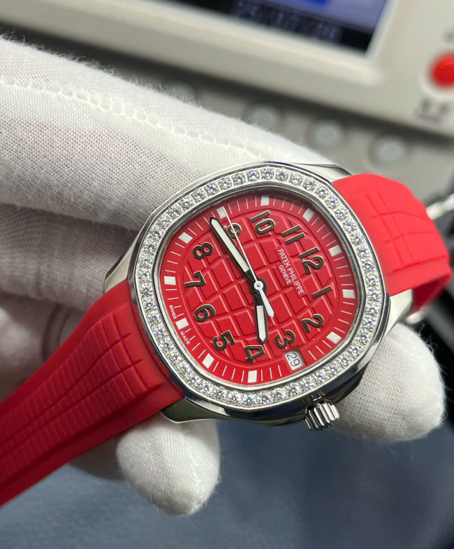 The Patek Philippe Aquanaut Luce, measuring 38.8 mm, is a vibrant masterpiece that blends sporty flair with high-end luxury; featuring a striking raspberry red dial and matching composite strap, all beautifully framed by a sparkling diamond-set bezel and a polished stainless steel case.