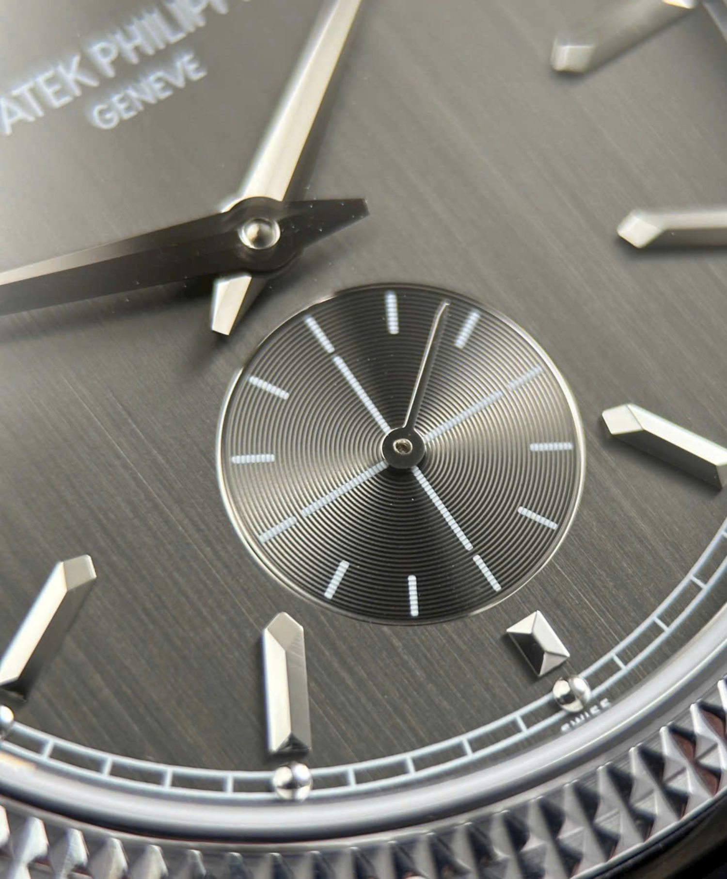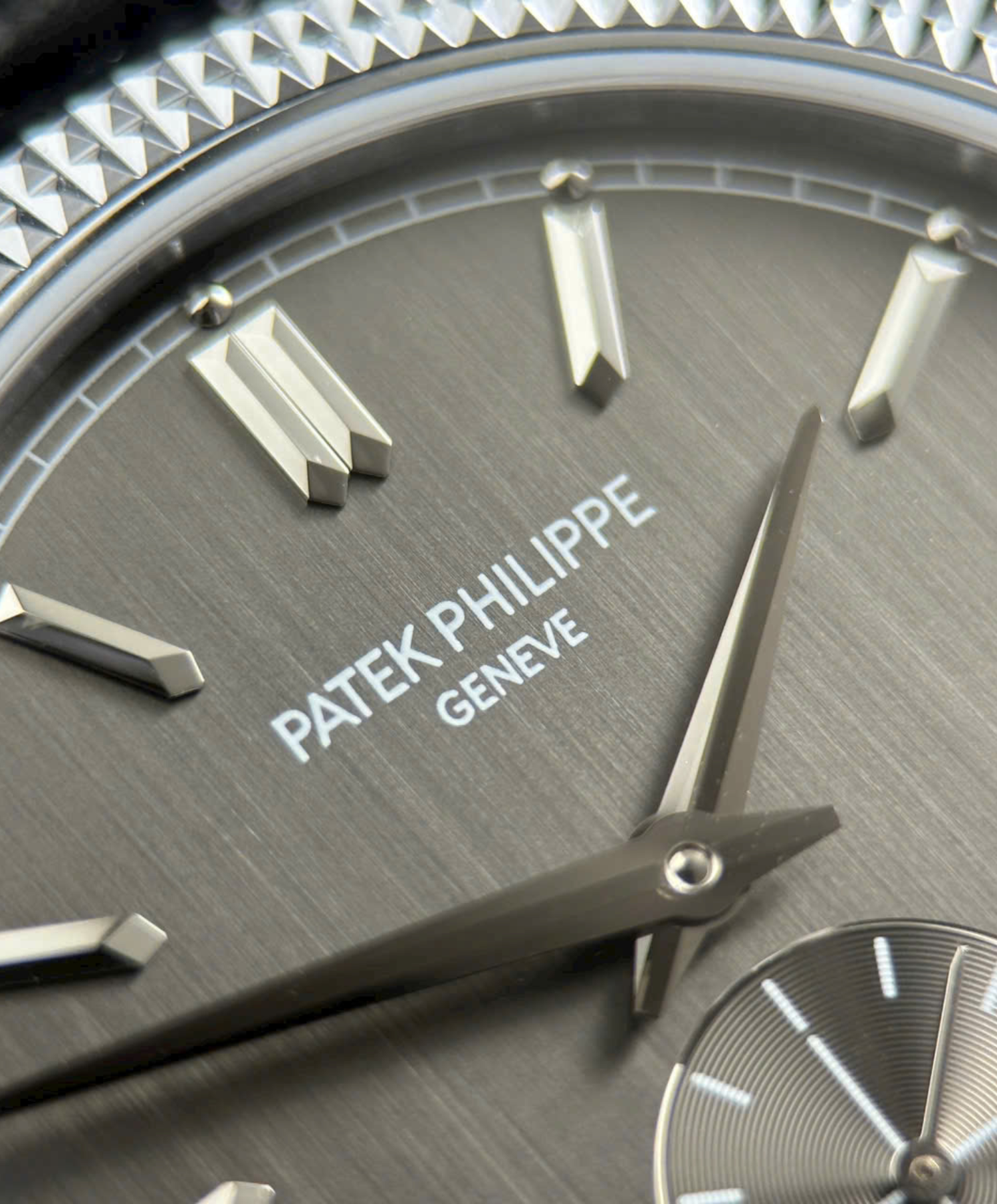 A masterclass in understated luxury, this 39mm timepiece features the iconic hand-guilloched hobnail bezel that captures light from every angle, paired with a sophisticated charcoal gray vertical satin-finish dial and a hand-stitched alligator strap for a look of unparalleled refinement.