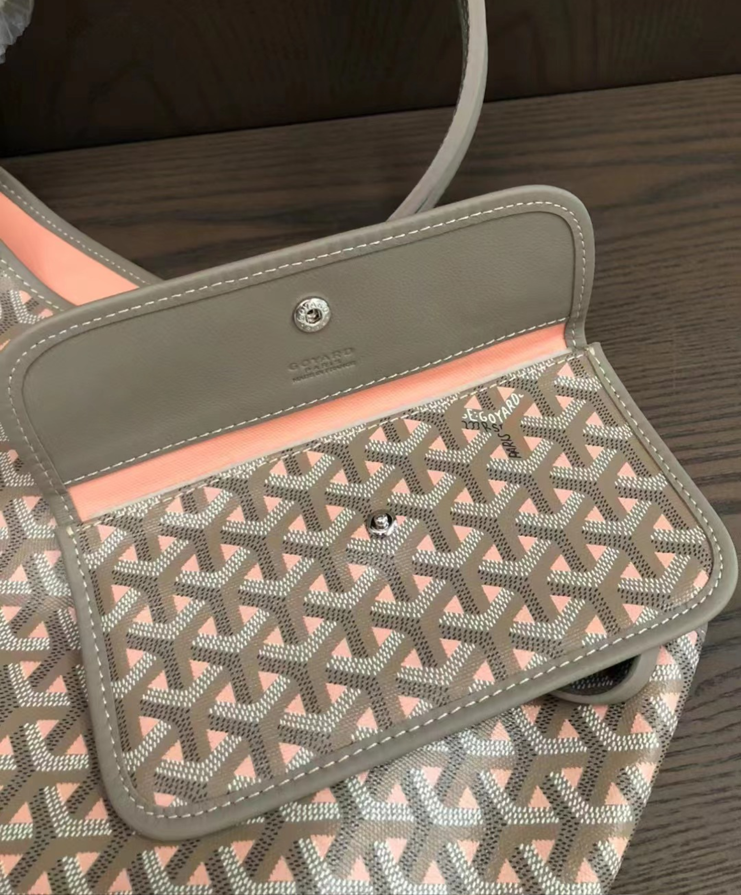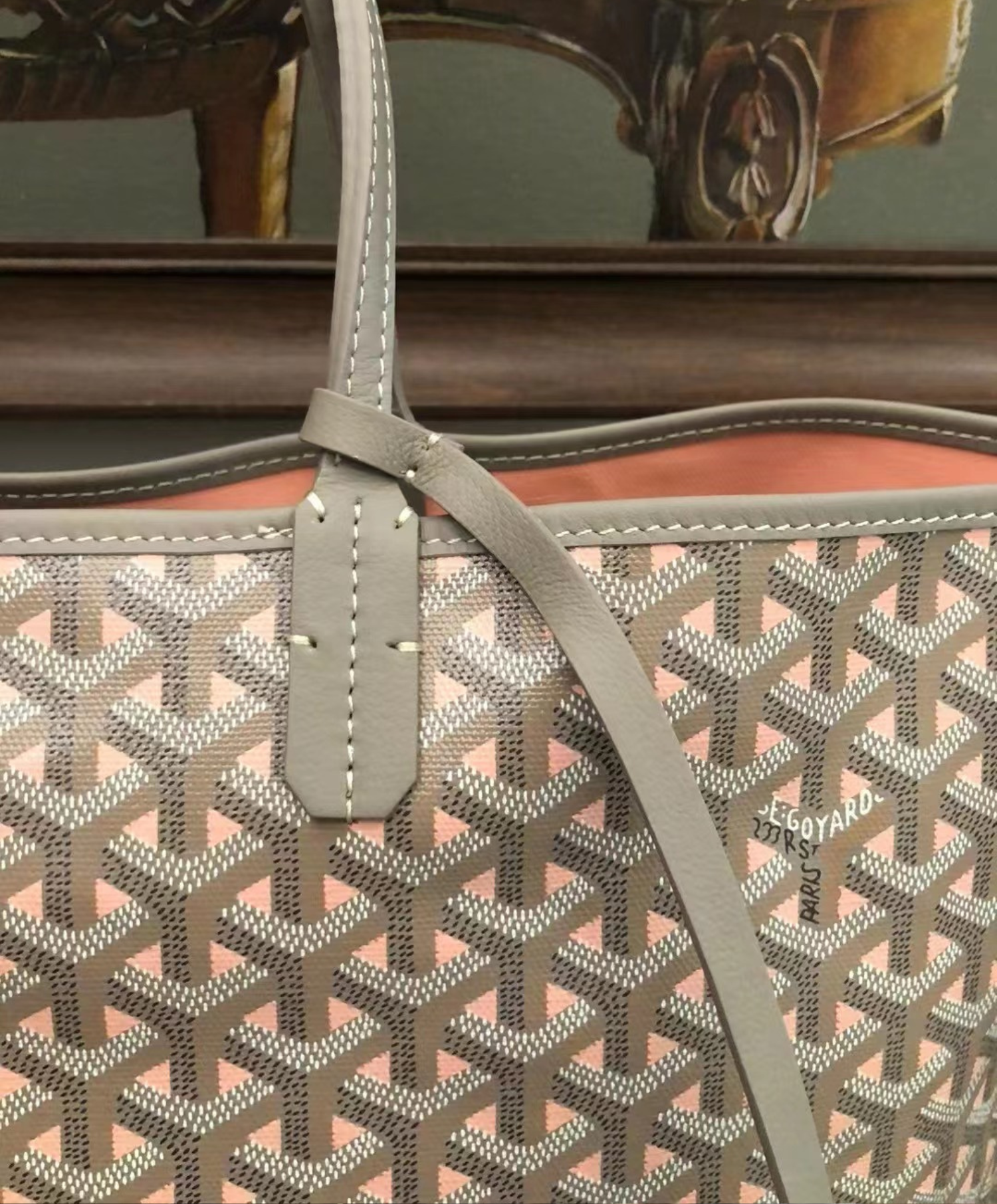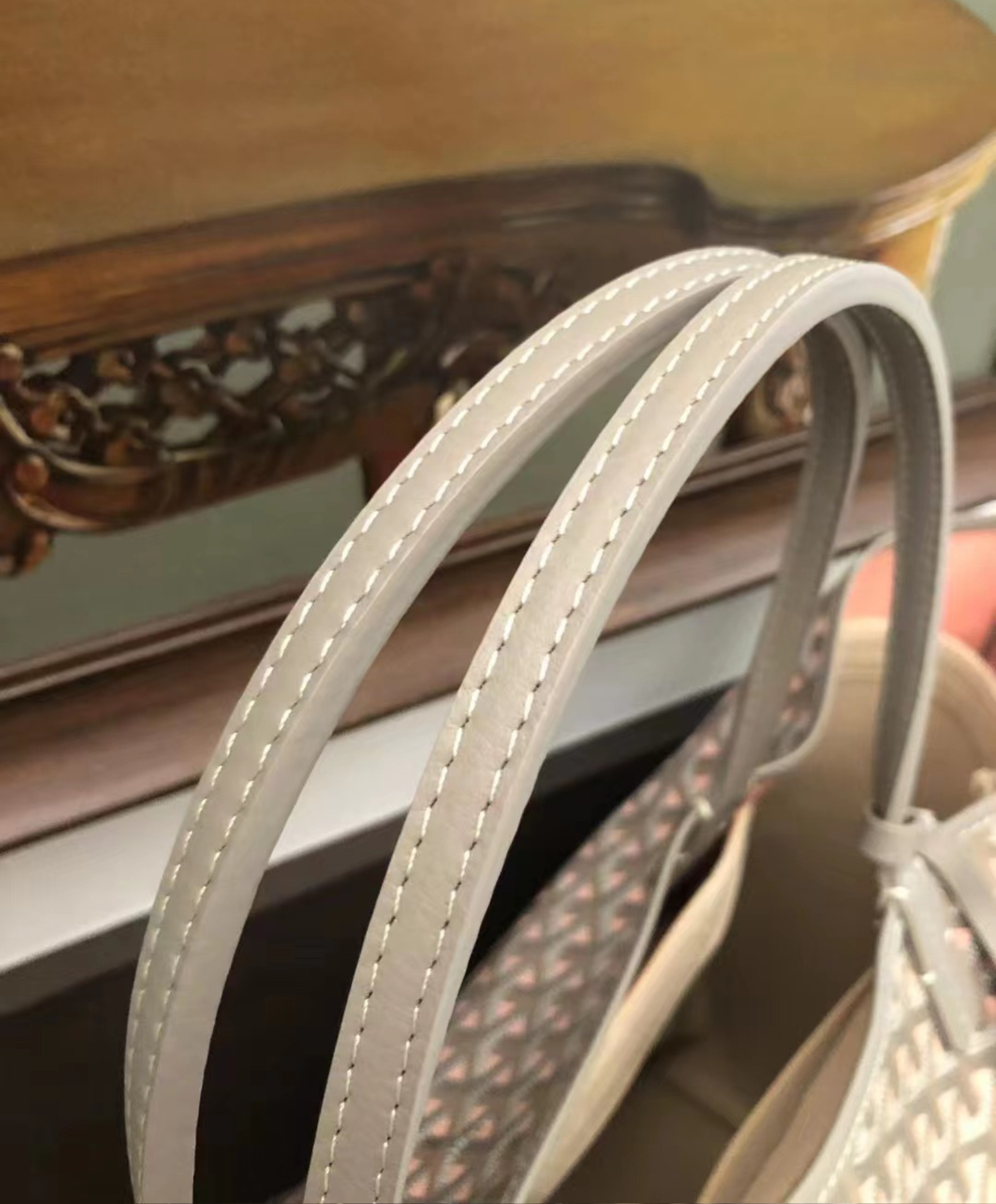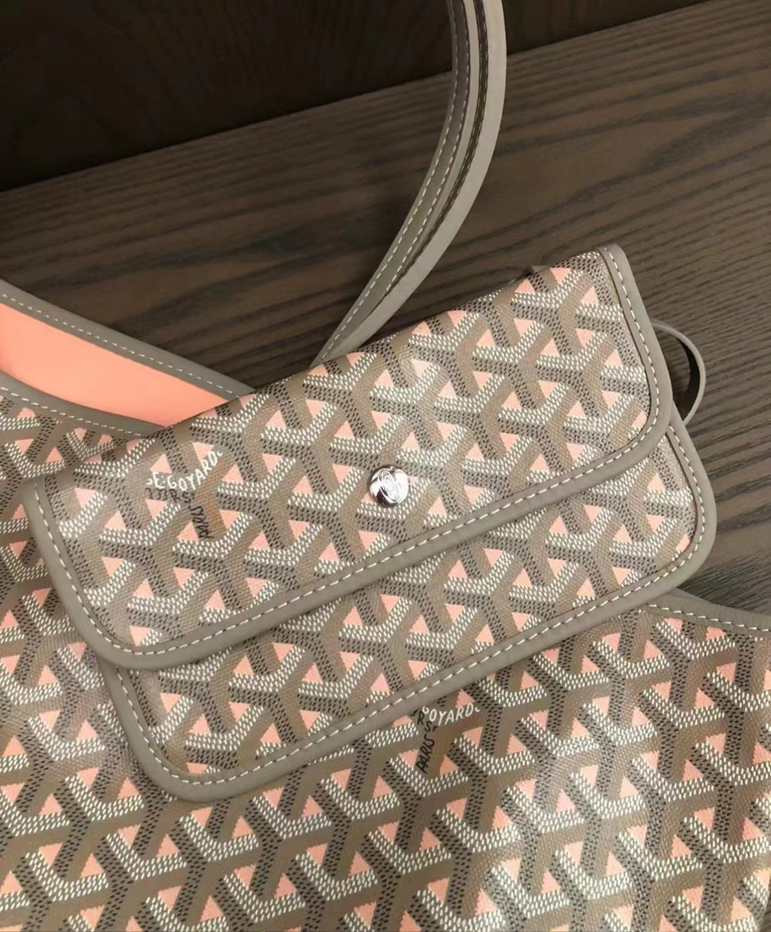 Saint Louis GM bag is offered in limited edition in a new exclusive Goyardine Claire-Voie Grege canvas. The inner coated canvas and distinctive outer triangles are both of the same colour which creates the illusion that one can see through the bag. 3 colours are available: Khaki, Turquoise and Powder Pink. Extremely light and entirely reversible, the Saint Louis GM bag has two leather handles with progressive thickness allowing different ways to wear it. It features a removable inside pocket attached to one of the handles for a quick and easy access to its content.