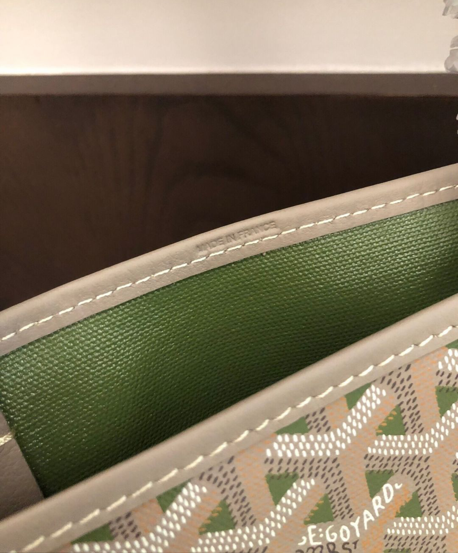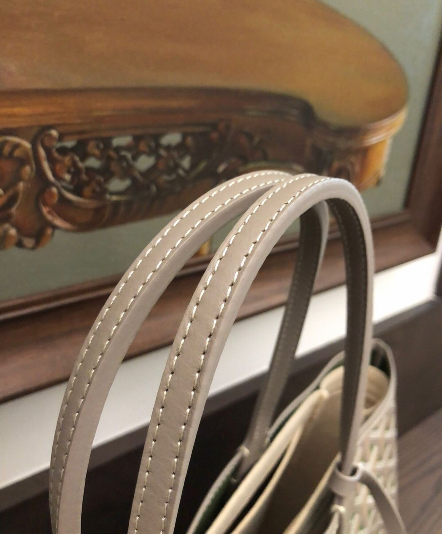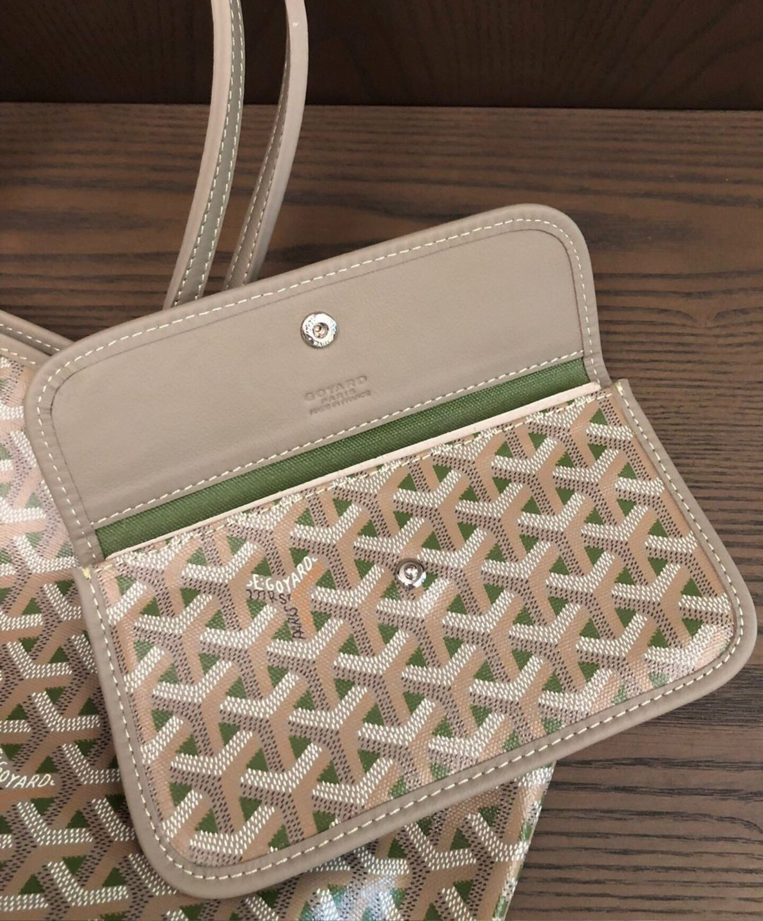 Saint Louis PM bag is offered in limited edition in a new exclusive Goyardine Claire-Voie Grege canvas. The inner coated canvas and distinctive outer triangles are both of the same colour which creates the illusion that one can see through the bag. 3 colours are available: Khaki, Turquoise and Powder Pink. Extremely light and entirely reversible, the Saint Louis PM bag has two leather handles with progressive thickness allowing different ways to wear it. It features a removable inside pocket attached to one of the handles for a quick and easy access to its content.