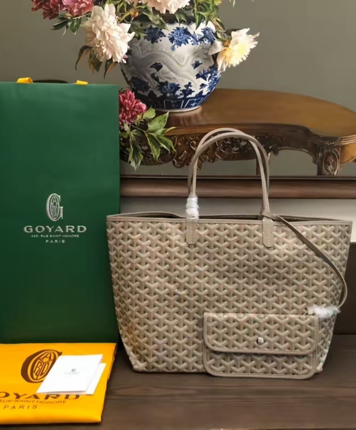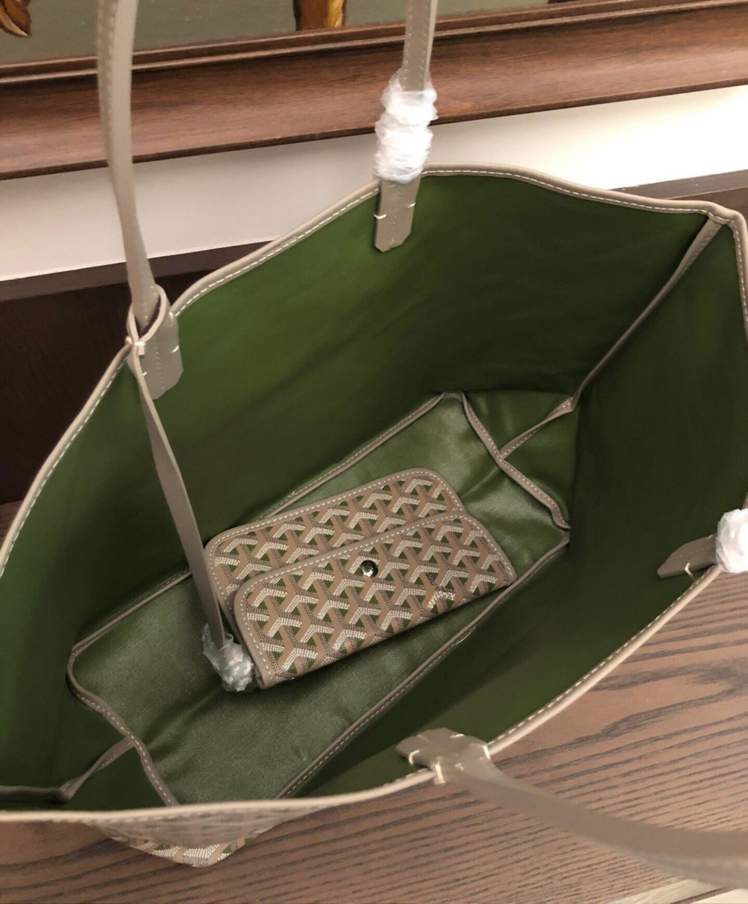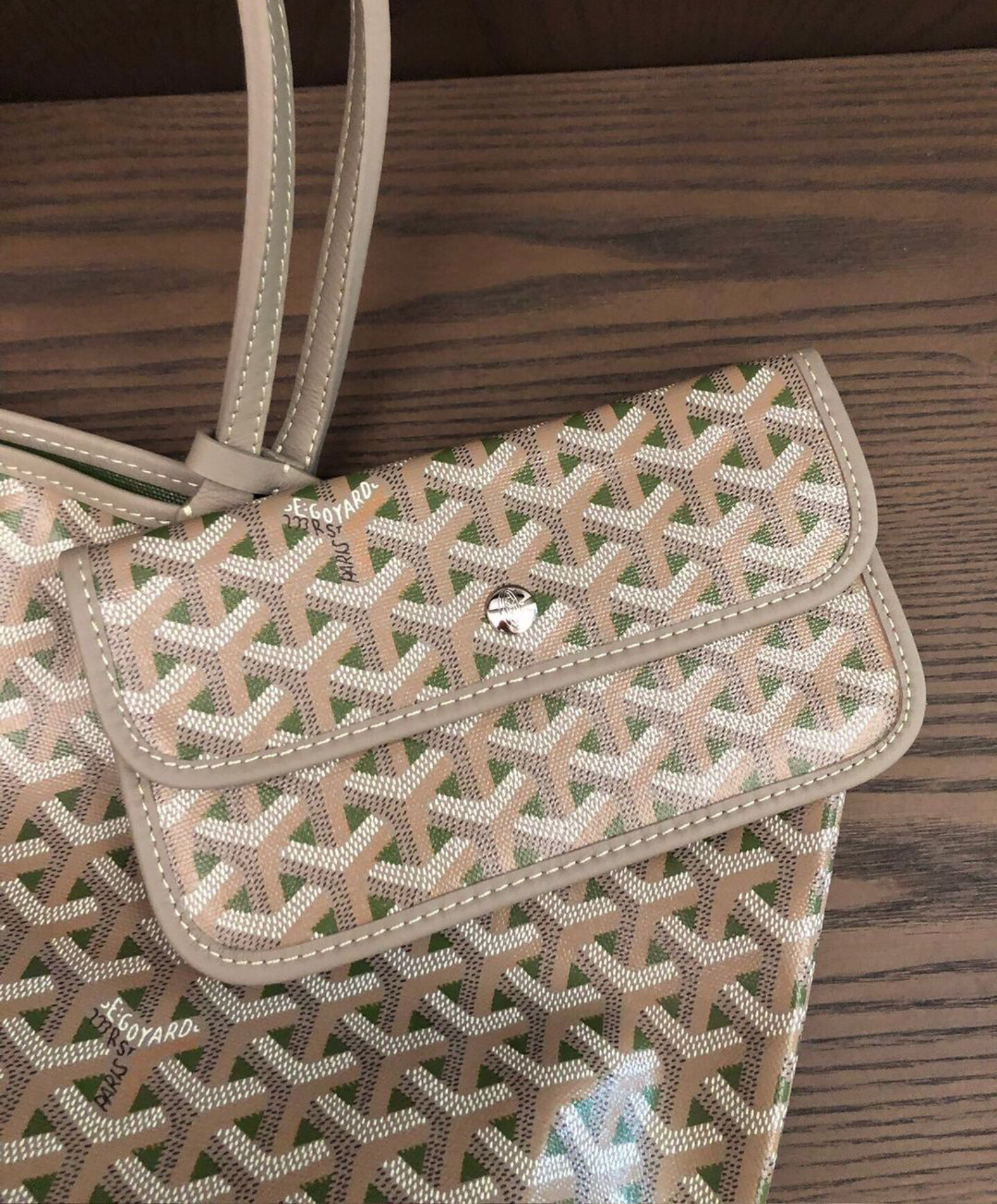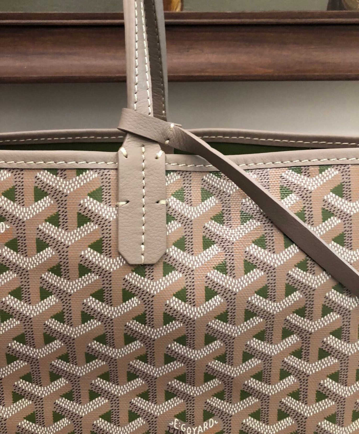 Saint Louis PM bag is offered in limited edition in a new exclusive Goyardine Claire-Voie Grege canvas. The inner coated canvas and distinctive outer triangles are both of the same colour which creates the illusion that one can see through the bag. 3 colours are available: Khaki, Turquoise and Powder Pink. Extremely light and entirely reversible, the Saint Louis PM bag has two leather handles with progressive thickness allowing different ways to wear it. It features a removable inside pocket attached to one of the handles for a quick and easy access to its content.