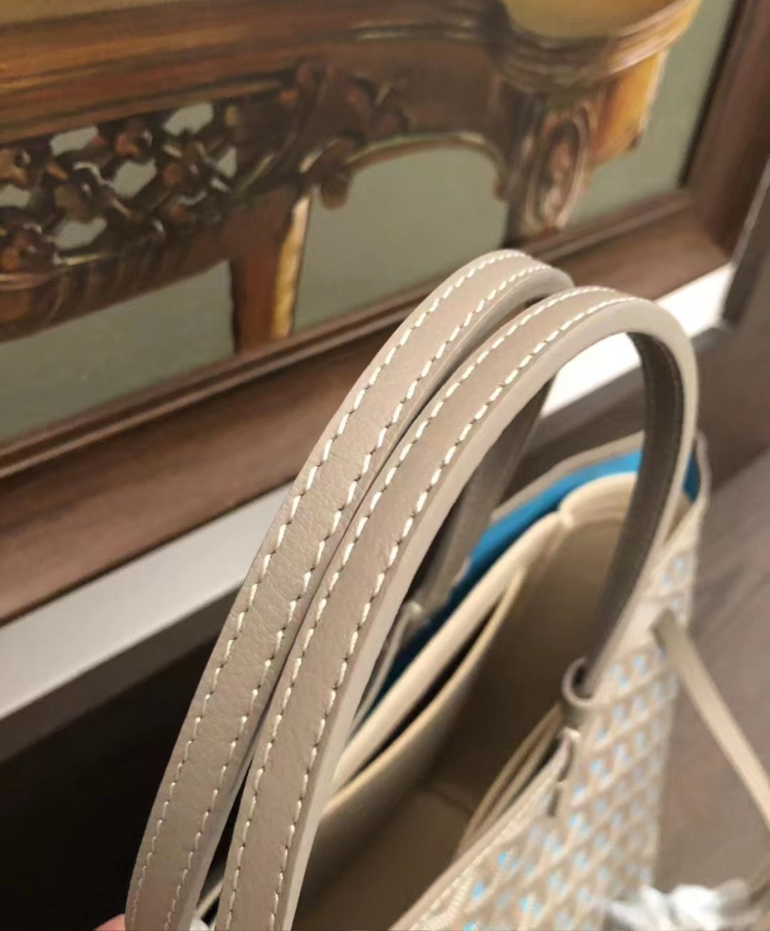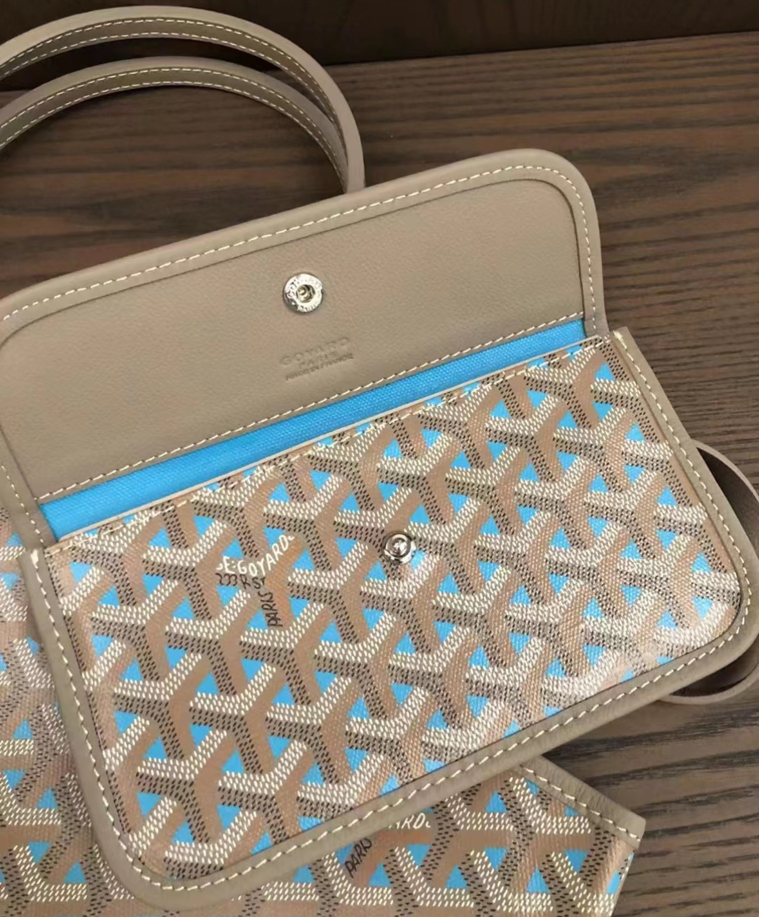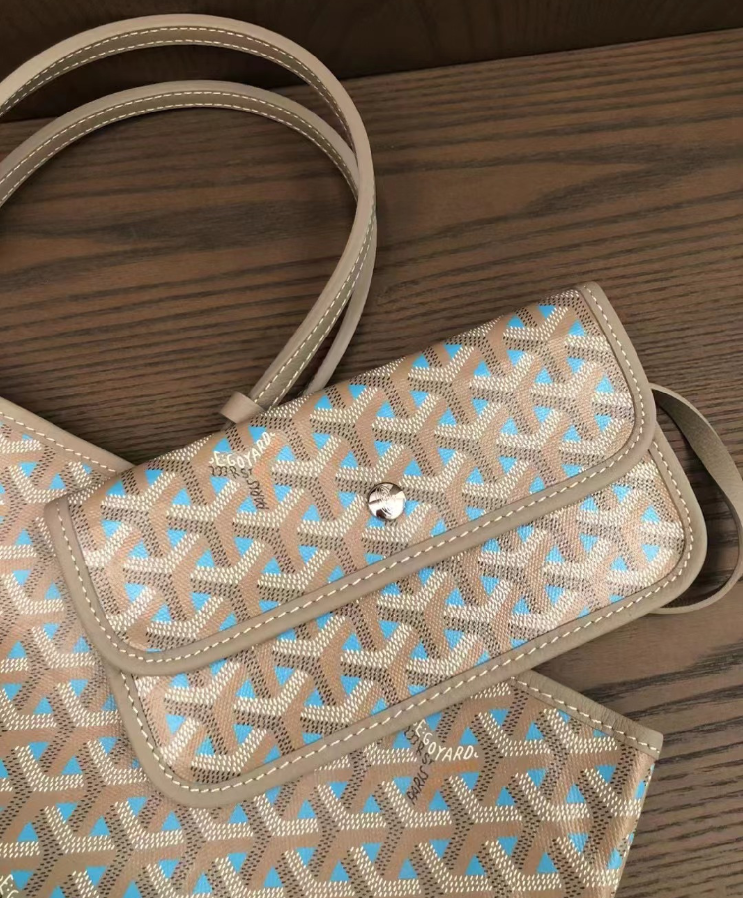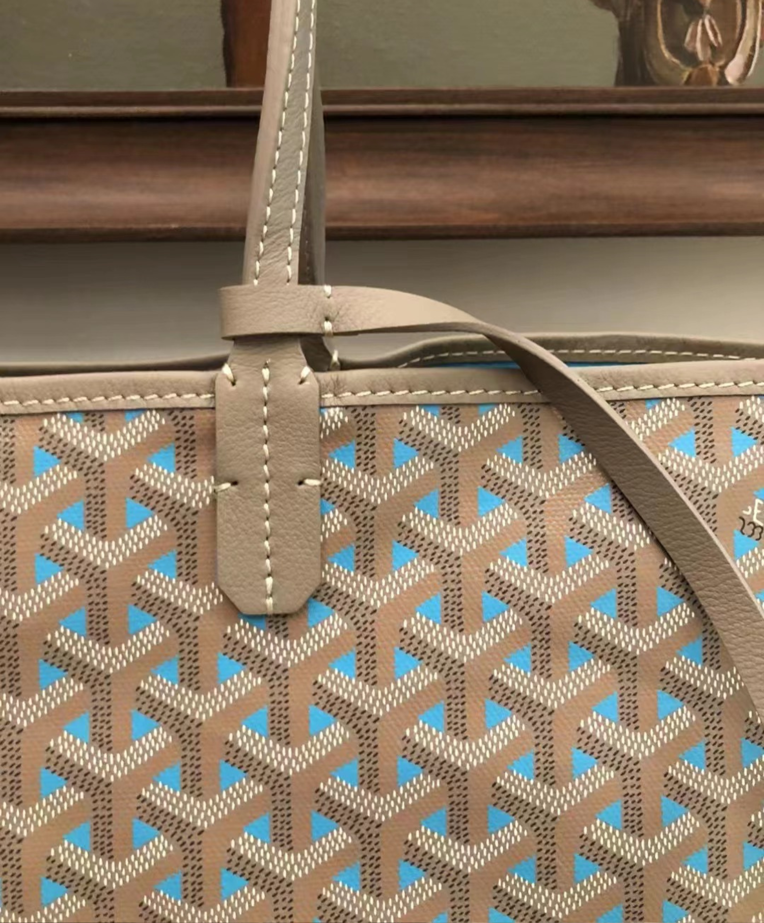 Saint Louis PM bag is offered in limited edition in a new exclusive Goyardine Claire-Voie Grege canvas. The inner coated canvas and distinctive outer triangles are both of the same colour which creates the illusion that one can see through the bag. 3 colours are available: Khaki, Turquoise and Powder Pink. Extremely light and entirely reversible, the Saint Louis PM bag has two leather handles with progressive thickness allowing different ways to wear it. It features a removable inside pocket attached to one of the handles for a quick and easy access to its content.