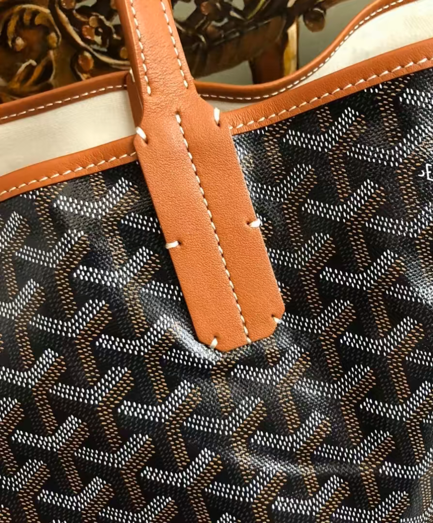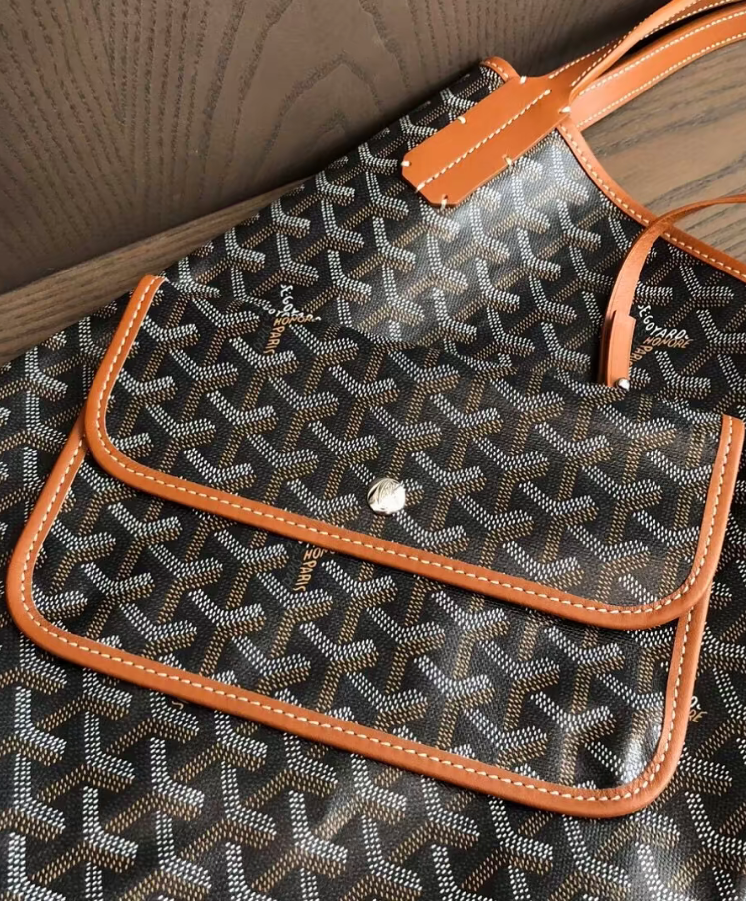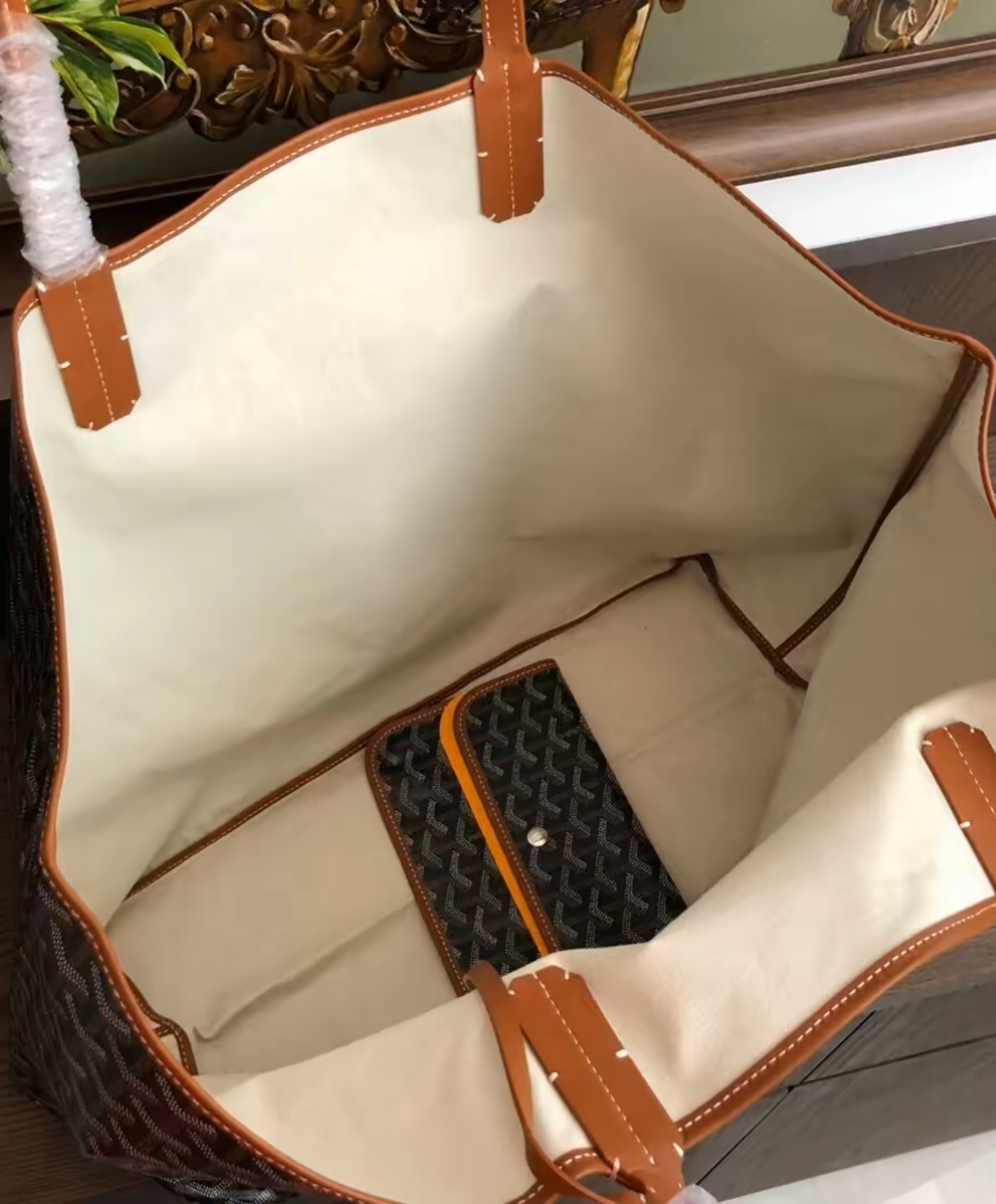 The Saint Louis GM bag is made from Goyardine and is unlined. It is extremely light and completely reversible. Wear it showing the Goyardine fabric or inside out, showing the linen and cotton mix. Its two leather handles with their progressive thickness mean it can be worn in different ways. It has a removable inside pocket attached to one of the handles for quick and easy access.