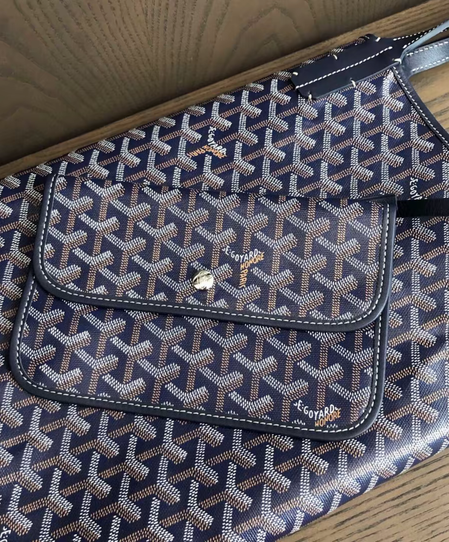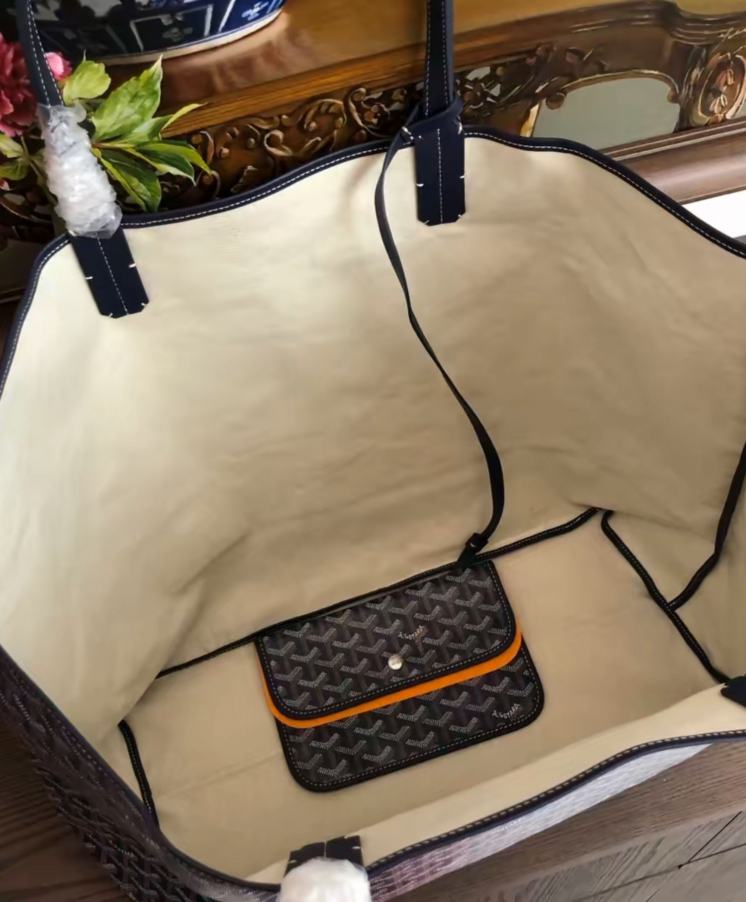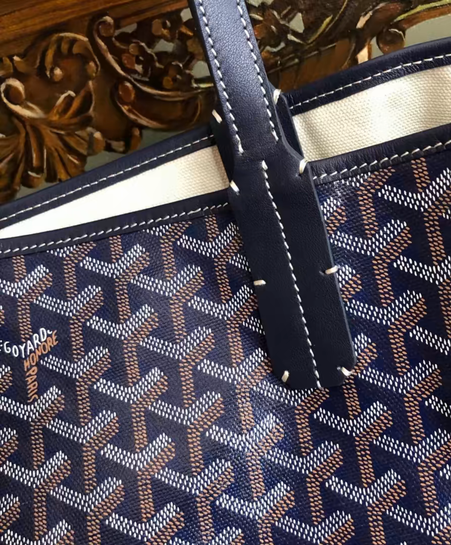 The Saint Louis GM bag is made from Goyardine and is unlined. It is extremely light and completely reversible. Wear it showing the Goyardine fabric or inside out, showing the linen and cotton mix. Its two leather handles with their progressive thickness mean it can be worn in different ways. It has a removable inside pocket attached to one of the handles for quick and easy access.