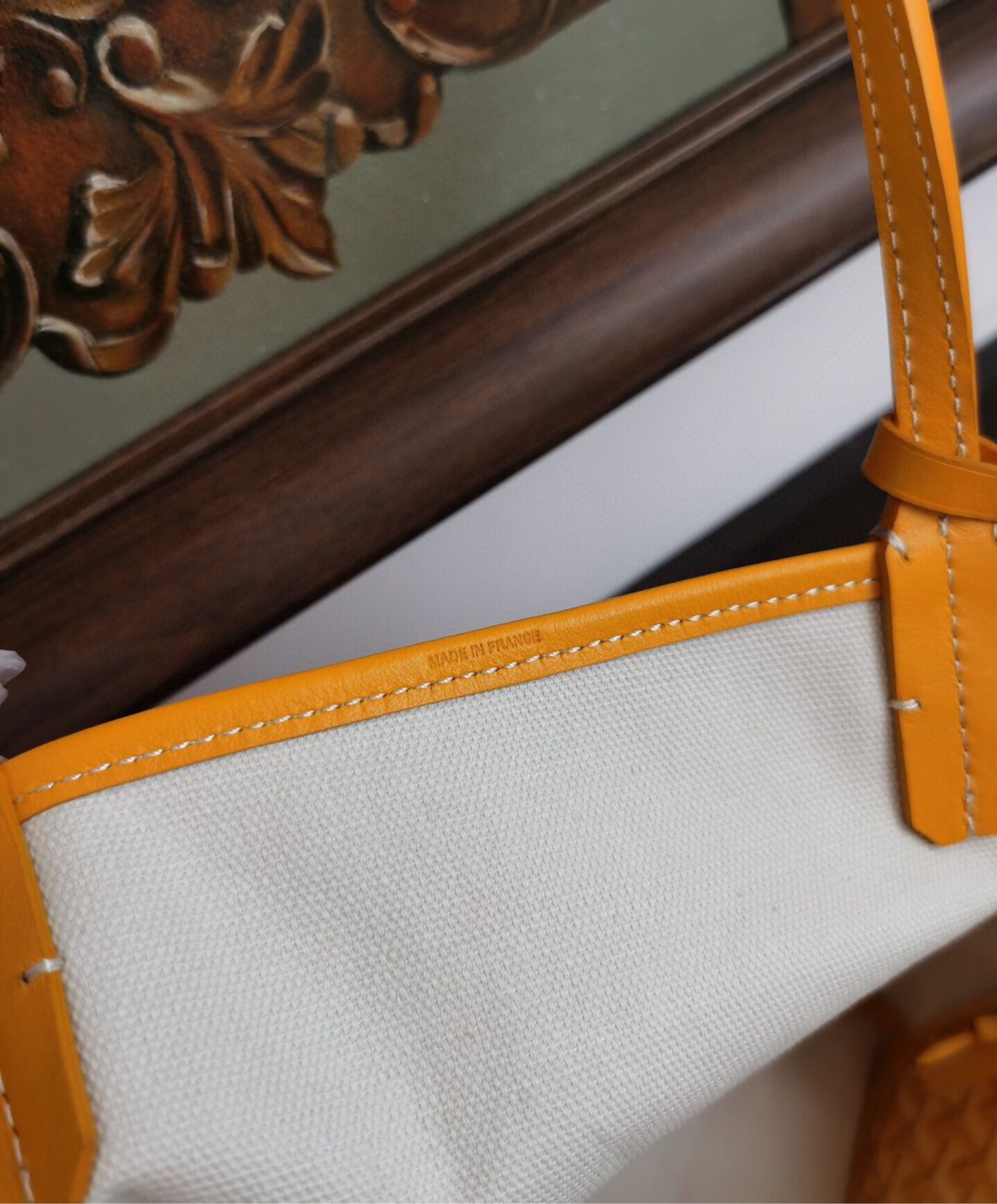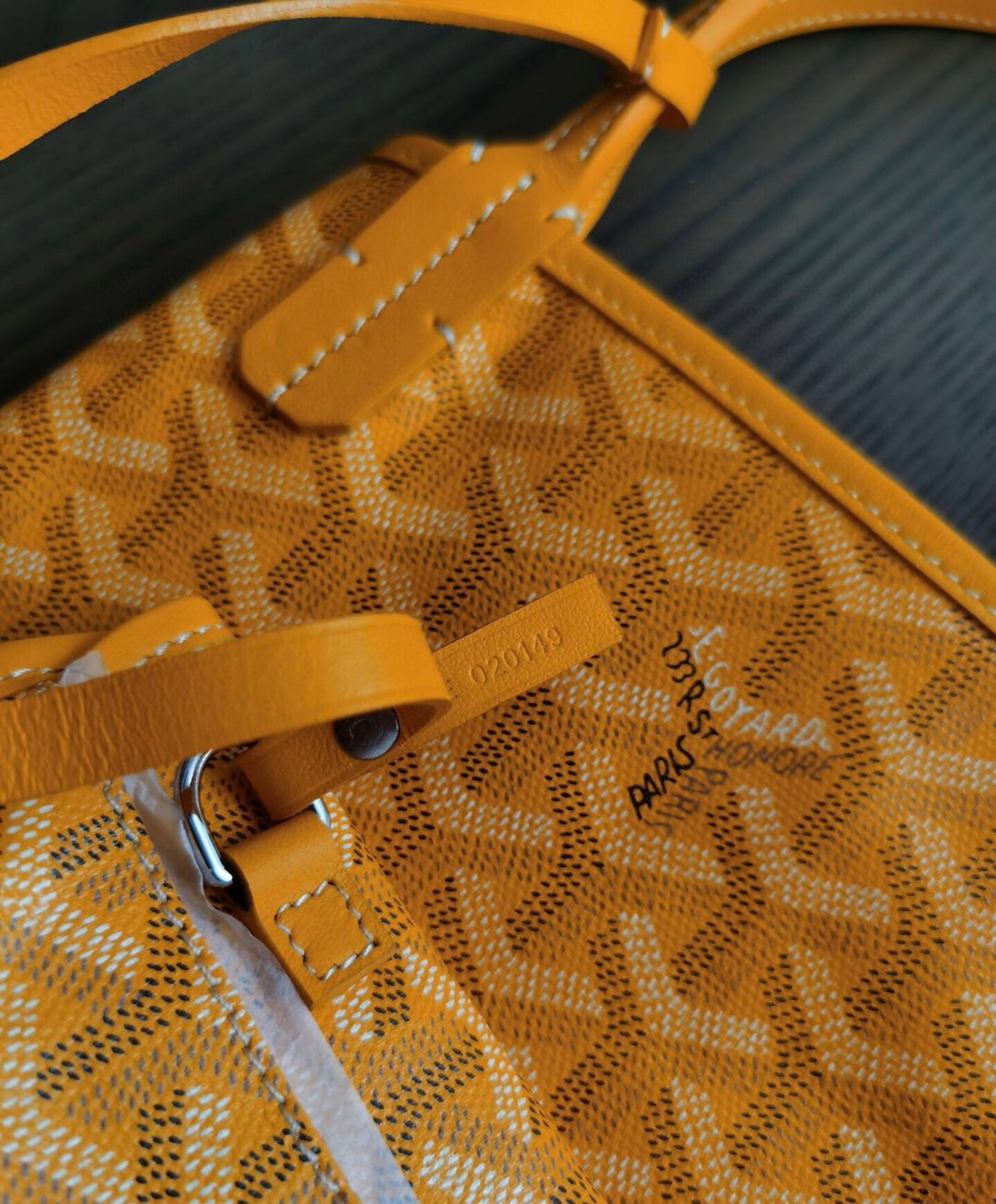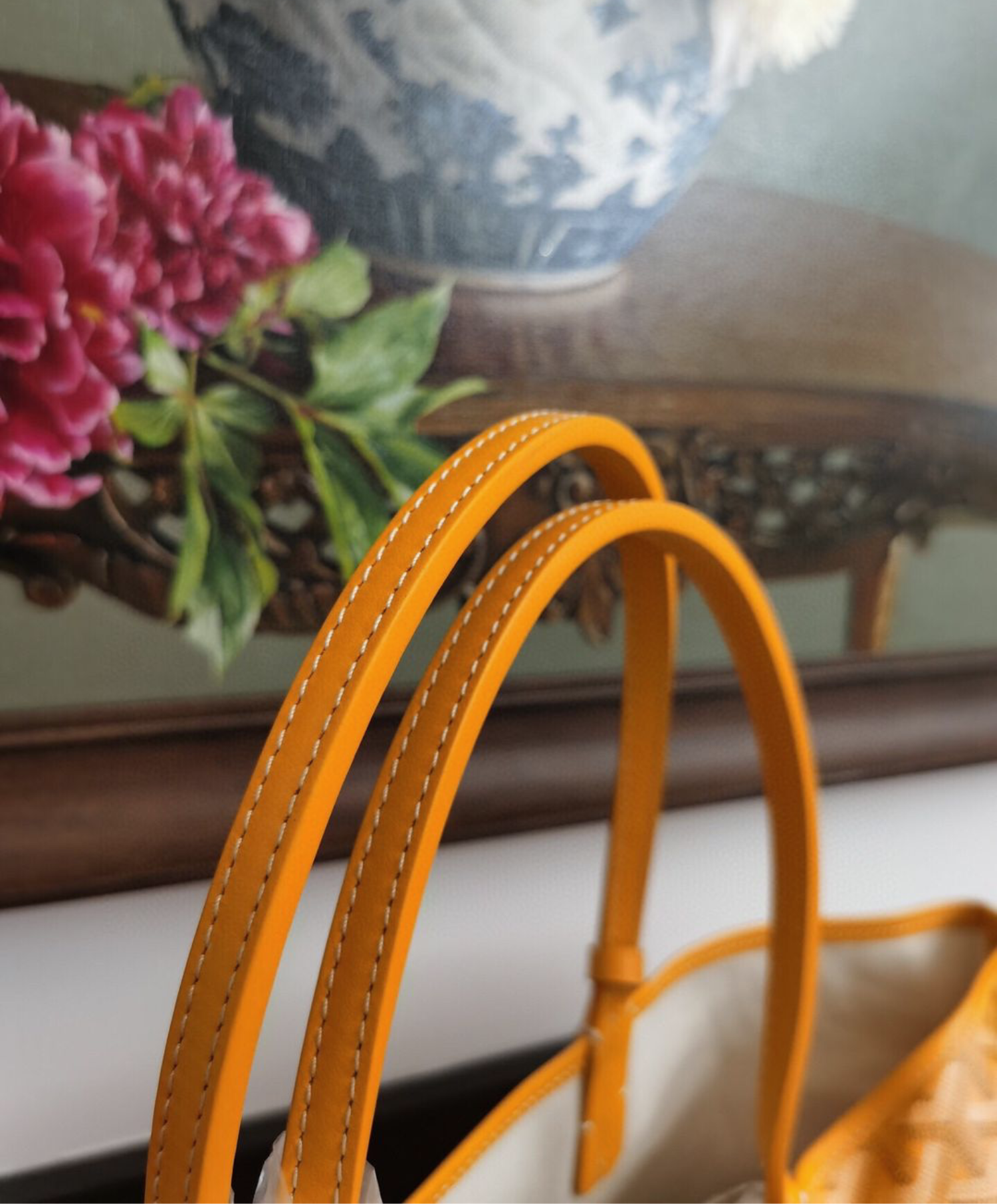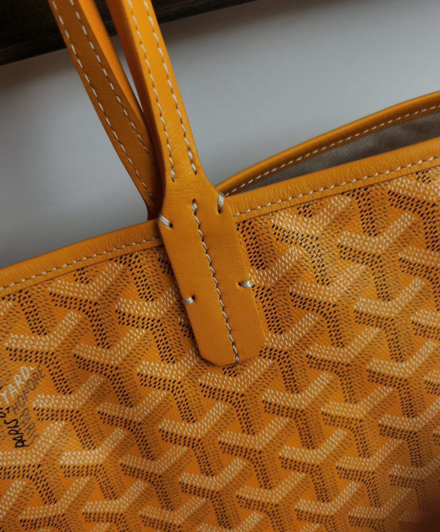 The Saint Louis PM bag is made from Goyardine and is unlined. It is extremely light and completely reversible. Wear it showing the Goyardine fabric or inside out, showing the linen and cotton mix. Its two leather handles with their progressive thickness mean it can be worn in different ways. It has a removable inside pocket attached to one of the handles for quick and easy access.