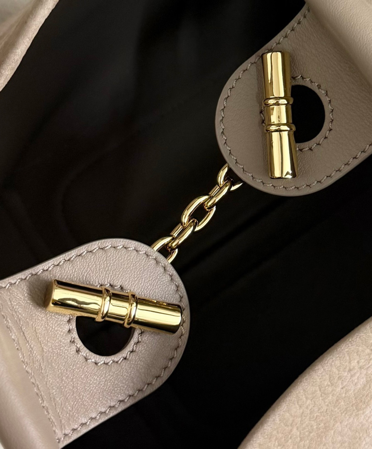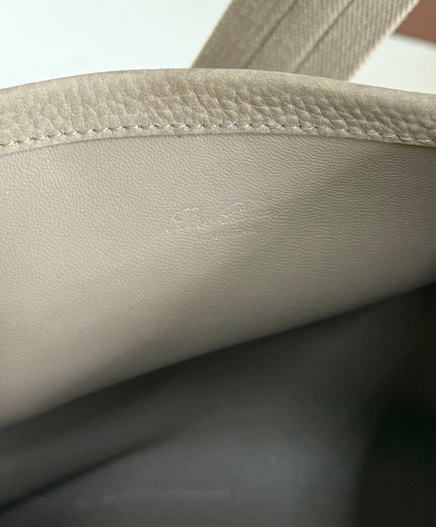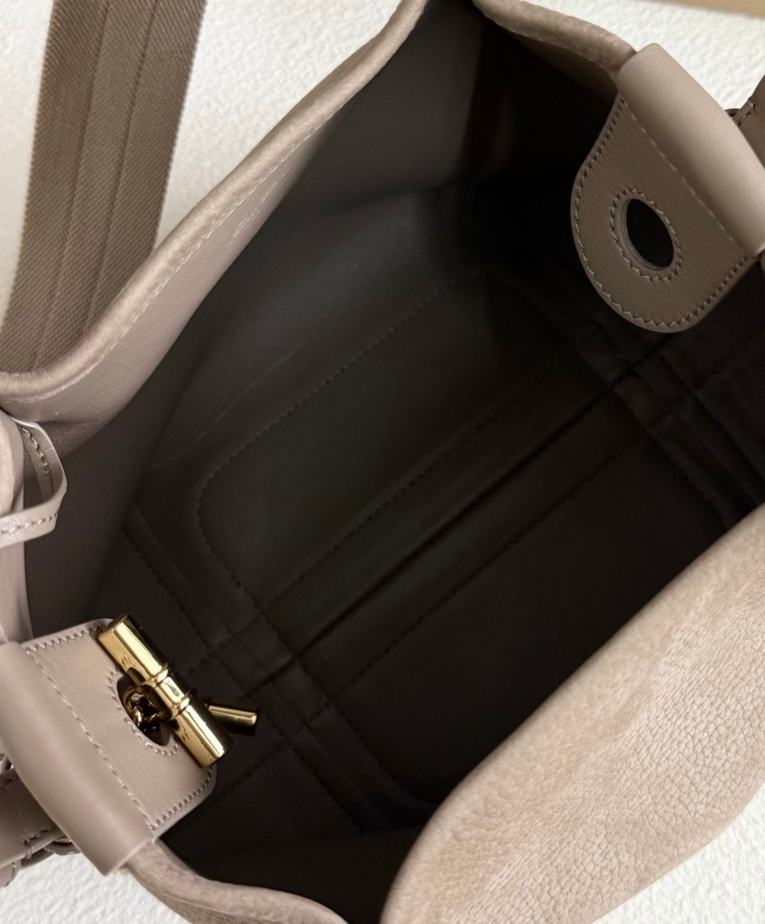 The Bale, a sophisticated bucket bag in small size with handstiched handles, inspired by Loro Piana’s textile heritage. Its silhouette, touch, and feel recall the cashmere bales, large bundles of the raw precious material. With a seamless design and unique lightness, the Bale bag is a celebration of supple softness and encapsulates the savoir-faire of the Maison. Effortless and casual, it is ideal for carrying all daily essentials with ease. The bag can be carried by hand or crossbody thanks to its removable strap.