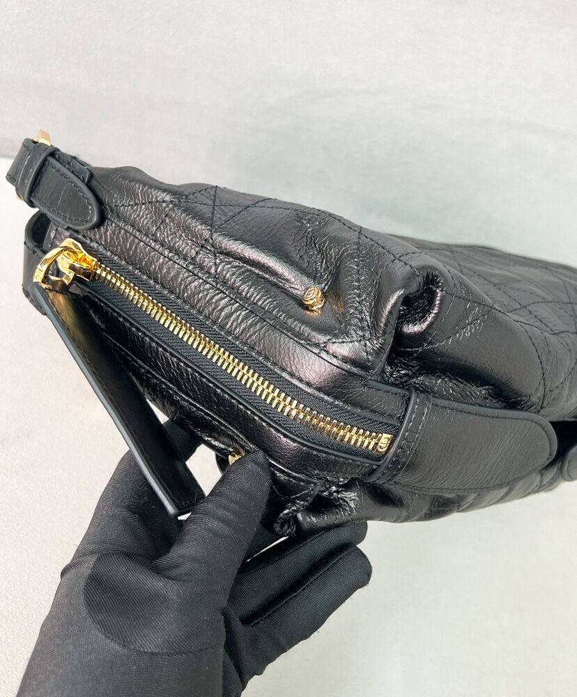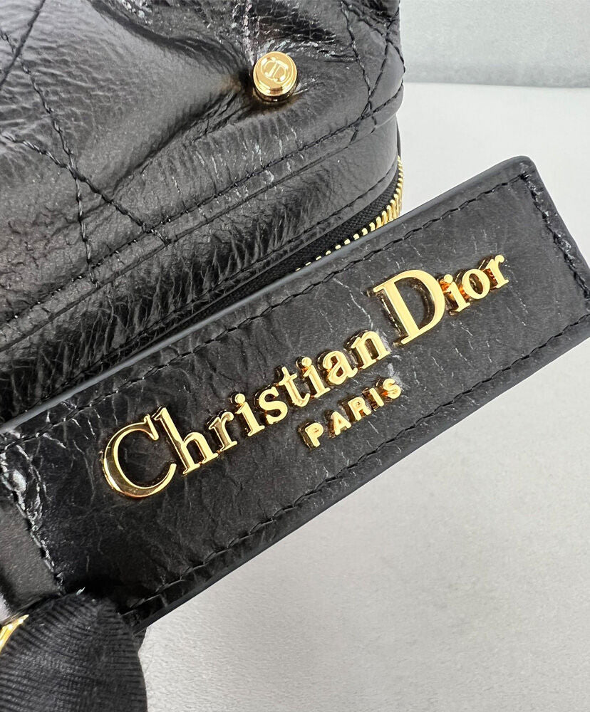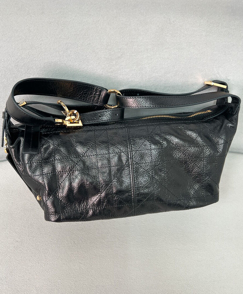 New for the season and presented at the Spring-Summer 2025 Ready-to-Wear Fashion Show, the D-Journey bag offers a new take on the hobo silhouette with a modern supple design. The style is crafted in black shiny goatskin with Flat Macrocannage topstitching in an interpretation of the House's iconic motif. The main compartment is completed by a zip pocket, while two decorative side pockets showcase a large leather pull with the Christian Dior Paris signature. Featuring adjustable leather top handles and a leather strap, the small D-Journey bag can be carried by hand, worn over the shoulder or crossbody as a daily companion.