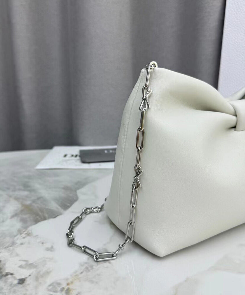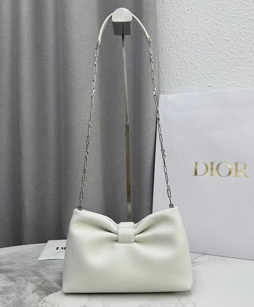 Jonathan Anderson's new Dior Bow Bag embodies French elegance and the craftsmanship of the ateliers. The supple construction in luxurious natural grain lambskin with a semi-gloss finish honors the bow, a cherished House symbol. The small design can be worn over the shoulder or carried by hand as a clutch.
