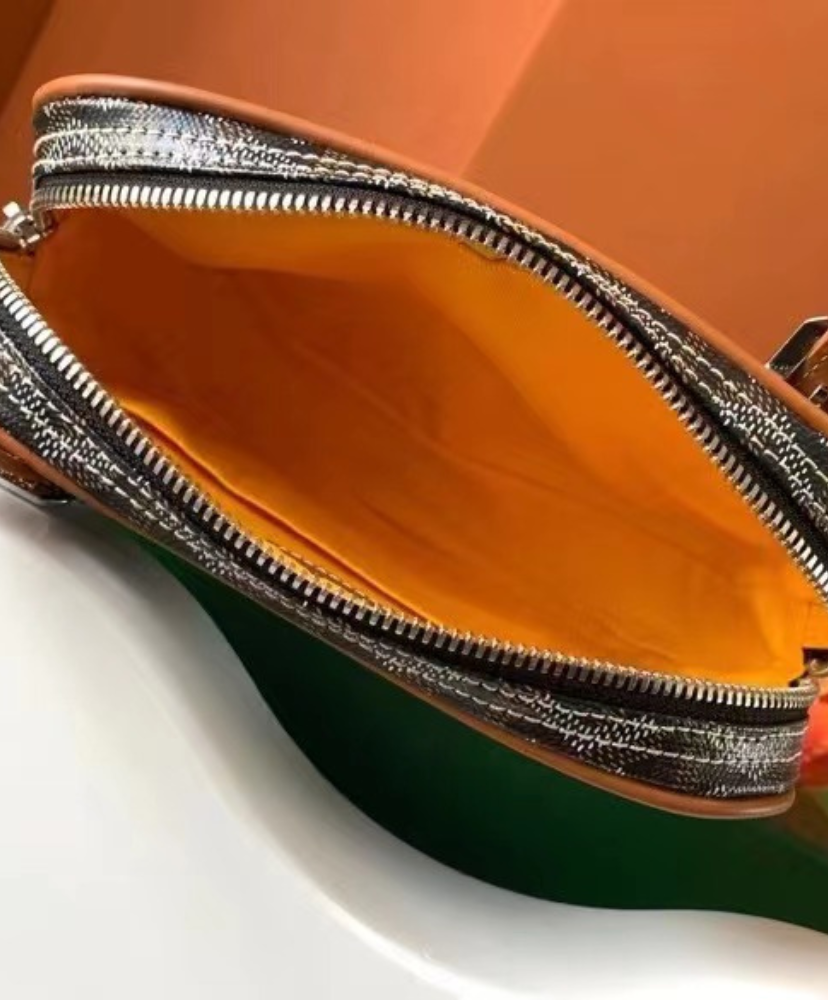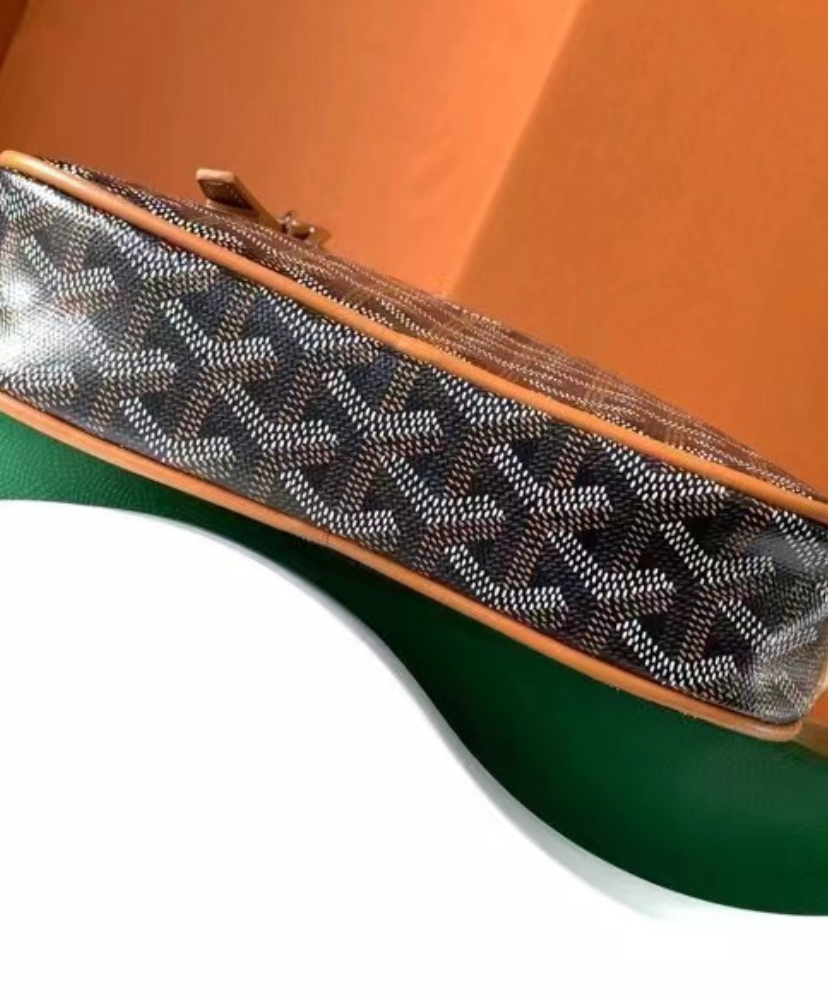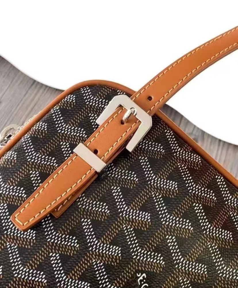 This playful, bag from Goyard is apt for casual outings. Crafted in self printed canvas, the bag features top zip closure, leather trimmings, and a adjustable leather shoulder strap placed beautifully at one side of the front, supported by buckle closure. The bright canvas interior houses one open pocket and is accustomed to take care of your tiny little belongings.