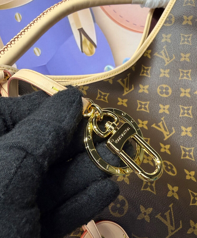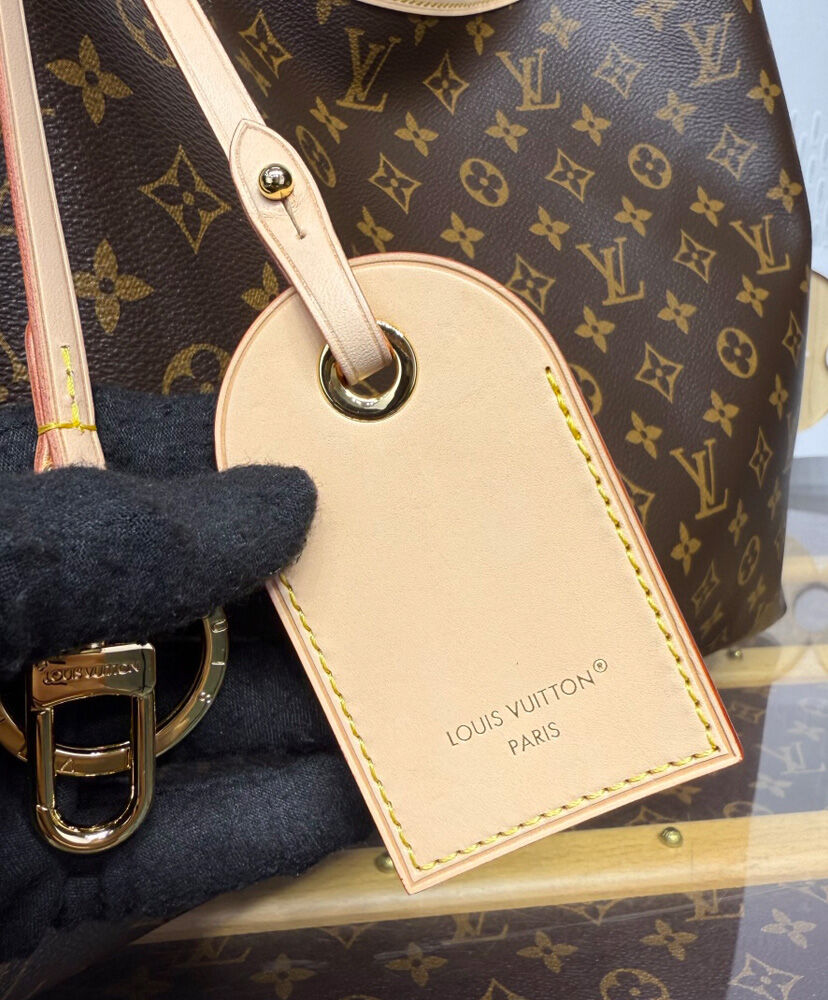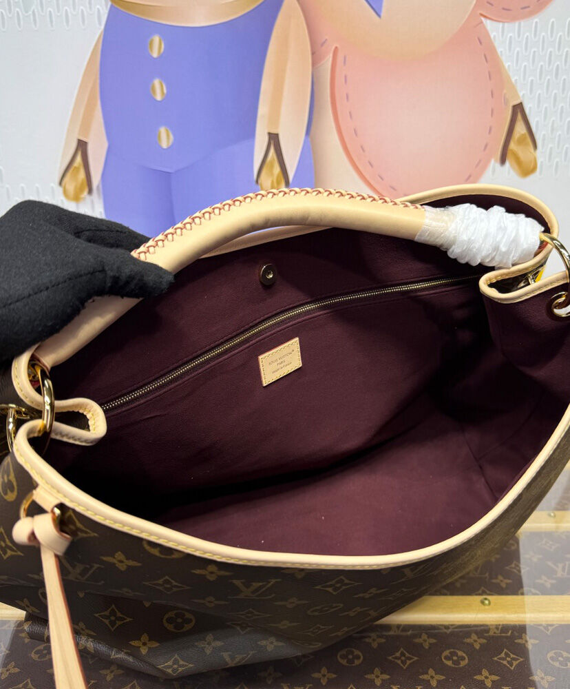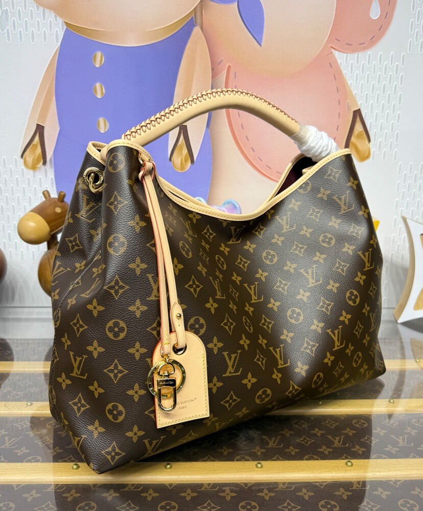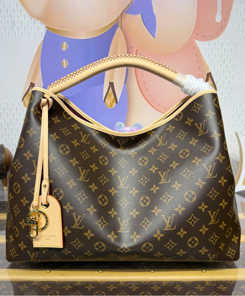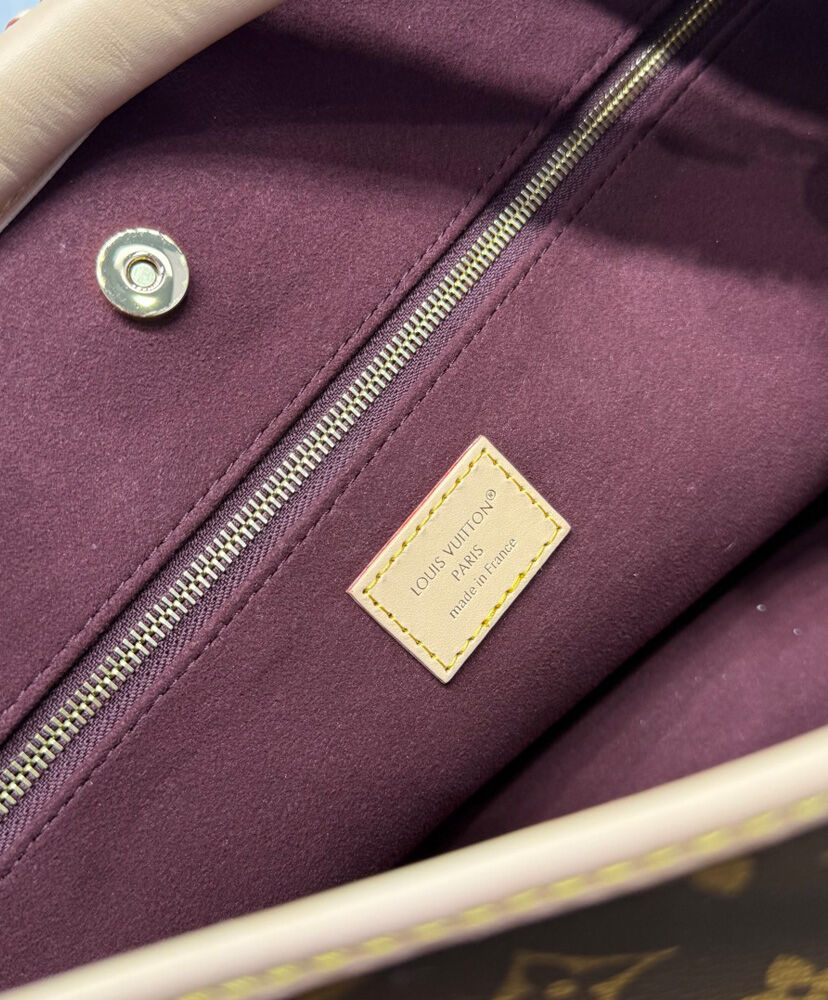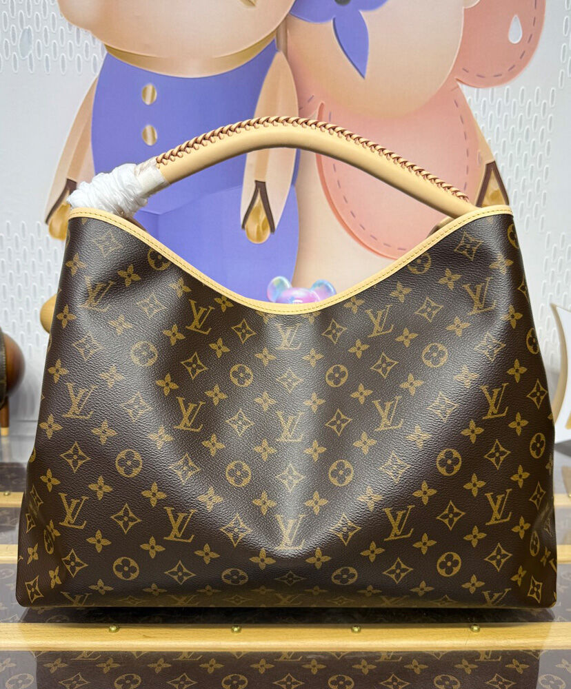 Introducing the Again handbag, a fresh interpretation of the iconic Artsy design that first launched in 2010, now more supple, more iconic, and more meticulously crafted. This edition is rooted in LV DNA, paying tribute to the House’s savoir-faire with a classic Monogram canvas base, a hand-braided handle, and a customizable name tag. It is generously sized to store a laptop and opens to reveal several pockets. The gold-tone hook can be used to attach playful charms.