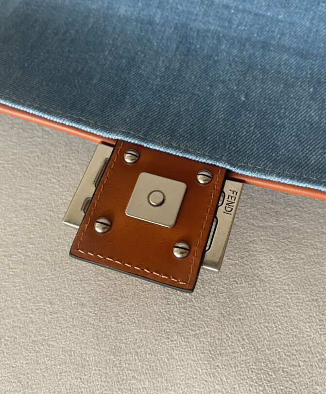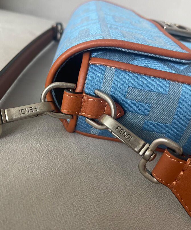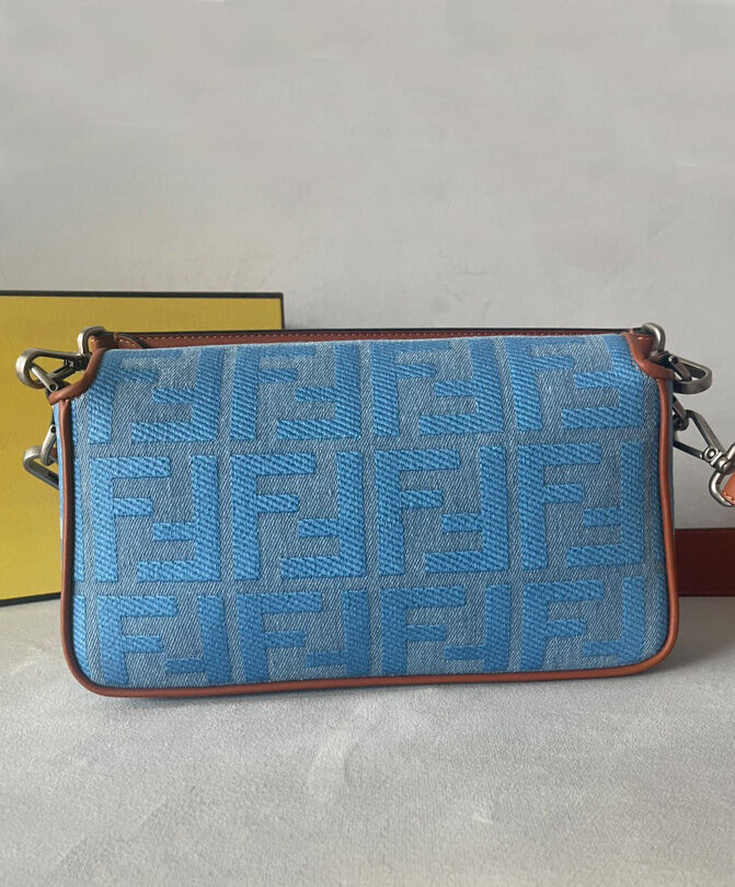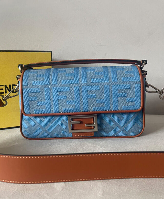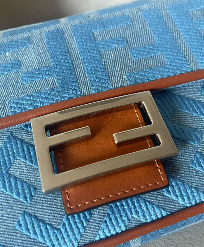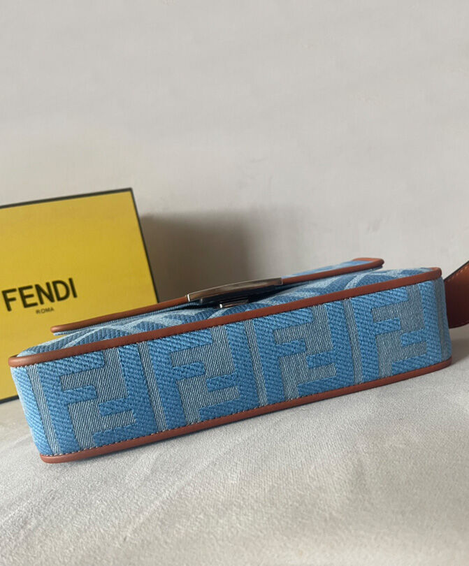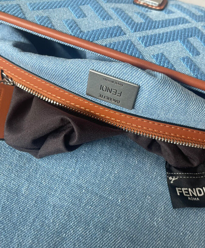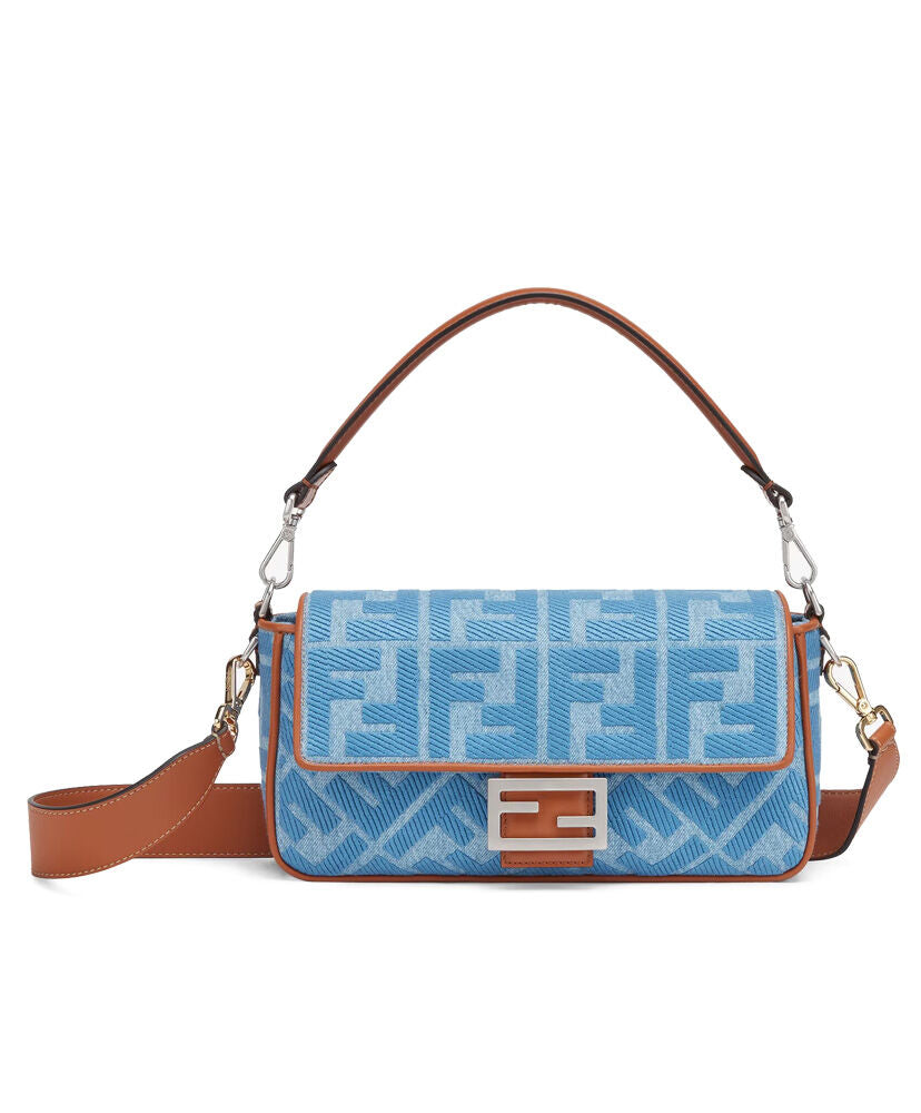 Iconic medium Baguette bag made of light blue denim with a raised tone-on-tone embroidered FF motif. Finished with a brown leather trim and embellished with an FF clasp.