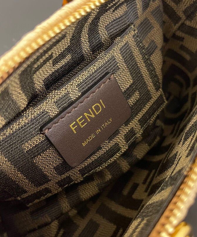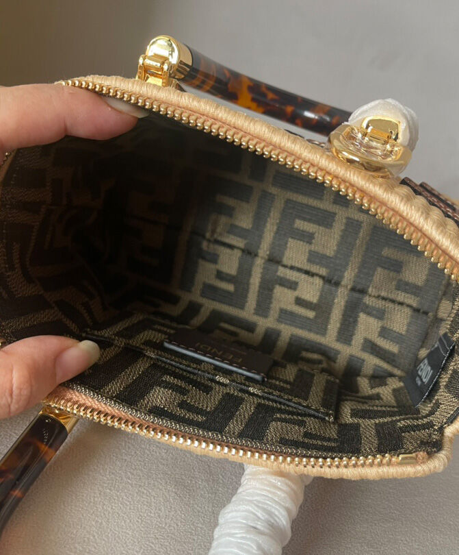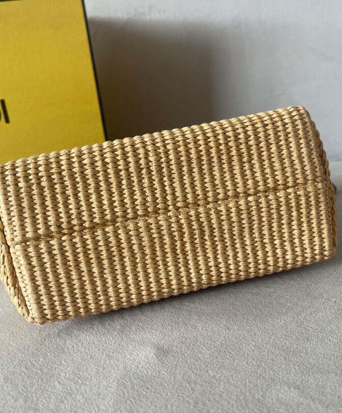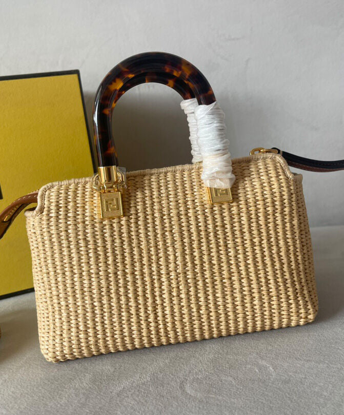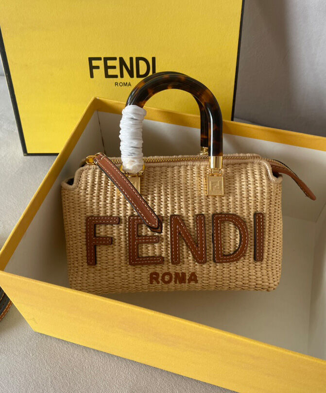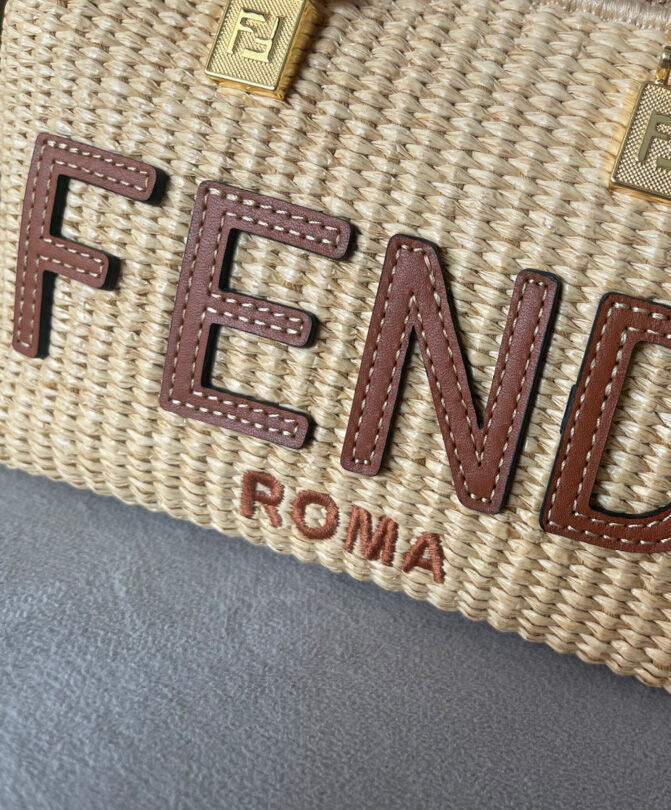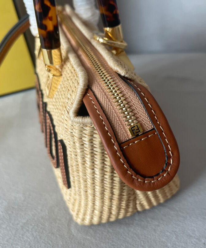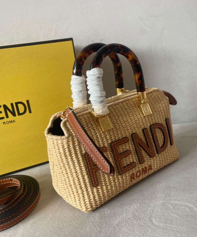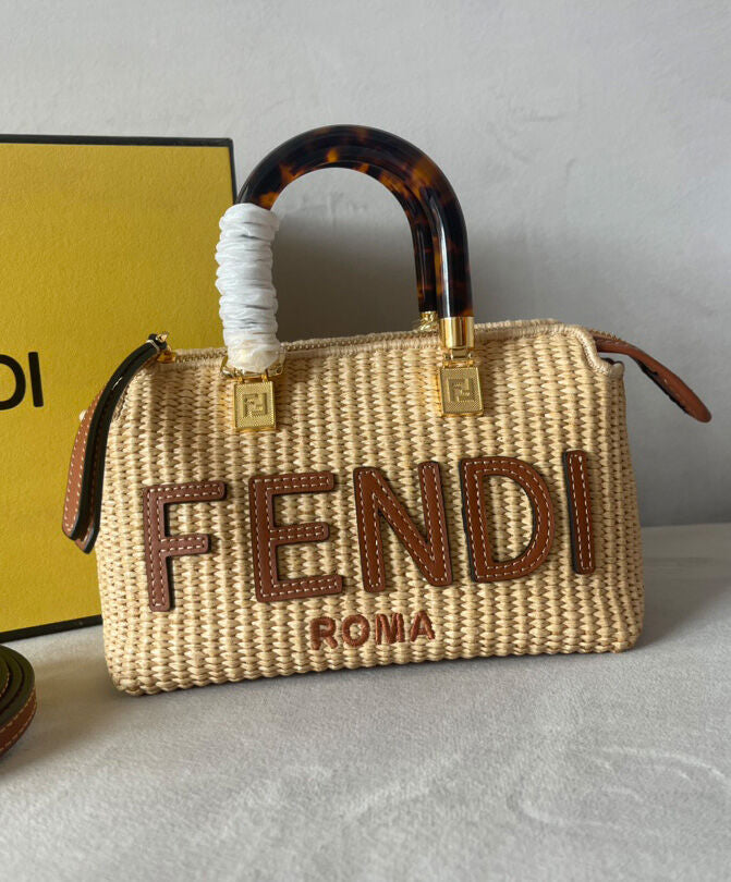 Iconic mini By The Way Boston bag, made of natural-coloured straw woven in a moss-stitch effect with the FENDI ROMA lettering in brown leather. Stiff tortoiseshell-effect plexiglass handles. Zip fastening.