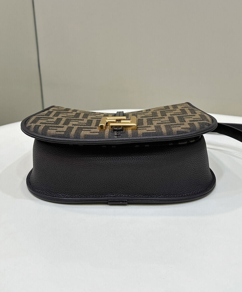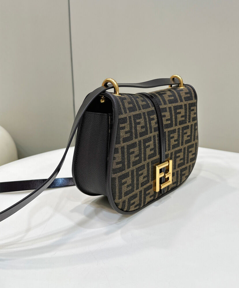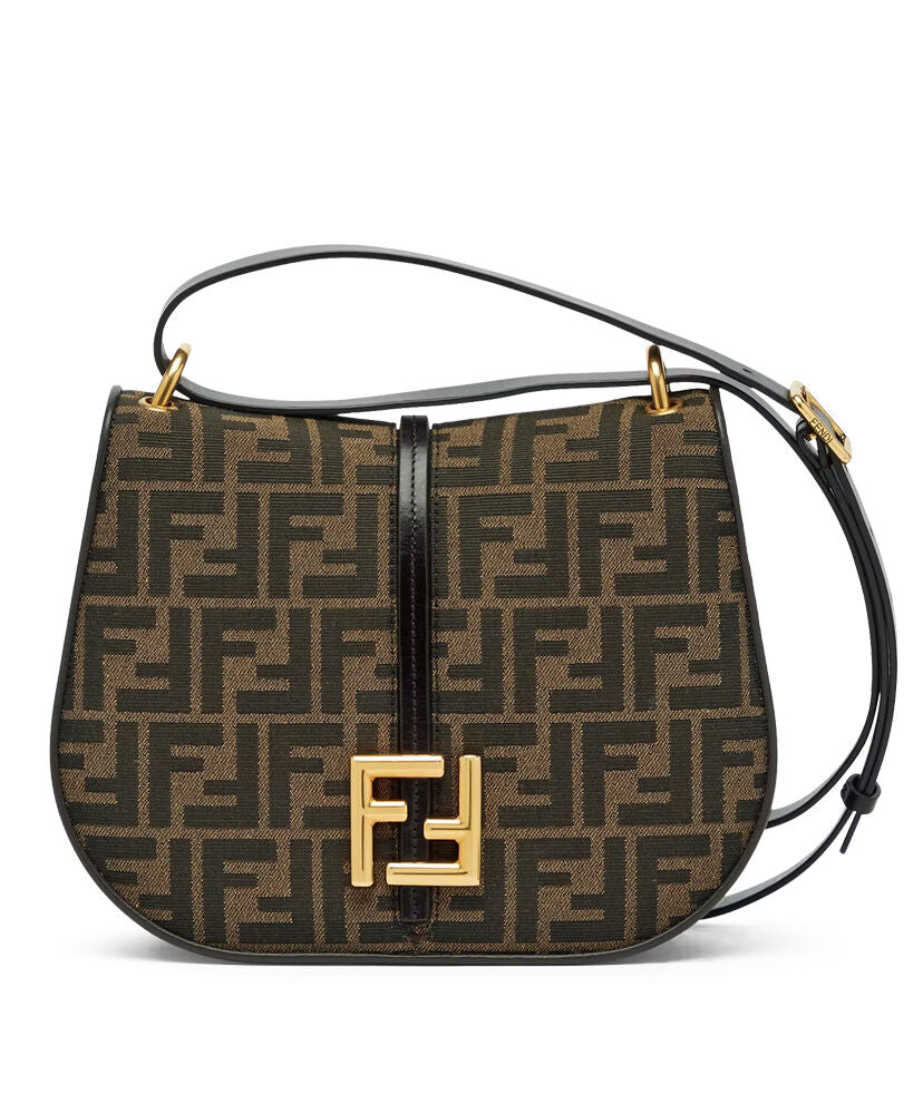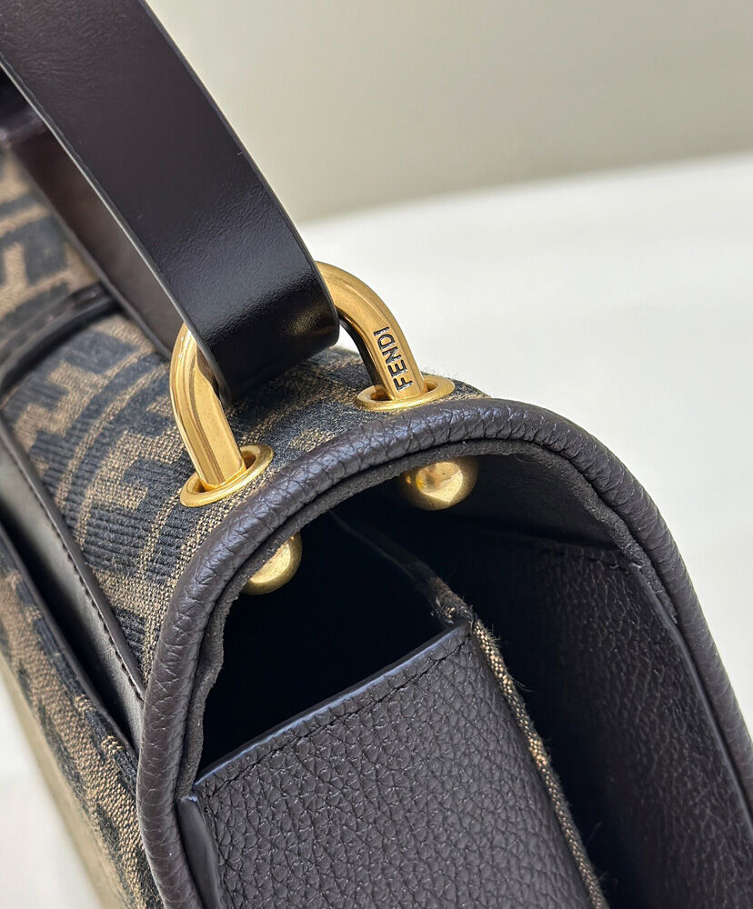 Medium satchel bag with curved, feminine lines, elongated flap and back made of fabric with an FF jacquard motif. The sides and the embossed accents are made of smooth dark brown leather.