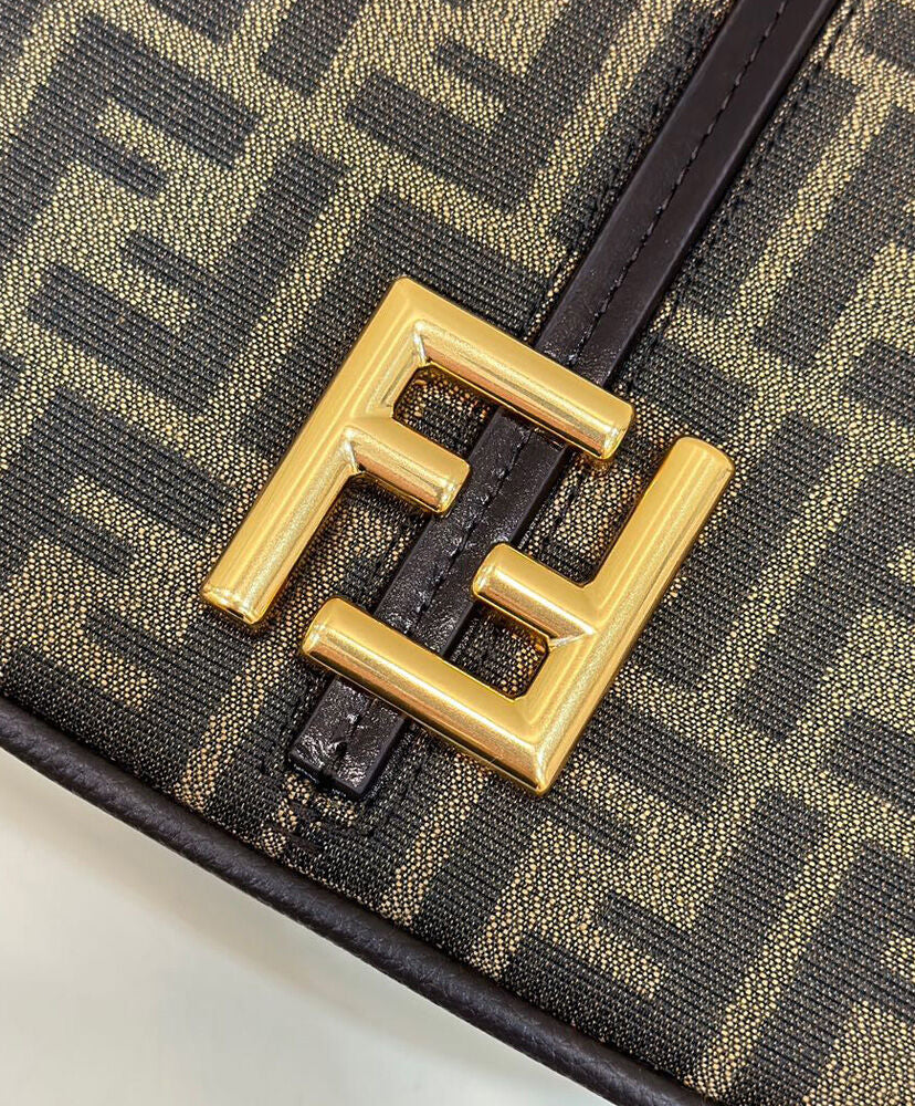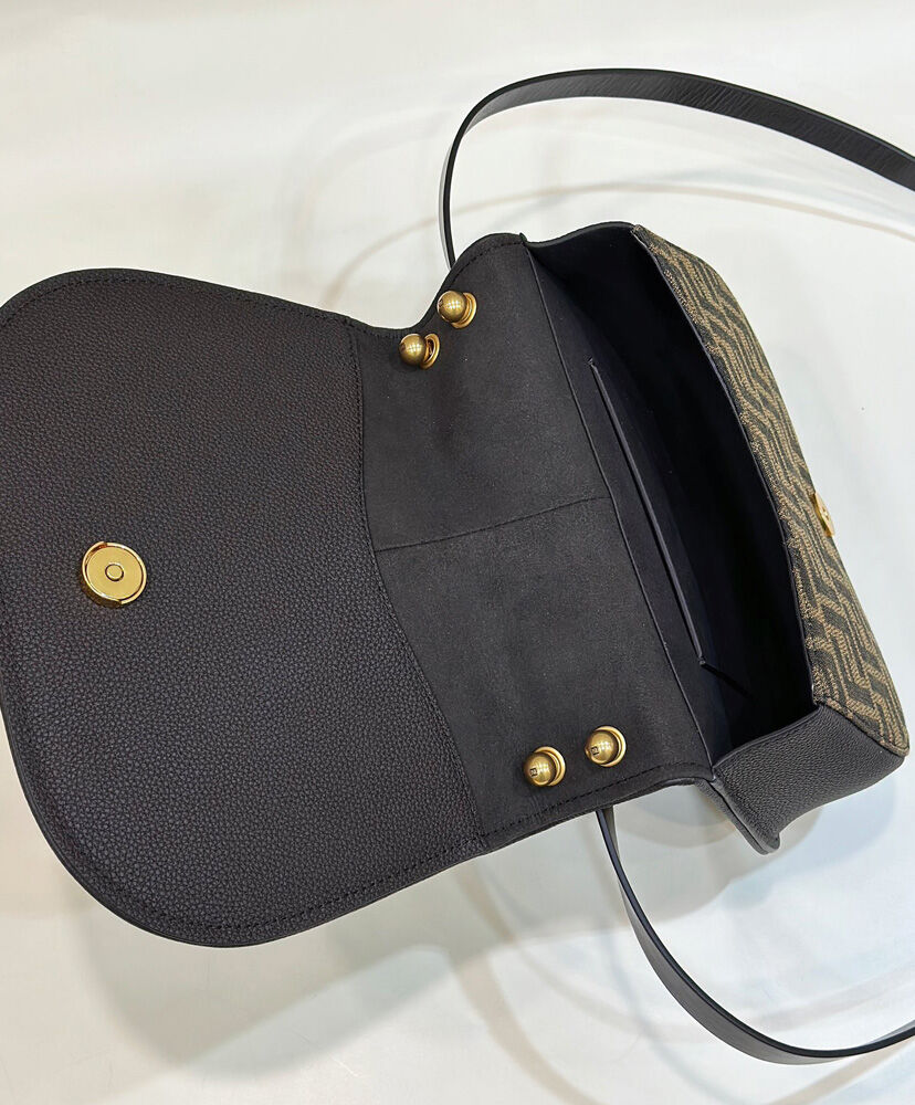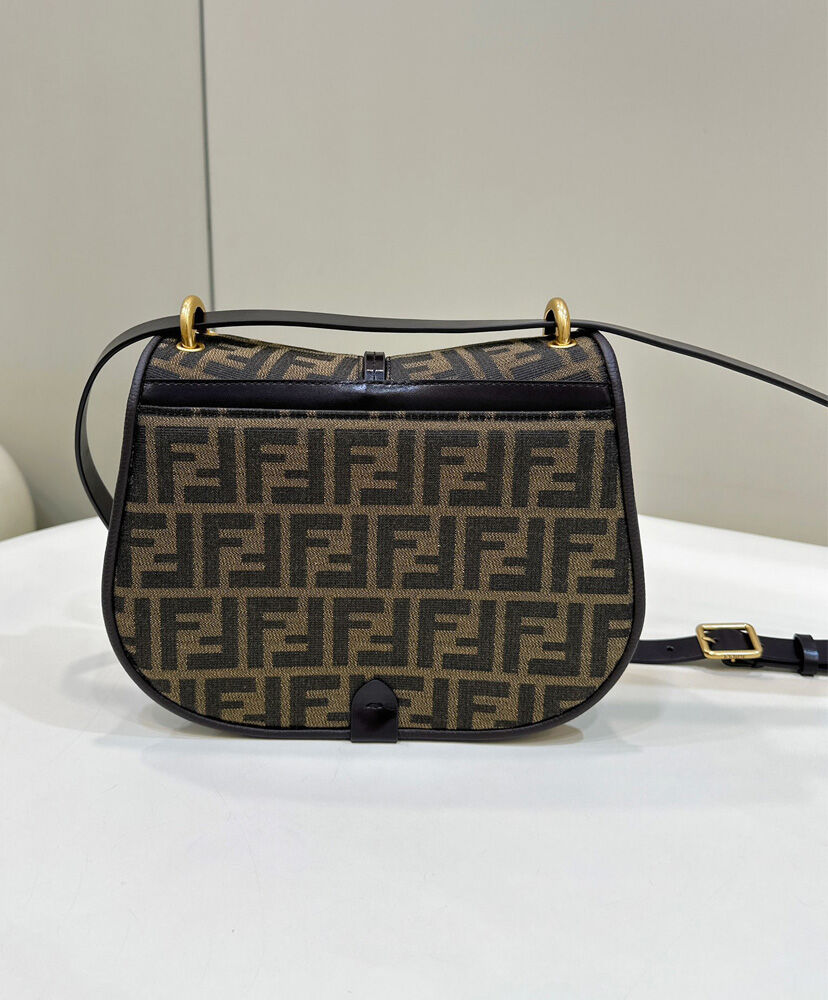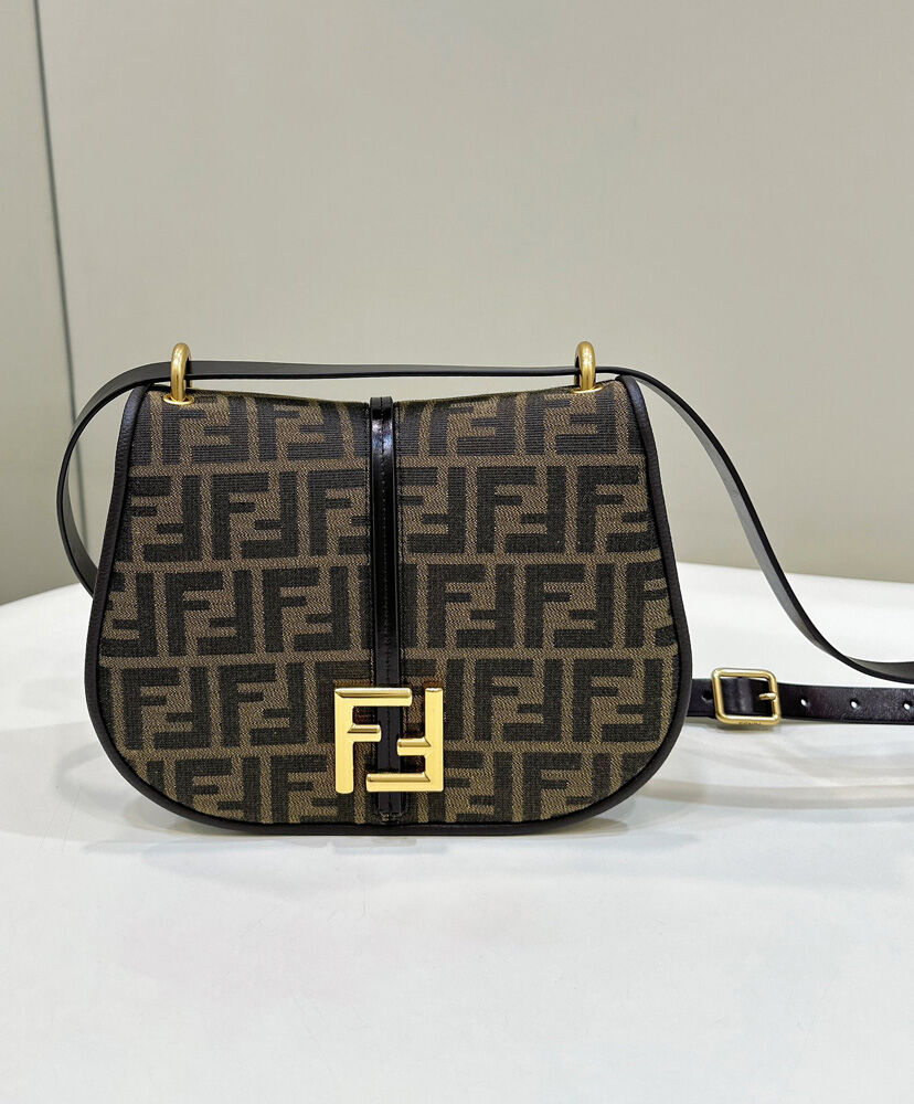Medium satchel bag with curved, feminine lines, elongated flap and back made of fabric with an FF jacquard motif. The sides and the embossed accents are made of smooth dark brown leather.