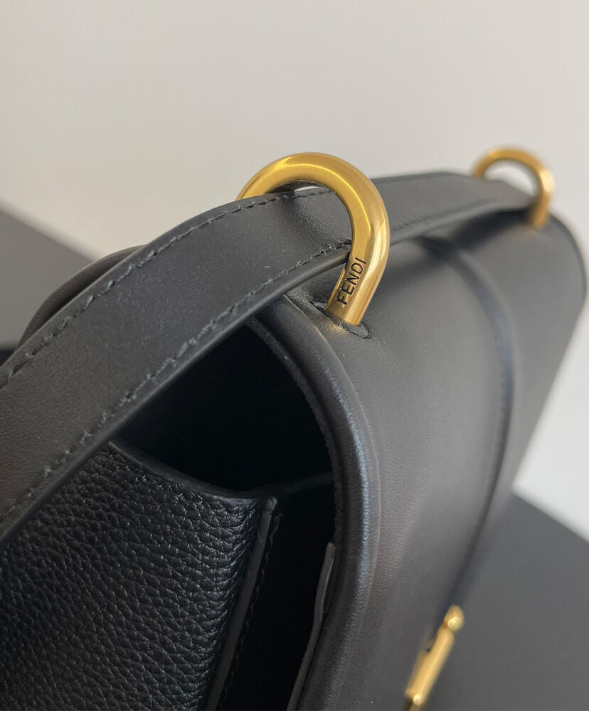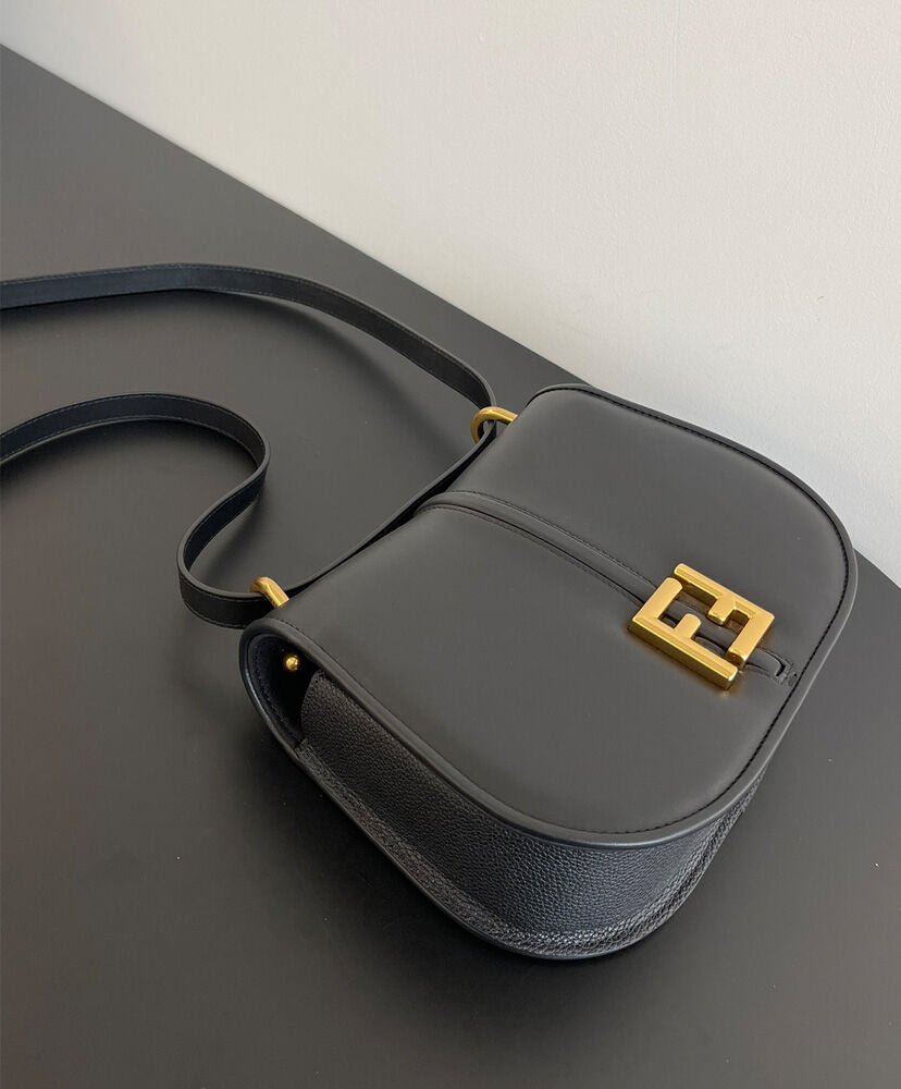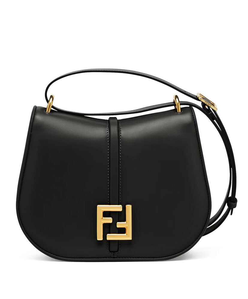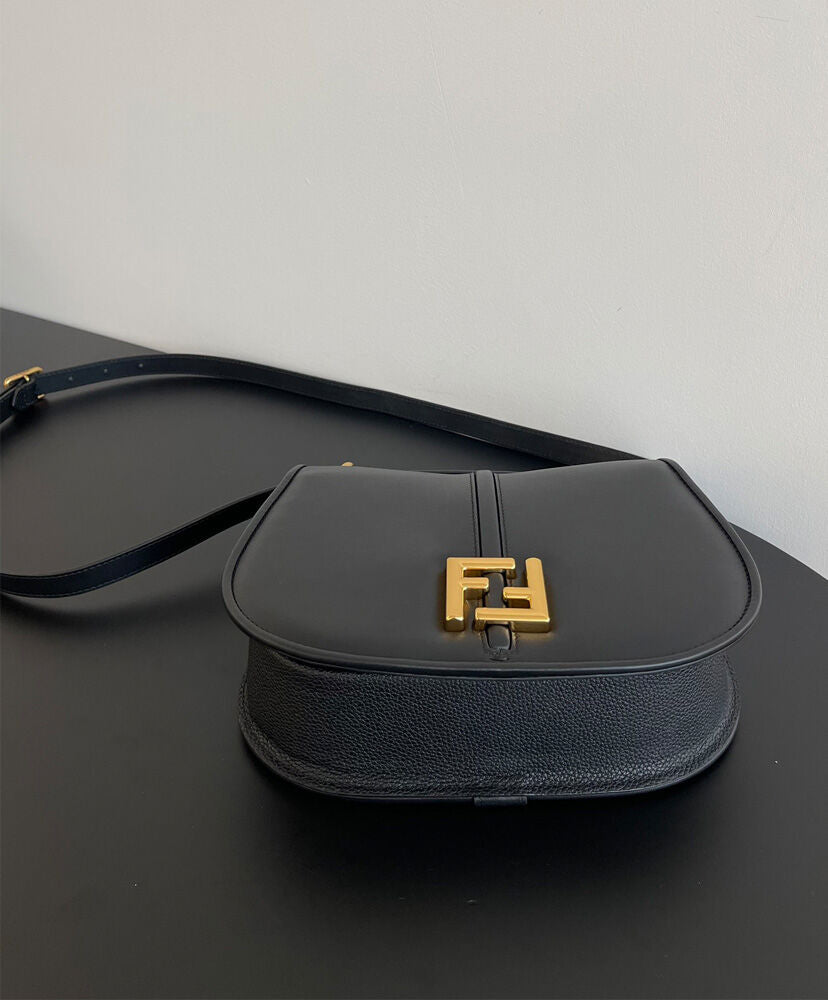 Medium satchel bag with curved, feminine lines and an elongated flap embellished with a metal FF logo. Made of smooth black leather with embossed edges and details. The sides of the bag are made from tone-on-tone full-grain leather.