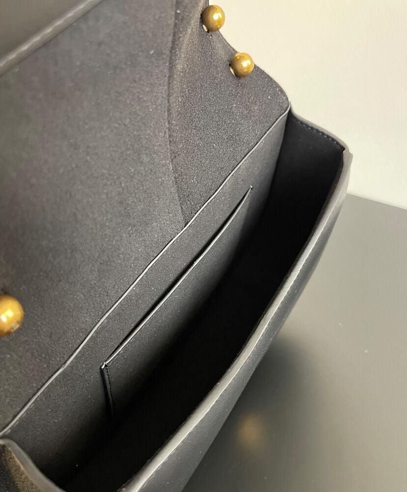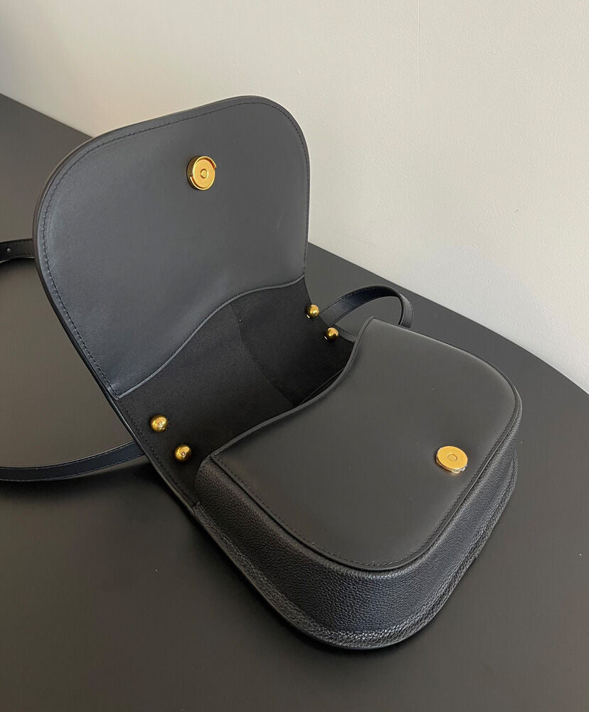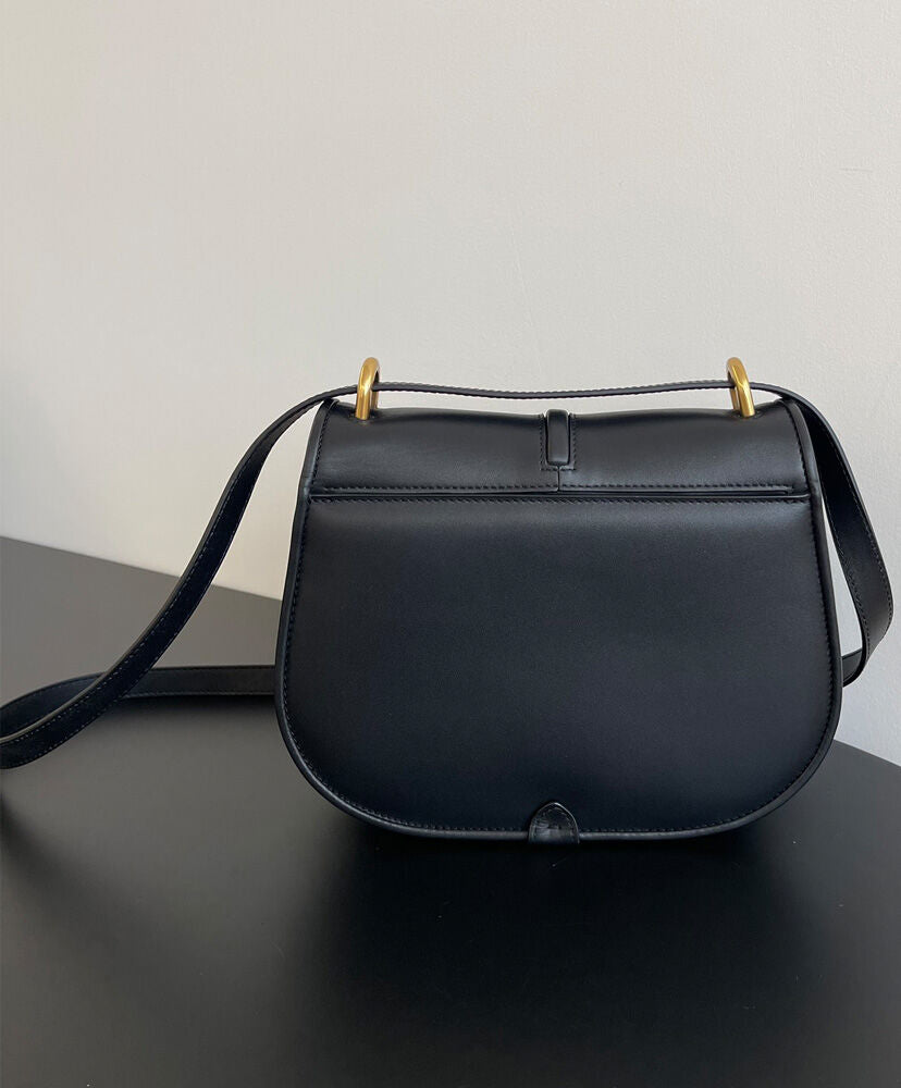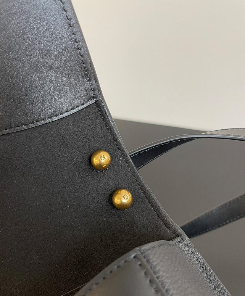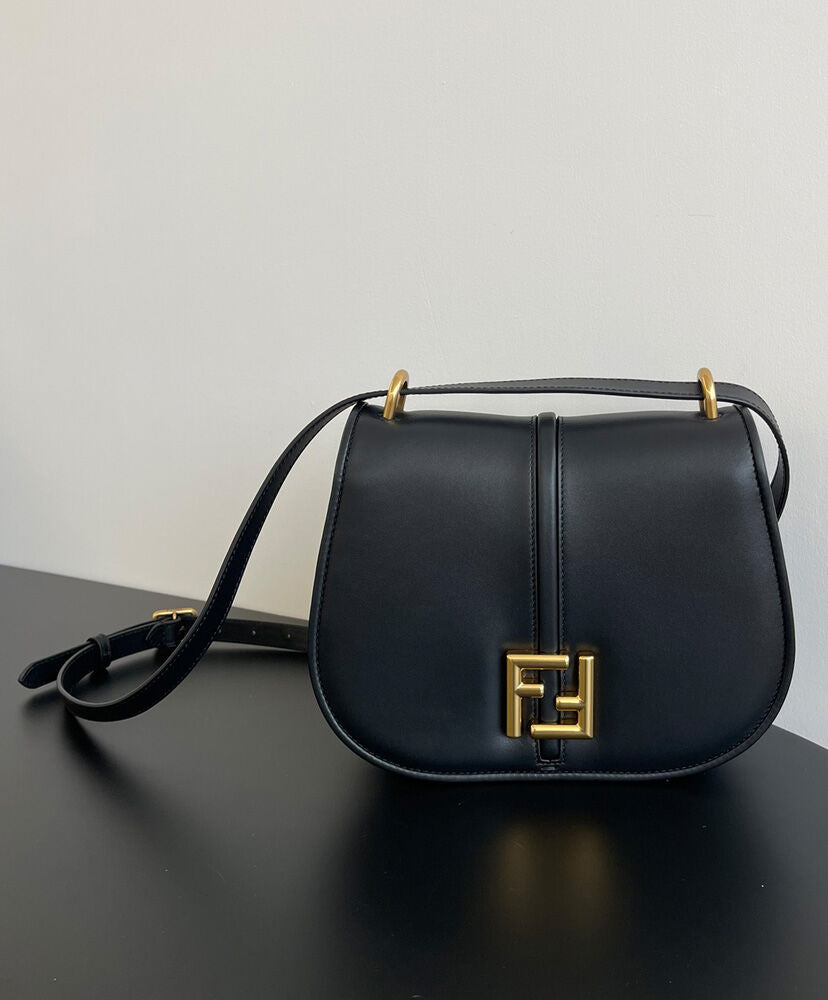 Medium satchel bag with curved, feminine lines and an elongated flap embellished with a metal FF logo. Made of smooth black leather with embossed edges and details. The sides of the bag are made from tone-on-tone full-grain leather.
