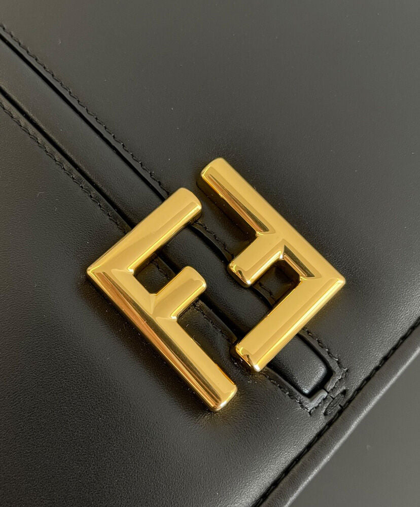 Features an adjustable and detachable shoulder strap. The shoulder strap hooks become an elegant accent with studs and an FF logo when the bag is open.