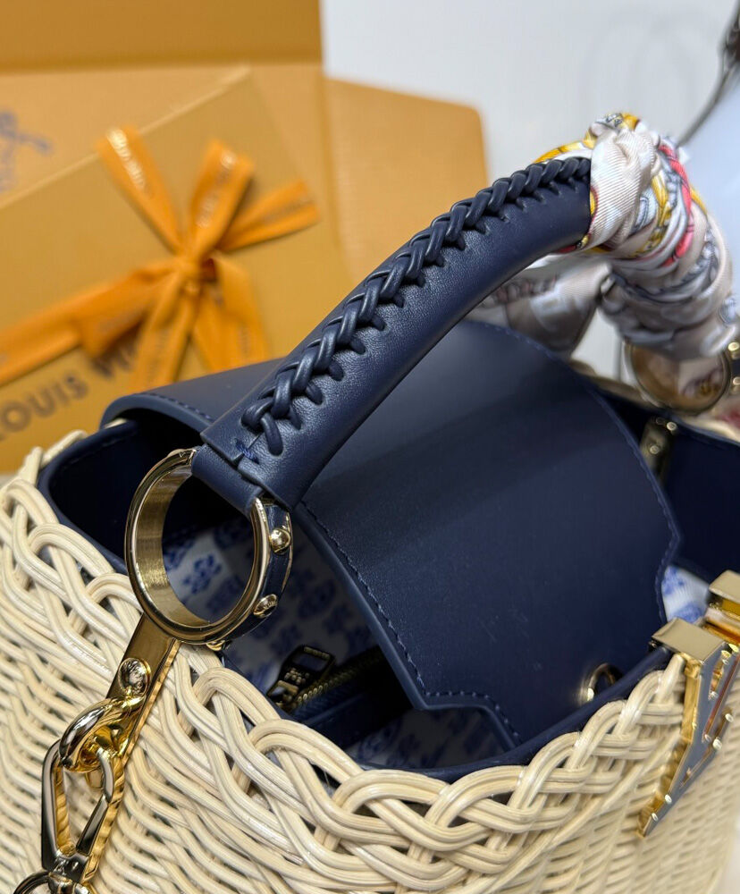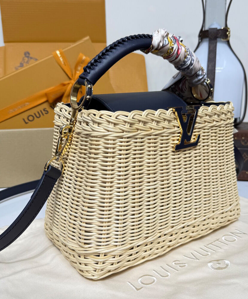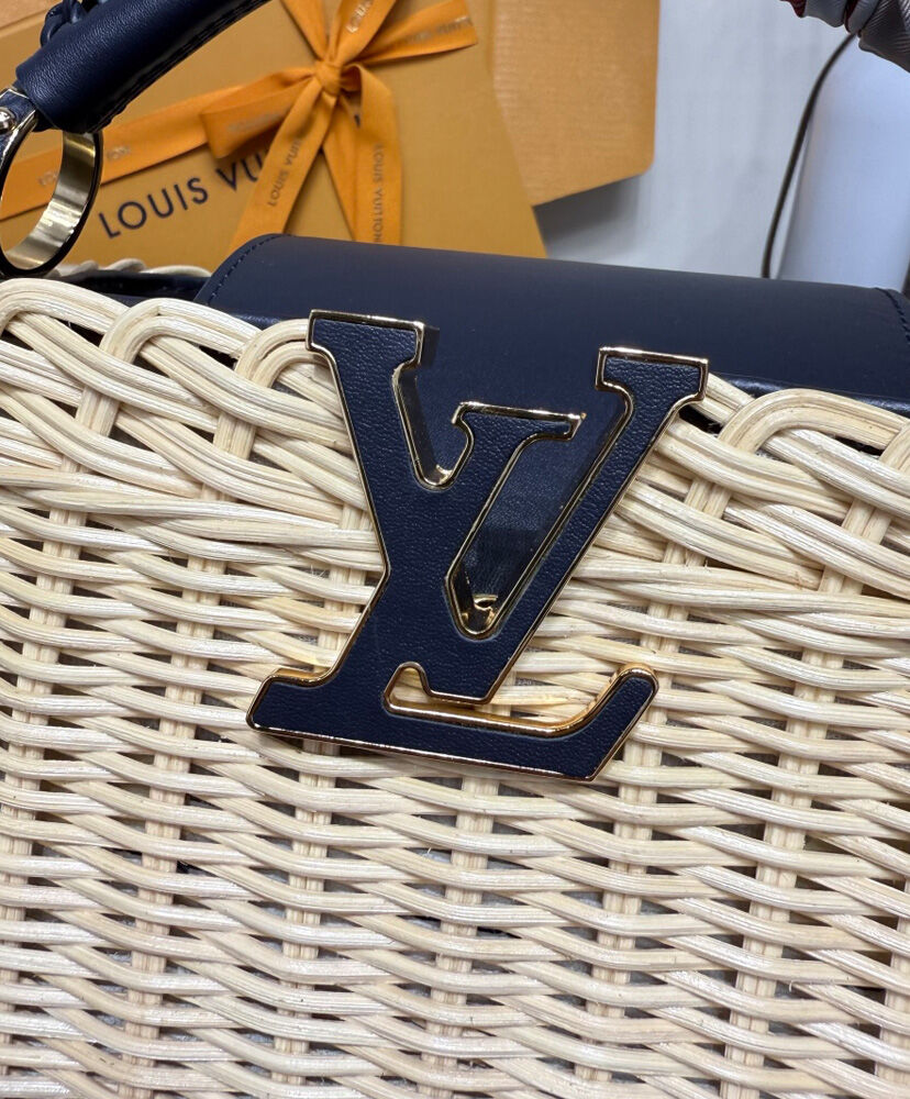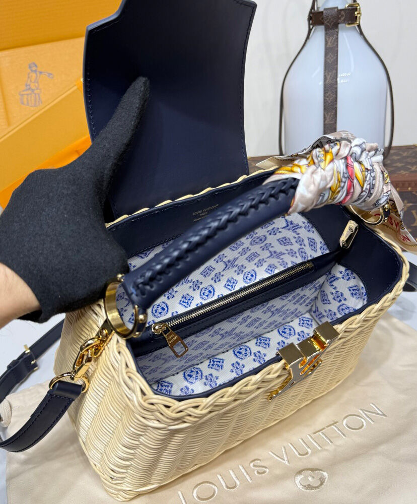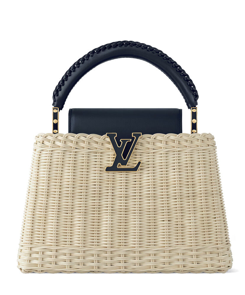 This Capucines BB is handwoven from rattan, with each one-of-a-kind design taking two days to complete. Lending a resort-inspired aesthetic, it is evocative of the House’s Picnic Trunk from 1892 and opens to reveal a patterned lining. It can be worn with the flap styled inside or out, and is sized to fit everyday essentials. The signature LV Initials add the final flourish.
