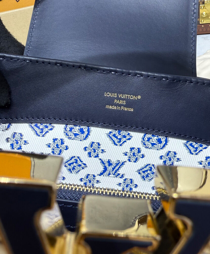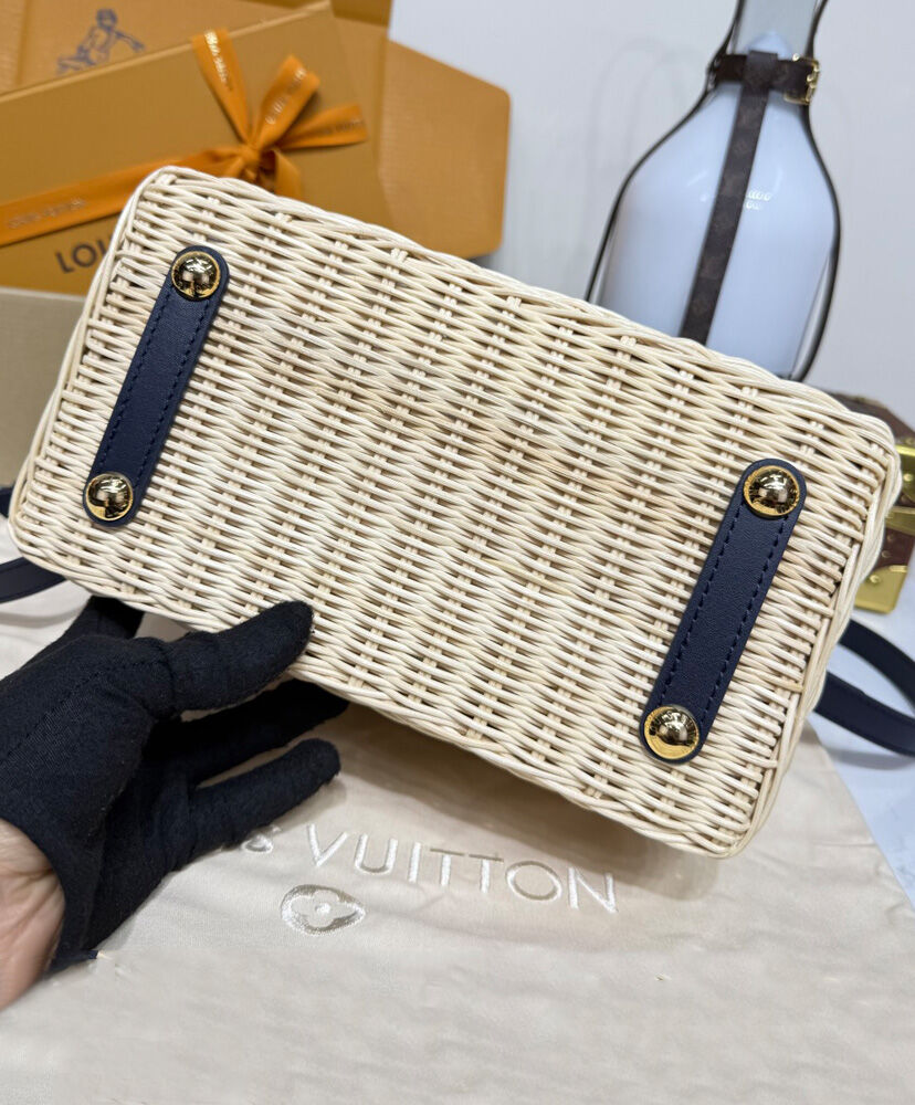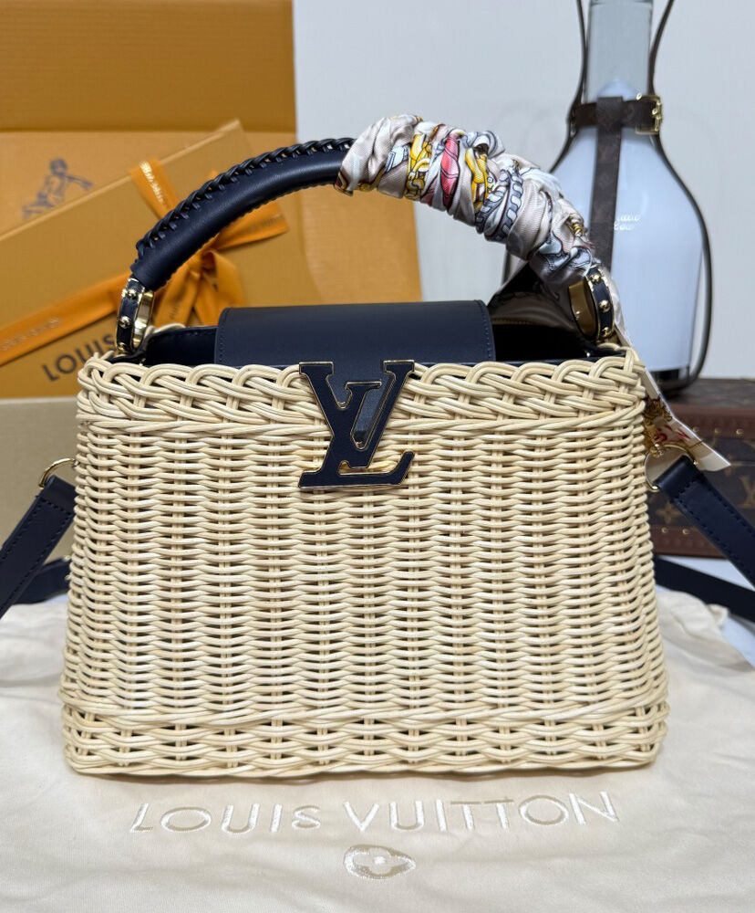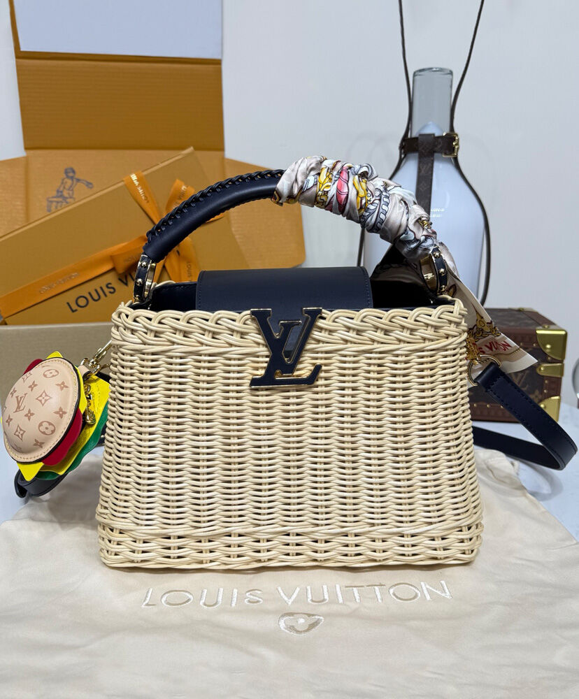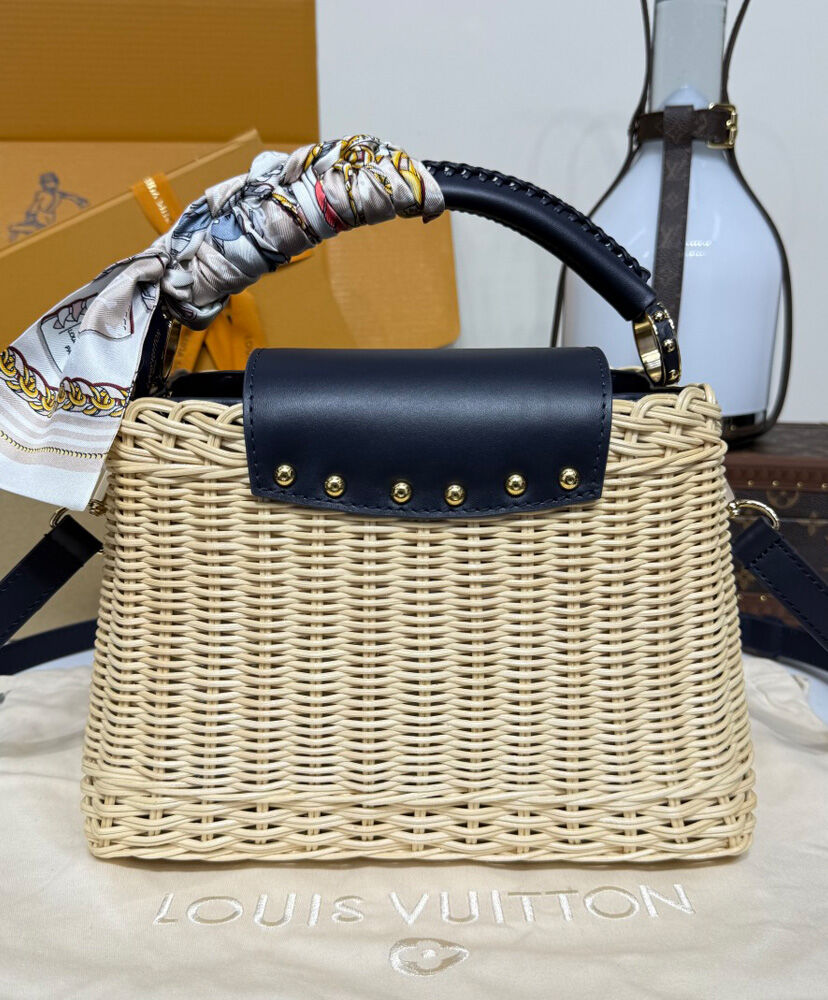 This Capucines BB is handwoven from rattan, with each one-of-a-kind design taking two days to complete. Lending a resort-inspired aesthetic, it is evocative of the House’s Picnic Trunk from 1892 and opens to reveal a patterned lining. It can be worn with the flap styled inside or out, and is sized to fit everyday essentials. The signature LV Initials add the final flourish.