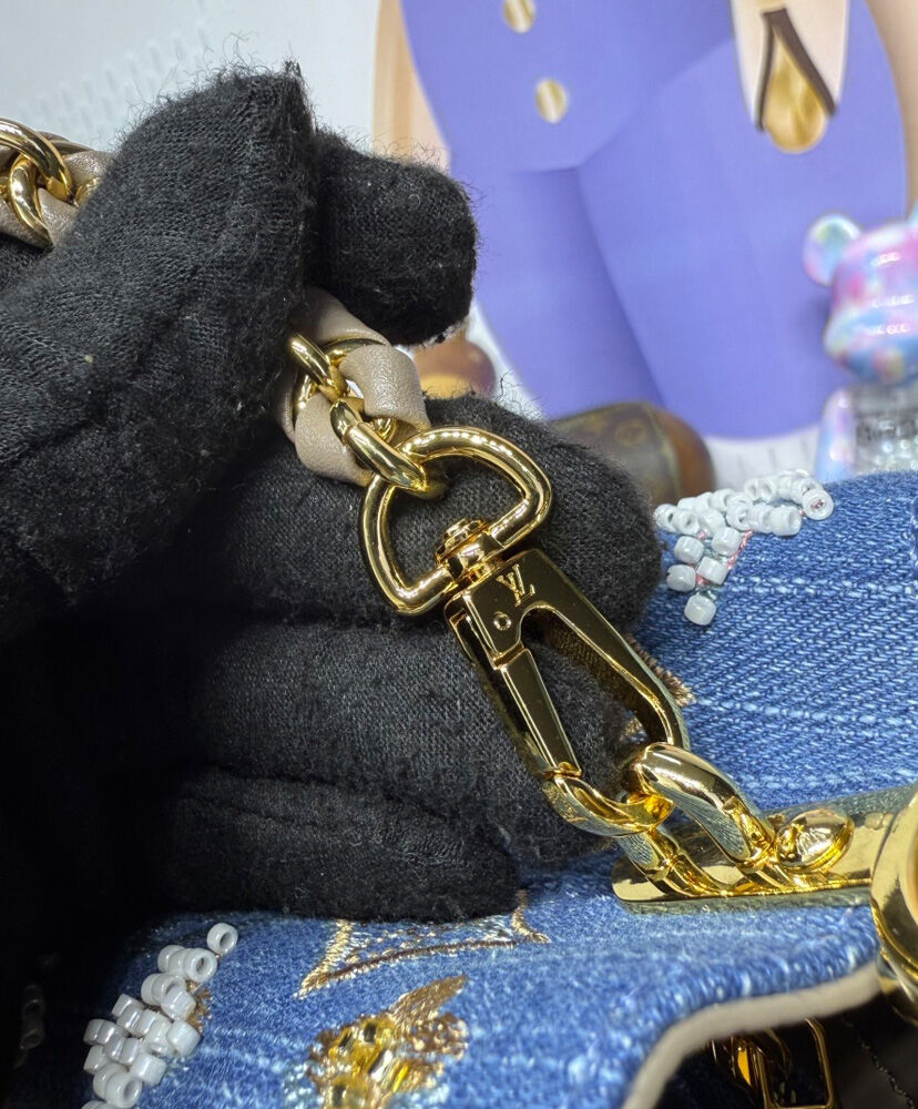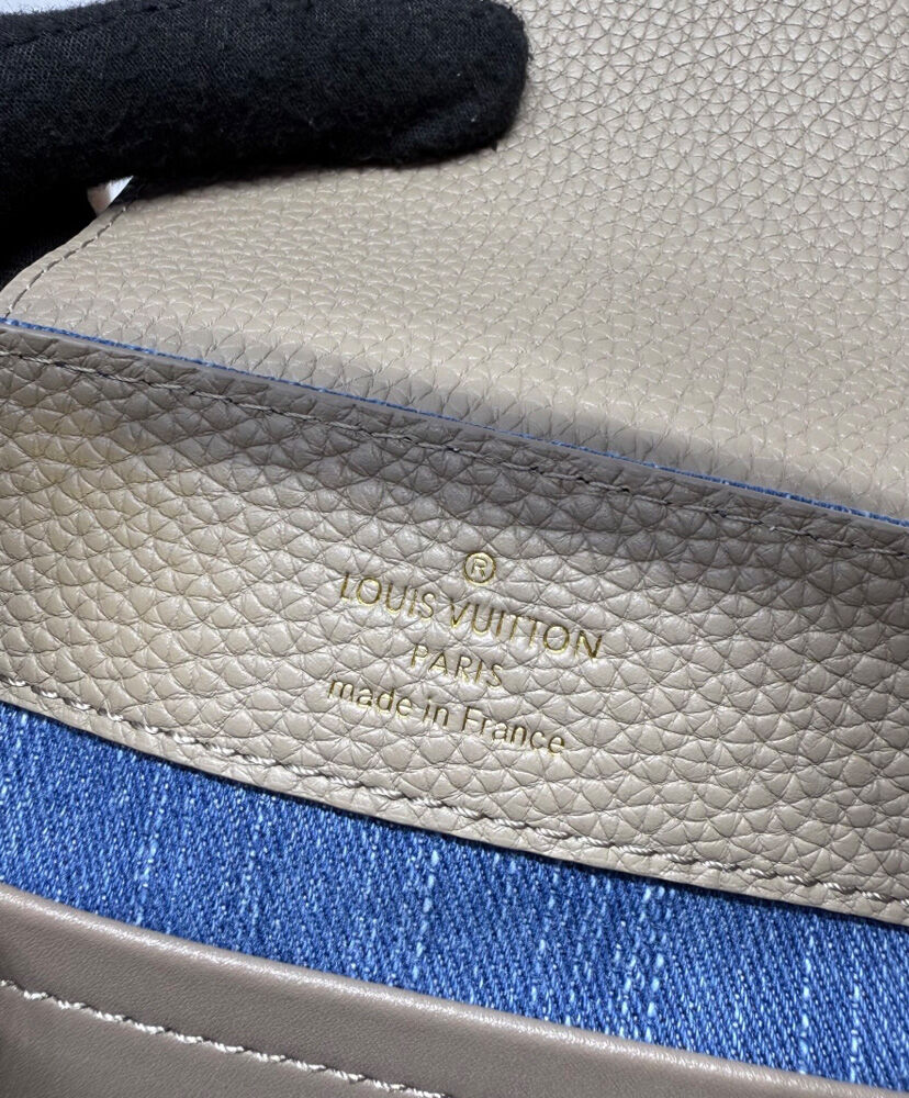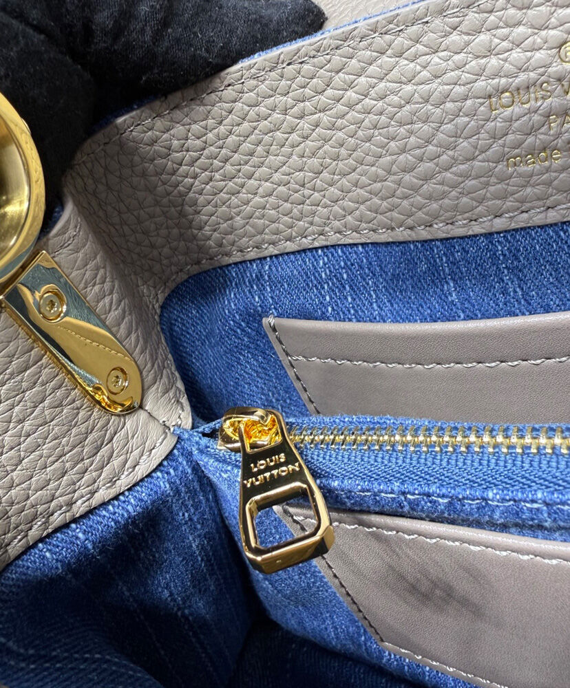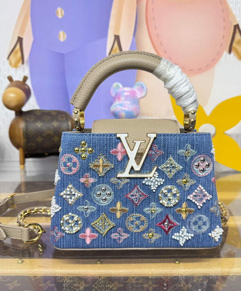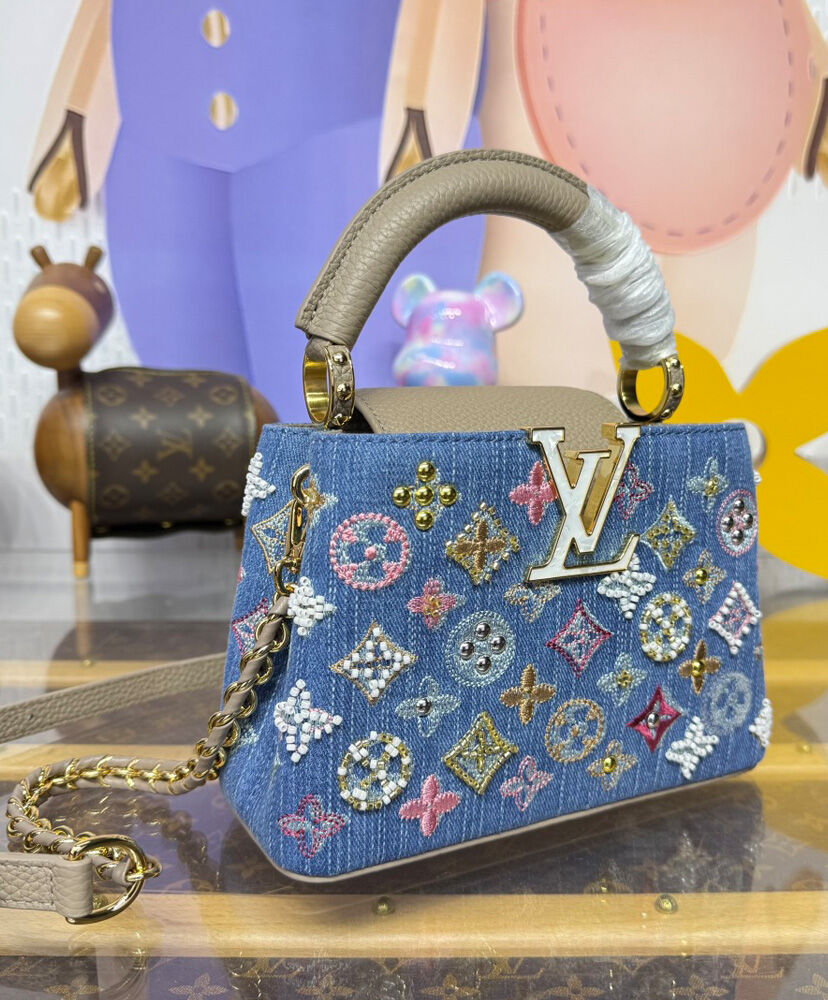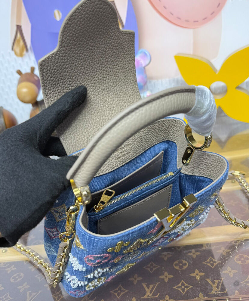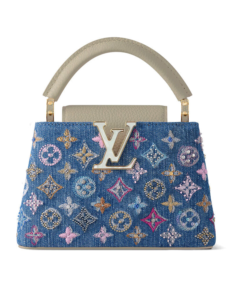 The Capucines Mini is reimagined for the season in Monogram denim, embroidered with intricate beads and metallic Lurex threads. It is trimmed with contrasting leather and adorned with gold-toned hardware, including LV Initials and a braided chain. The double-carry style opens to reveal a compartmented interior and can be worn multiple ways.