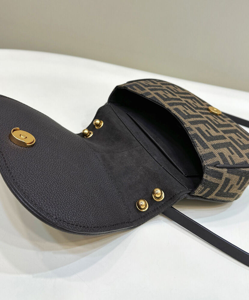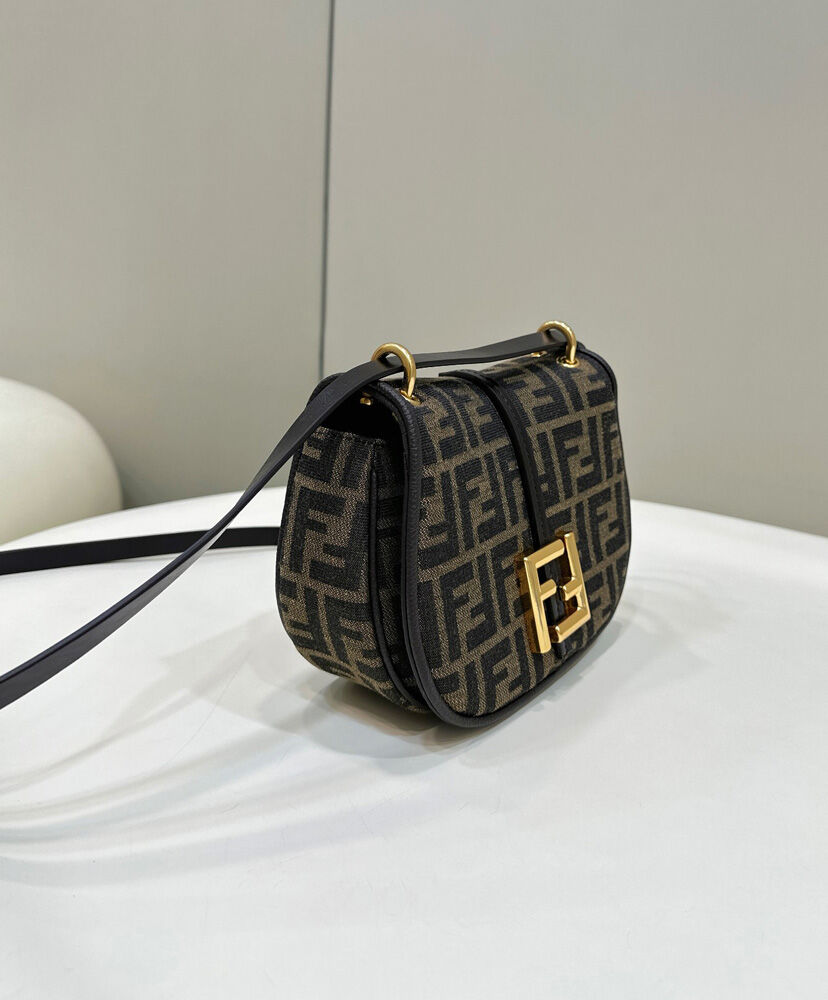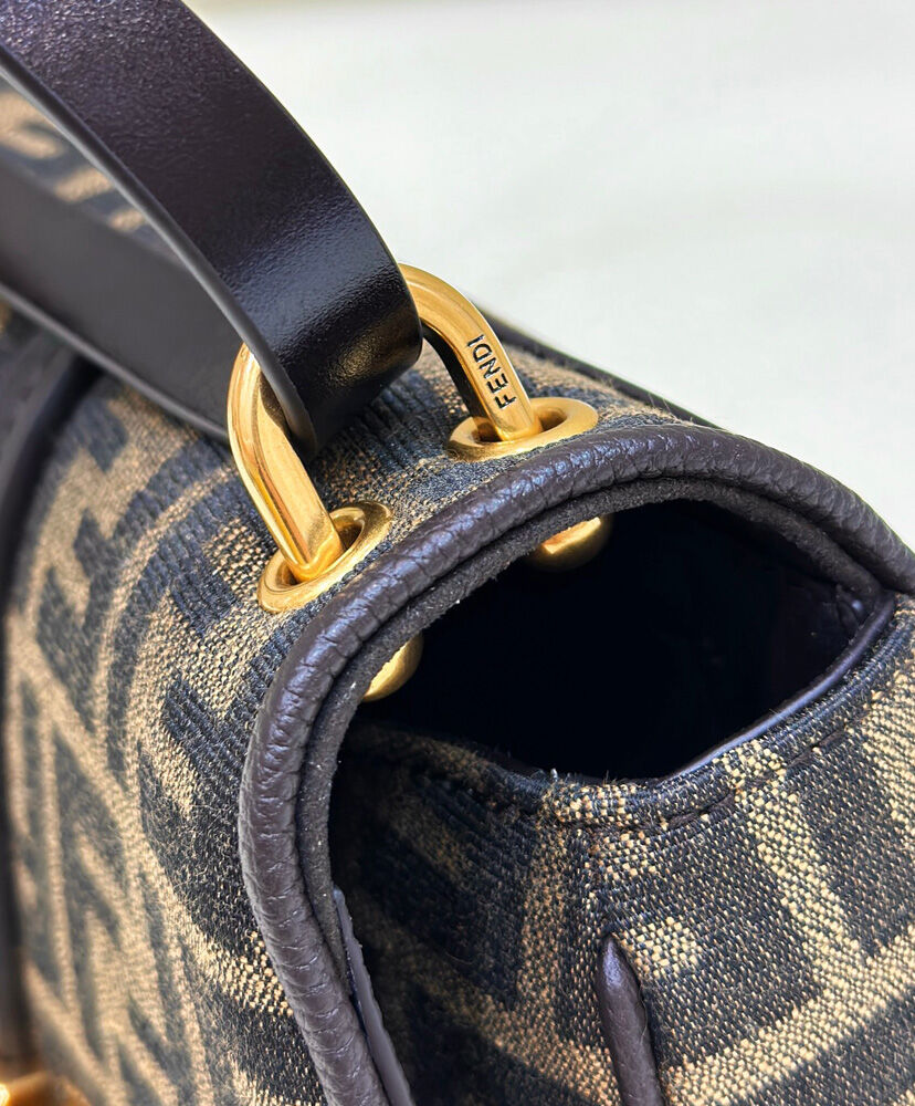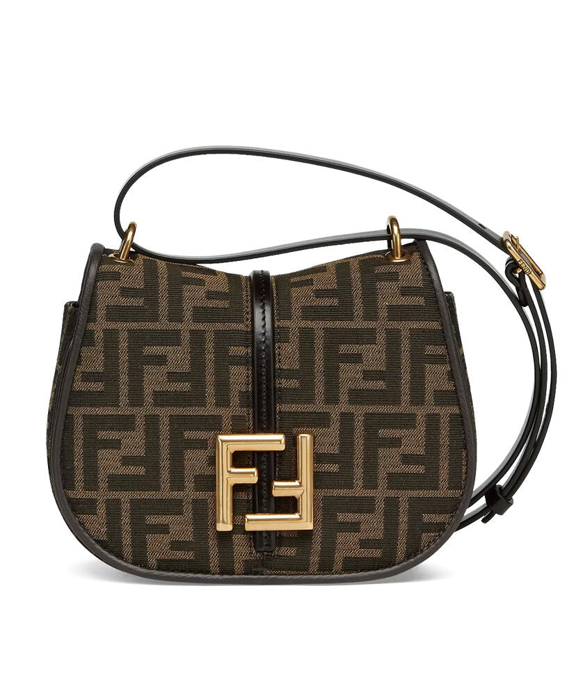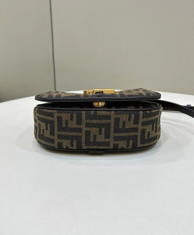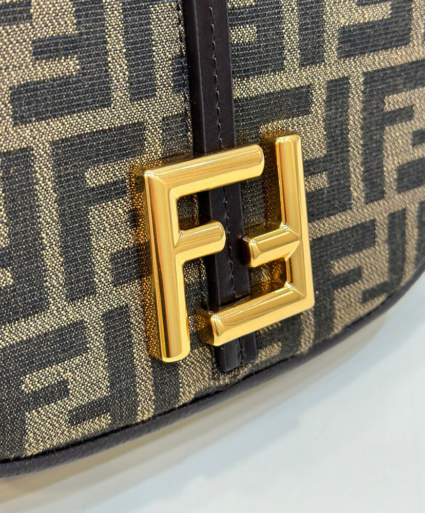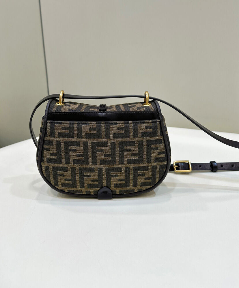 Small satchel bag with curved, feminine lines made of fabric with an FF jacquard motif. Embellished with embossed details and edges in brown leather and an FF logo on the flap.
