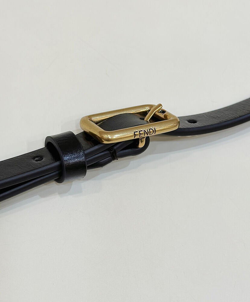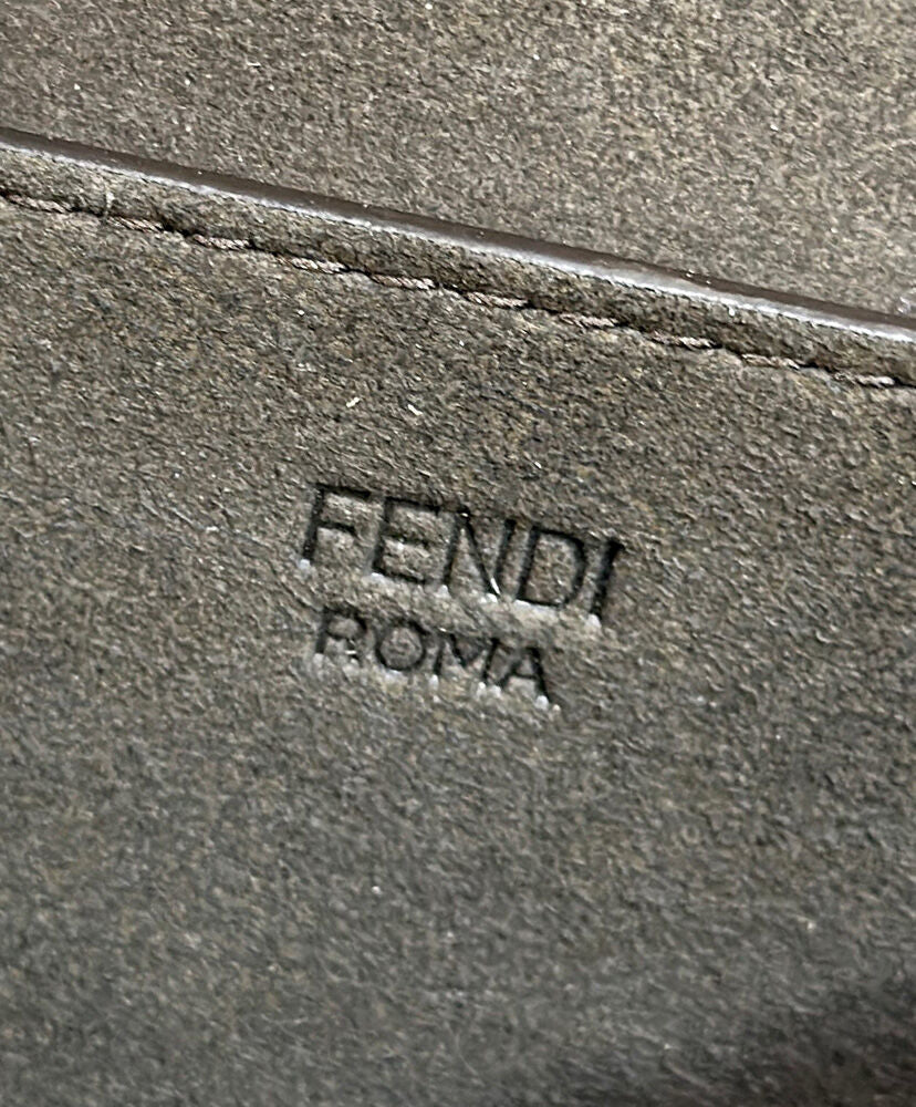 Features an adjustable and detachable leather shoulder strap. The shoulder strap hooks become an elegant accent with studs and an FF logo when the bag is open.