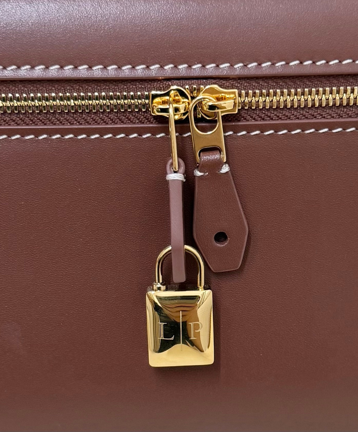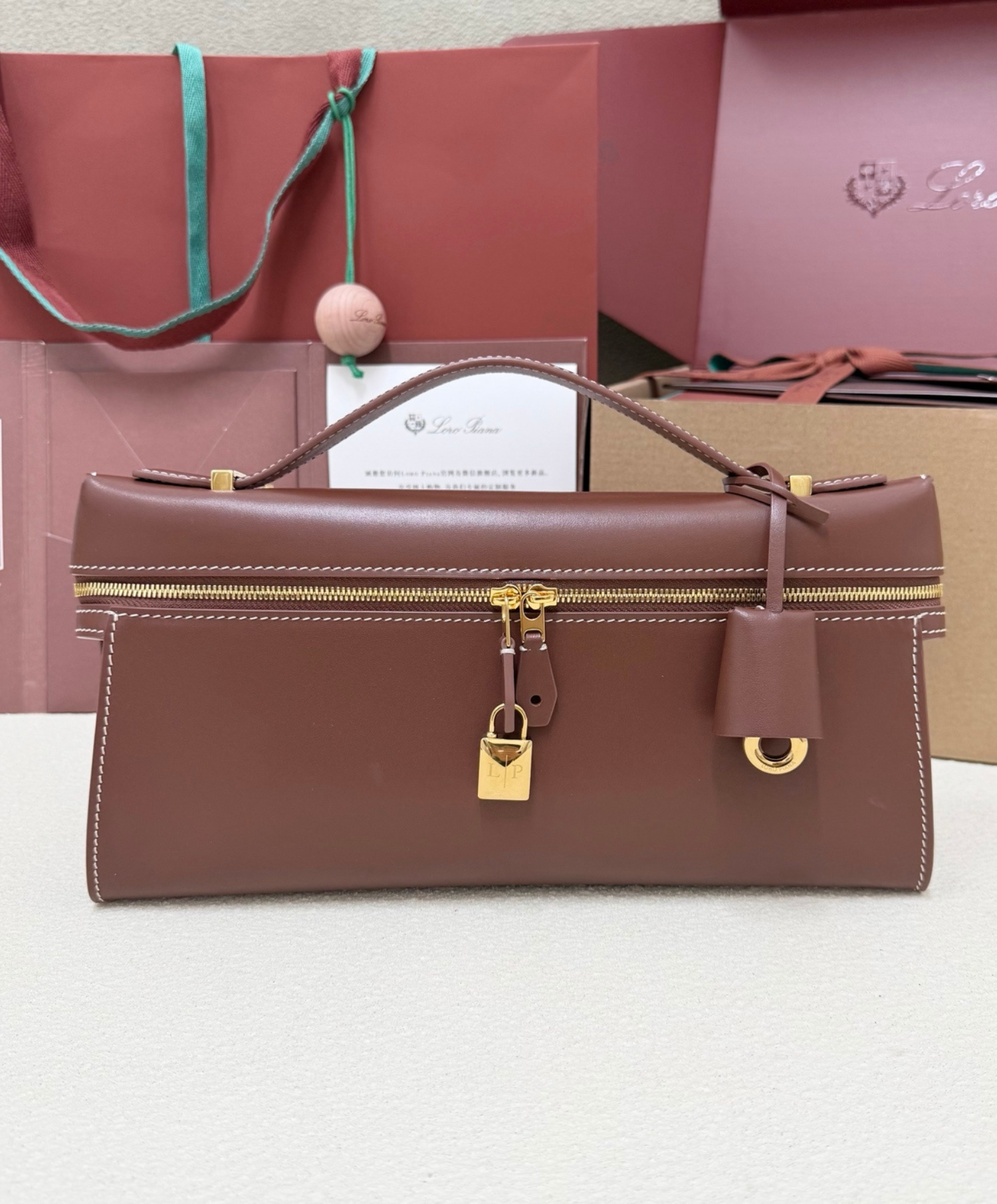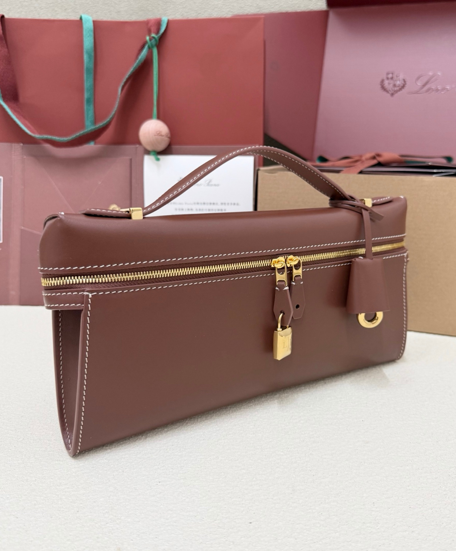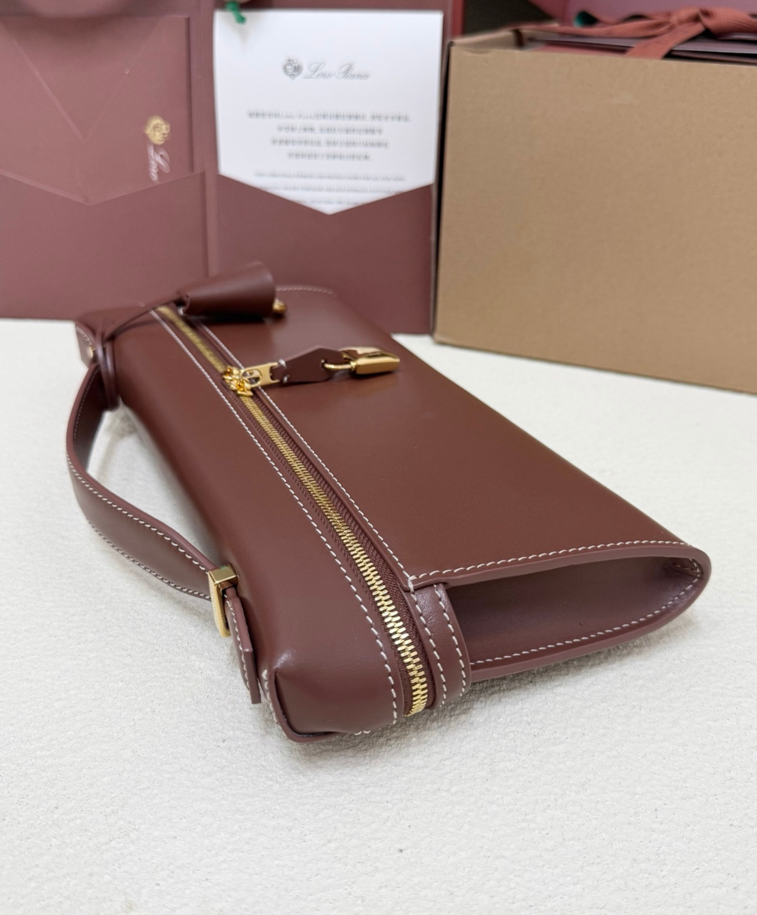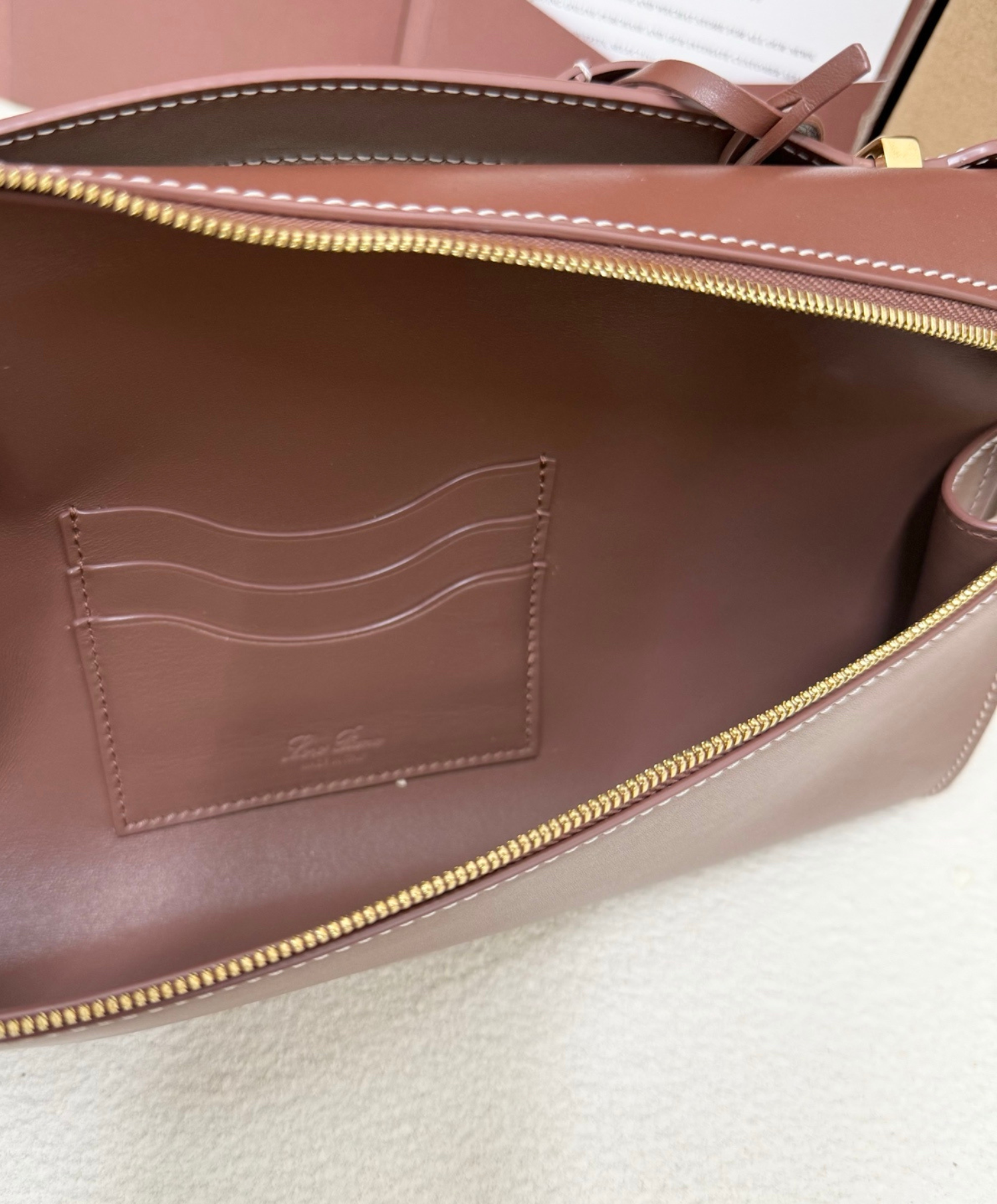 An elegant accessory with compact proportions, the Extra clutch L29 is primed for special occasions and everyday elegance alike. It is rendered in Saddle Leather with a smooth, full-bodied touch and signature topstitching. Suspended from the double-zip close are Loro Piana’s iconic charms, framed by a refined leather key holder.