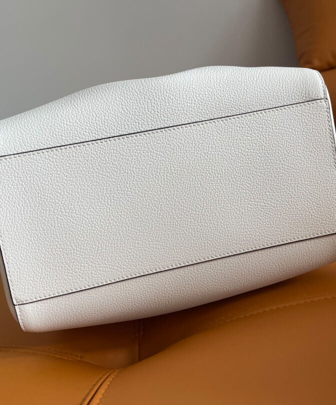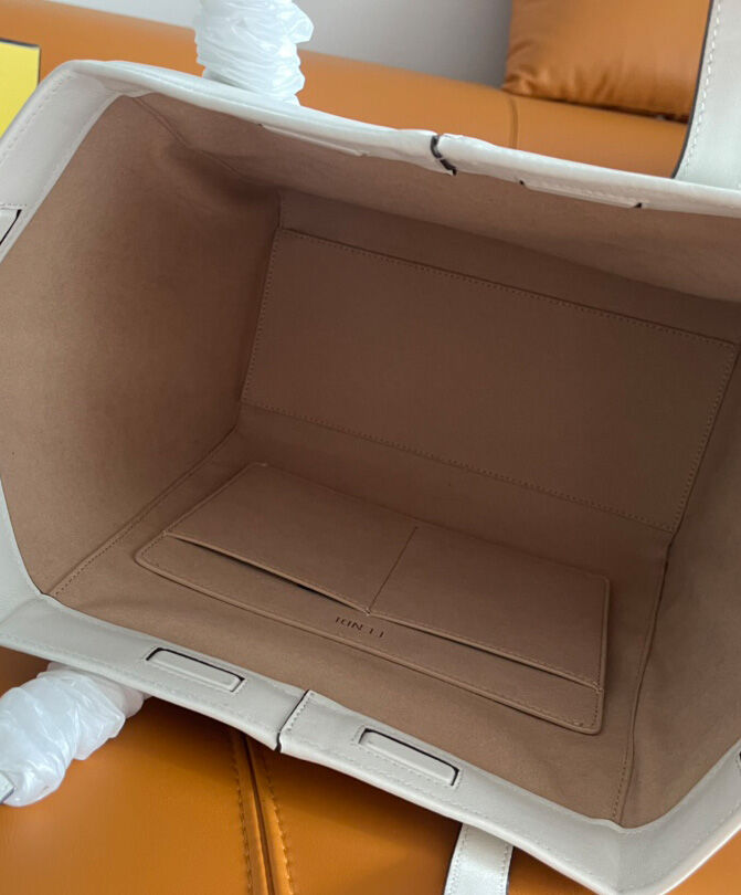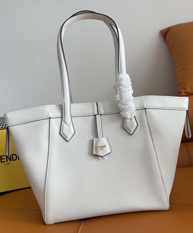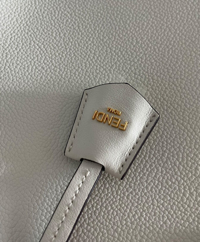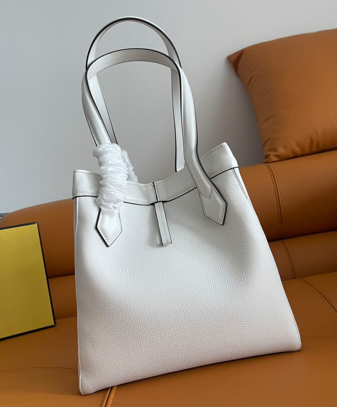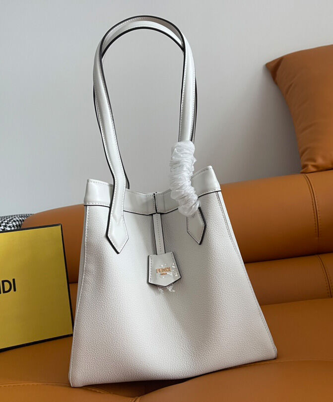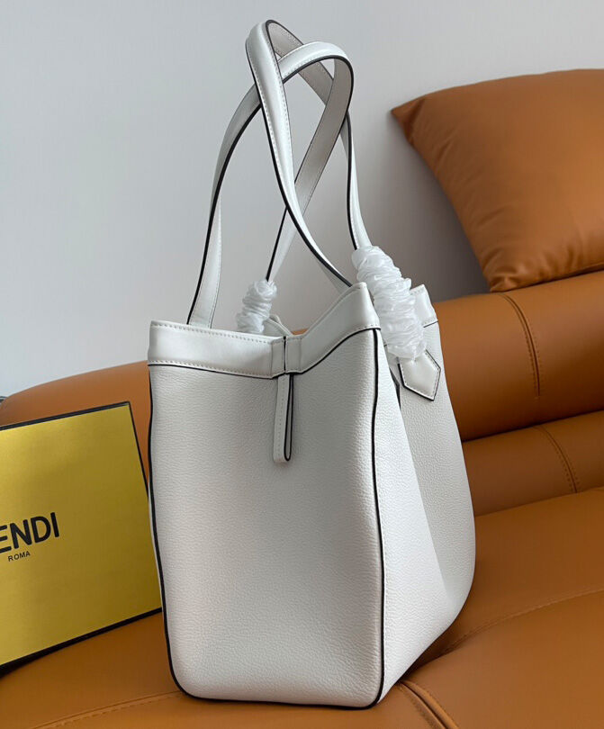 Medium Origami bag made of white full-grain leather. The style recalls the creativity and dual nature of Fendi with an innovative design that can be transformed. Thanks to eight concealed magnets the bag can be styled as a shopper bag or bucket bag by folding it origami style.