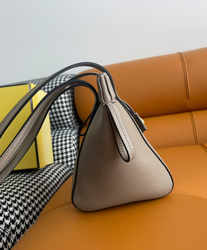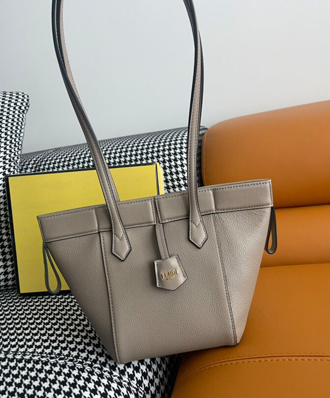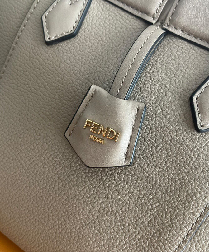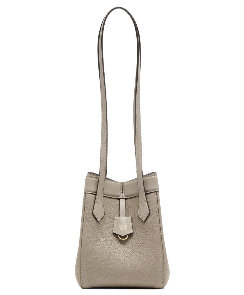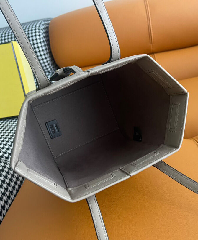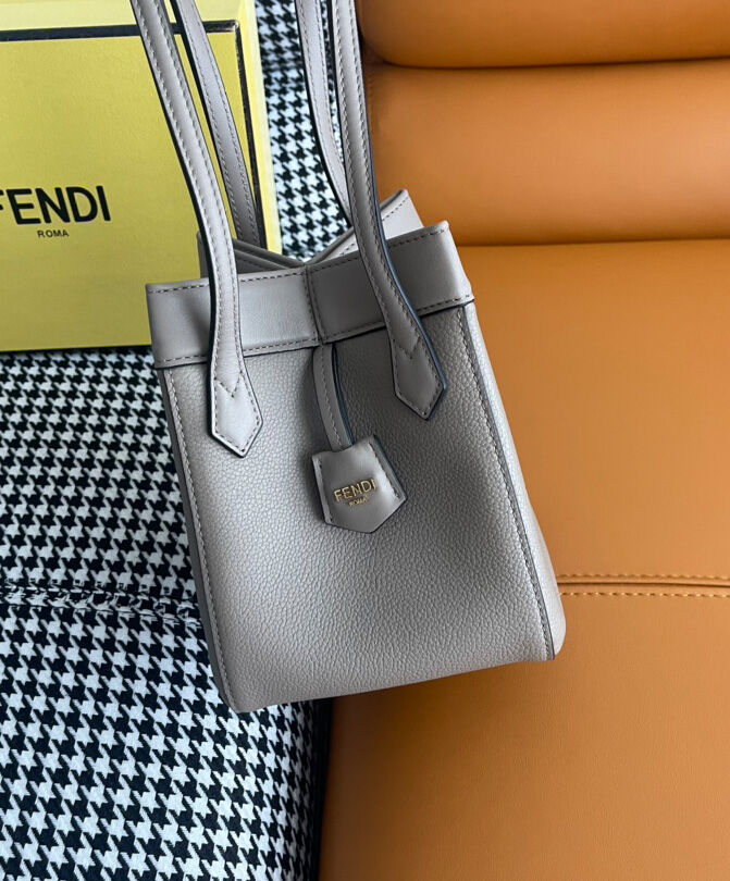 Mini Origami bag made of dove grey full-grain leather. The style recalls the creativity and dual nature of Fendi with an innovative design that can be transformed. Thanks to eight concealed magnets the bag can be styled as a shopper bag or bucket bag by folding it origami style.