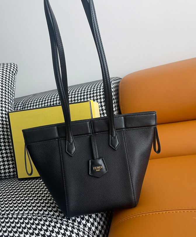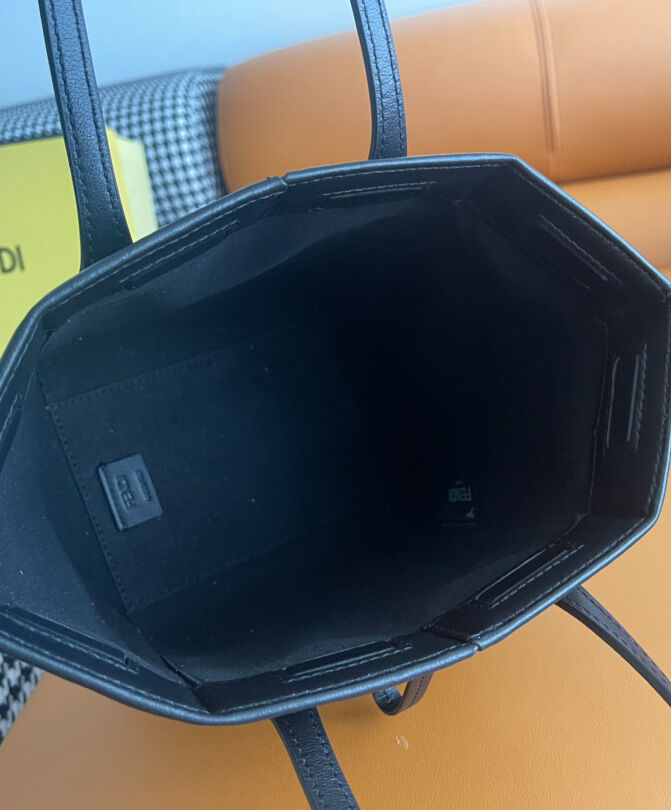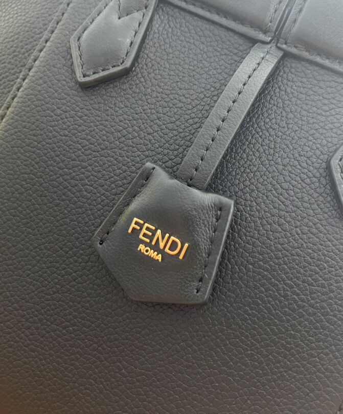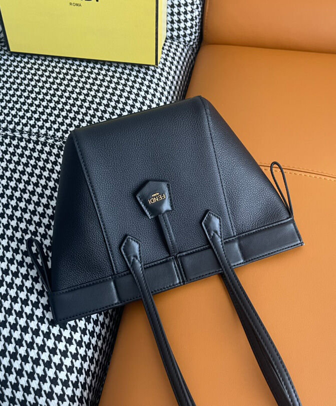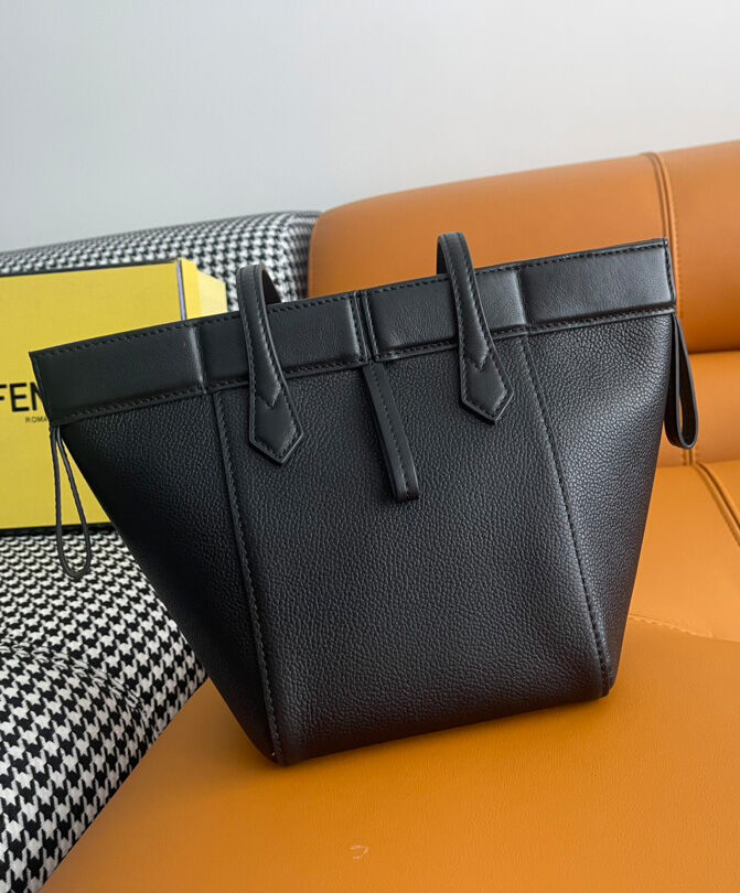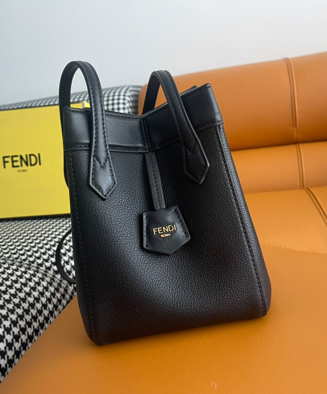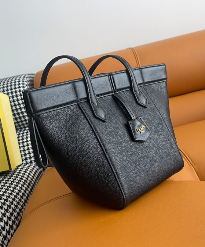 Mini Origami bag made of black full-grain leather. The style recalls the creativity and dual nature of Fendi with an innovative design that can be transformed. Thanks to eight concealed magnets the bag can be styled as a shopper bag or bucket bag by folding it origami style.