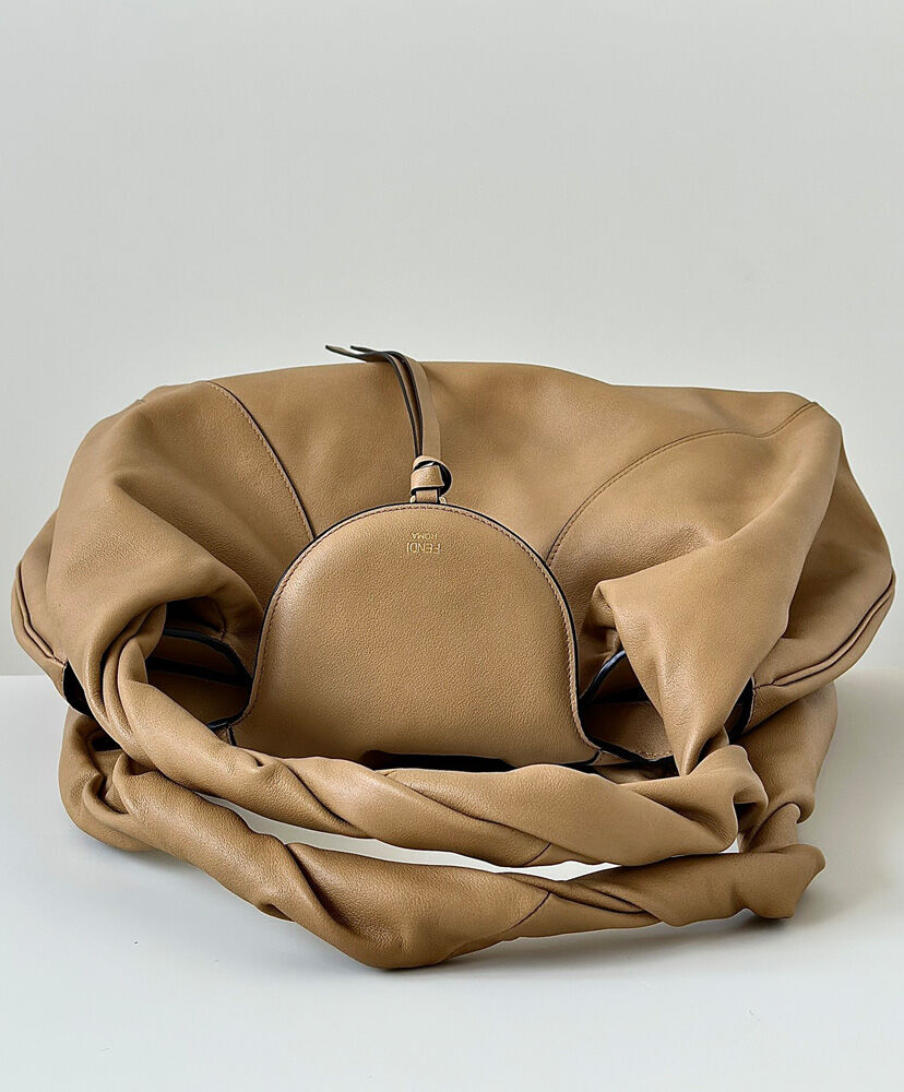 Large Fendi Spy Bag, a contemporary reinterpretation of a famous Fendi It bag presented in the Spring Summer 2005 Fashion Show, distinguished by its unique and unmistakable design. The name is inspired by the bag’s features, which include a secret pocket hidden in the flap that can be opened with a small button. An expression of fine craftsmanship, it features distinctive twisted handles that embellish the silhouette.