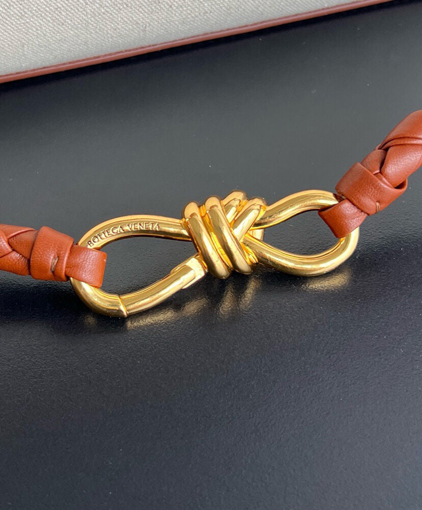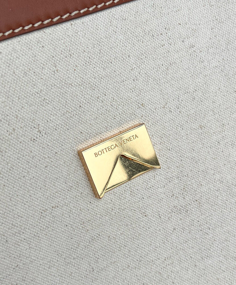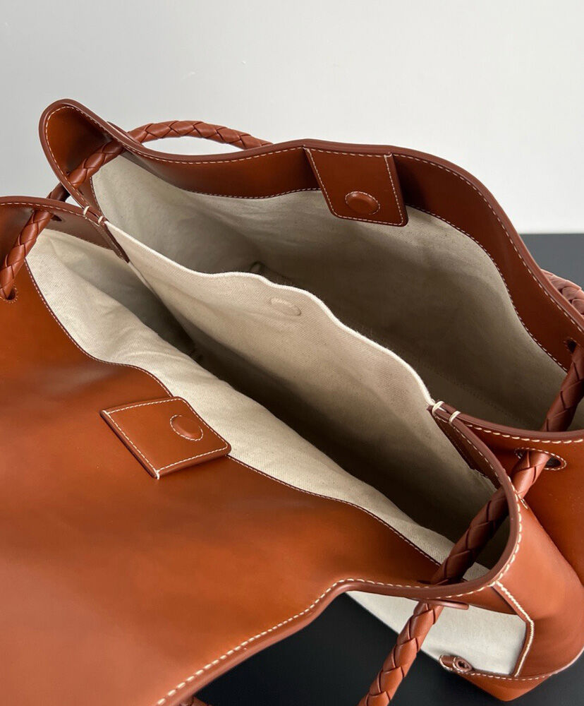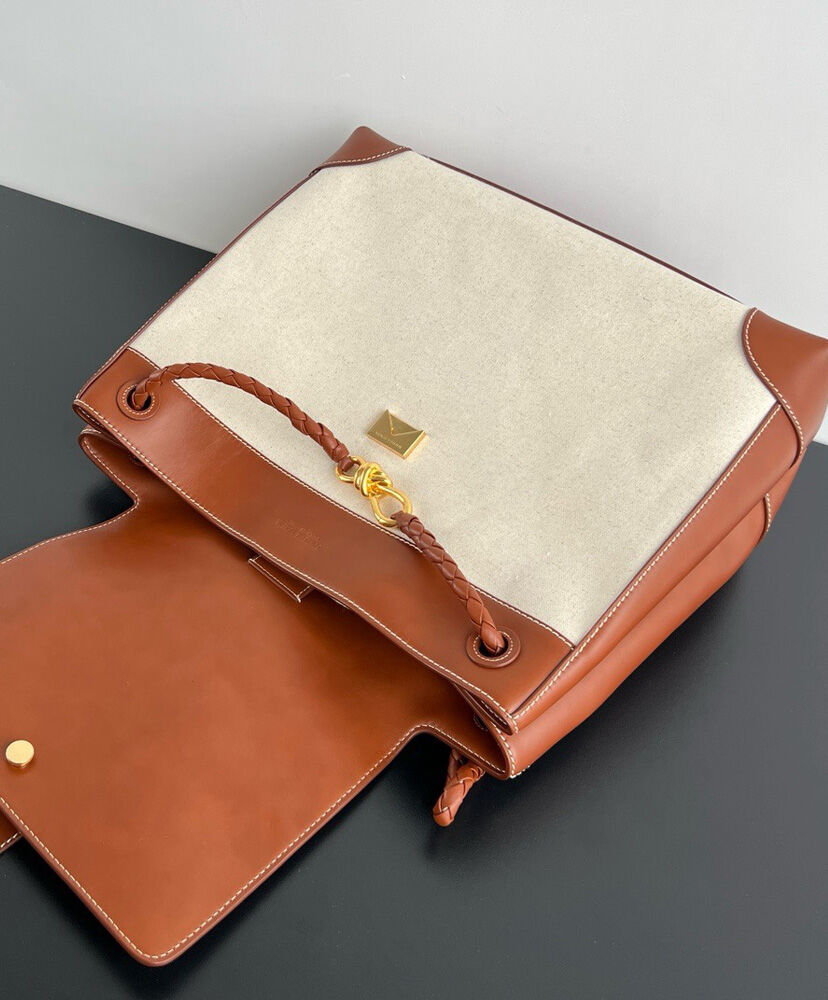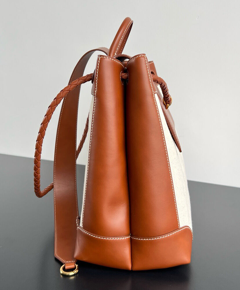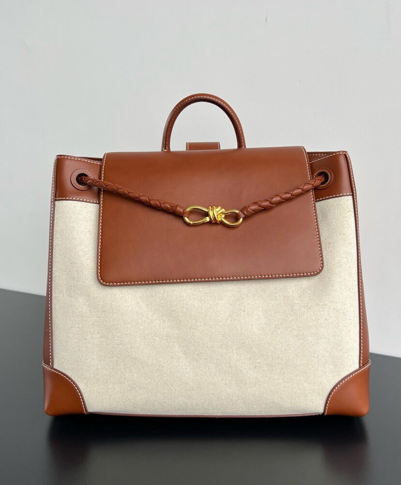 Backpack in weathered leather and canvas with signature knot detail, back strap and