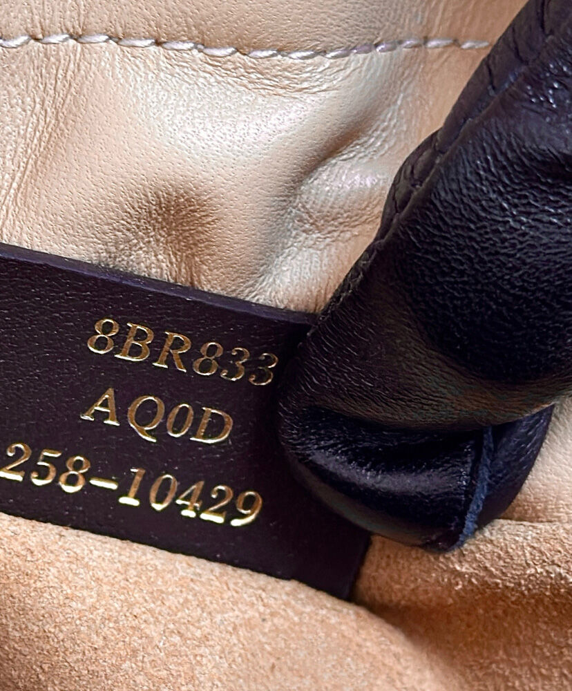 Large suede-lined internal compartment with drawstring closure featuring cream-colored leather ties and customized details.