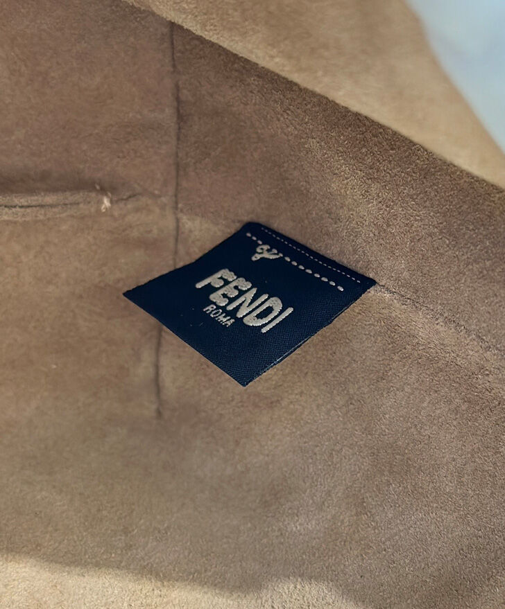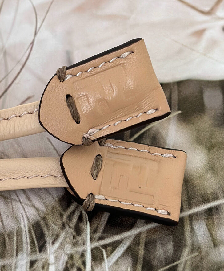 Large suede-lined internal compartment with drawstring closure featuring cream-colored leather ties and customized details.
