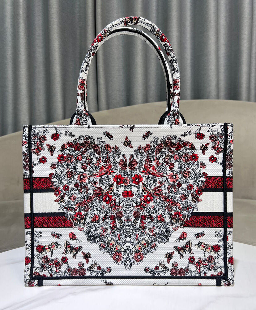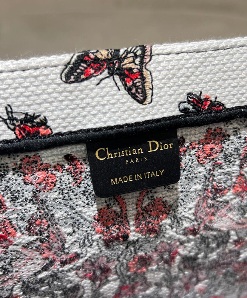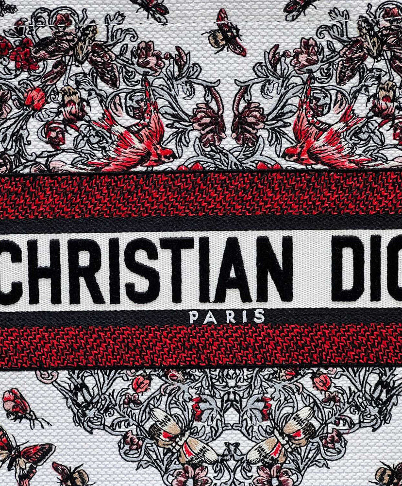 Part of the Dioramour capsule celebrating Dior's vision of love and romance, the Dior Book Tote is a House classic designed by Maria Grazia Chiuri, Creative Director of Christian Dior. Designed to hold all the daily essentials, the latte style is fully embroidered with Pietro Ruffo's multicolor Cur des Curiosites motif, showcasing a floral design elevated by symbols like the bee, butterfly and swallow.