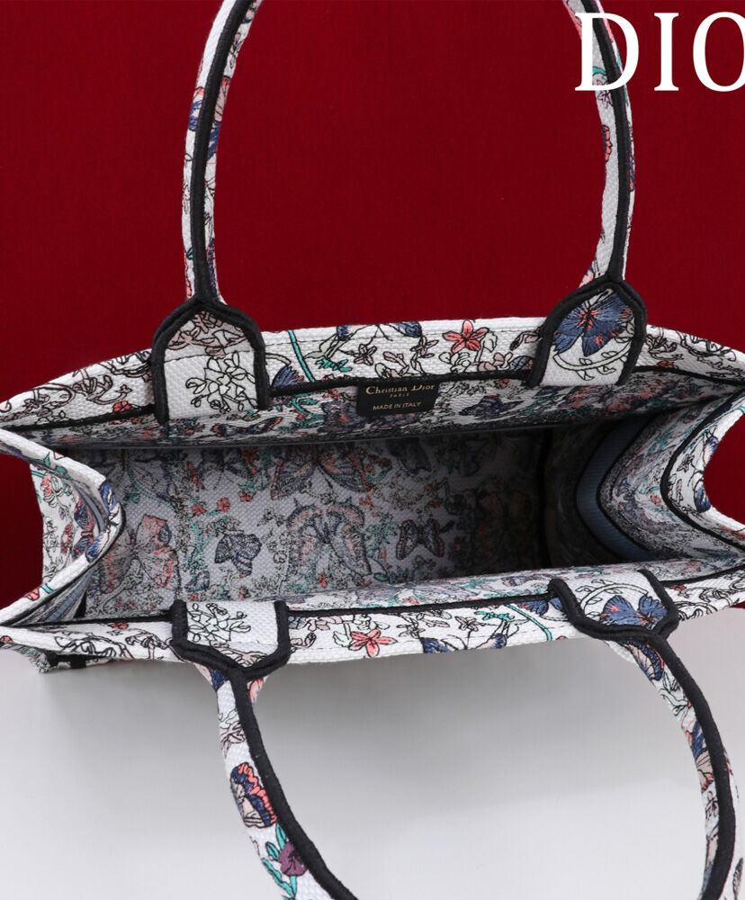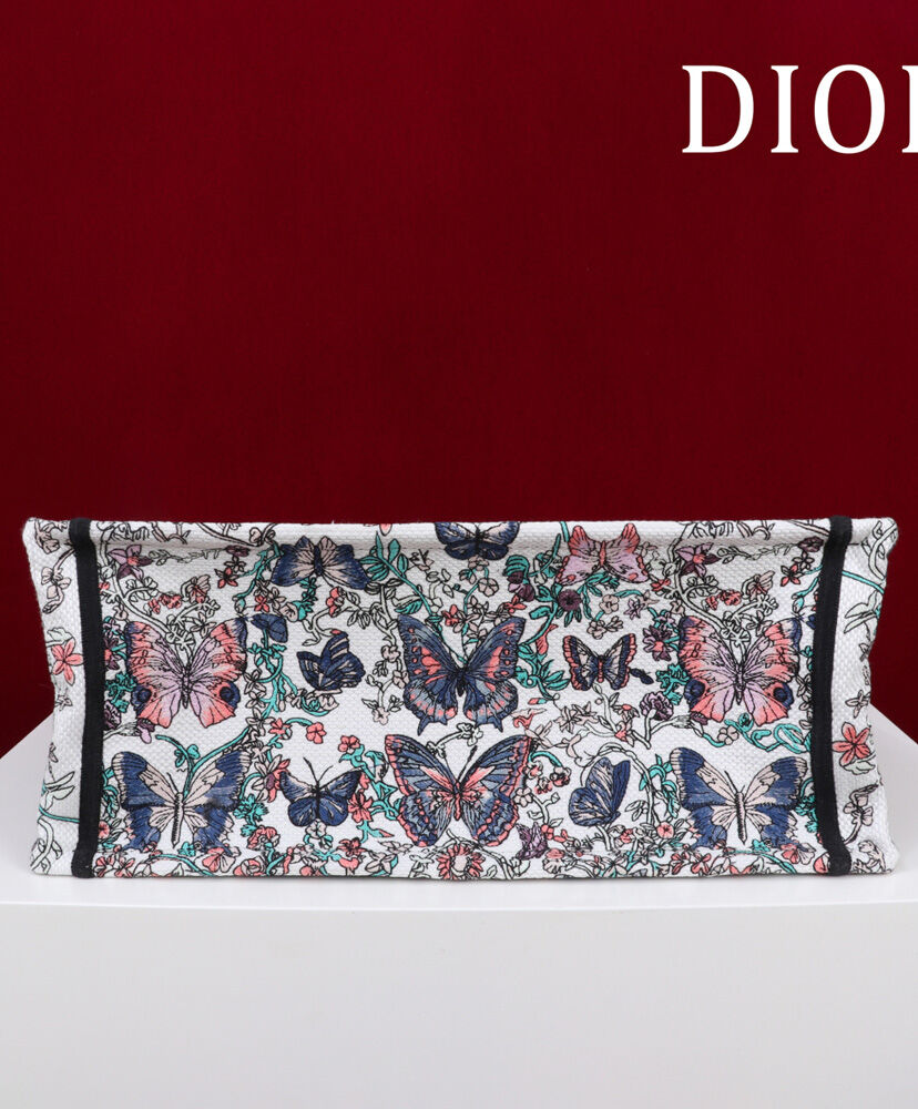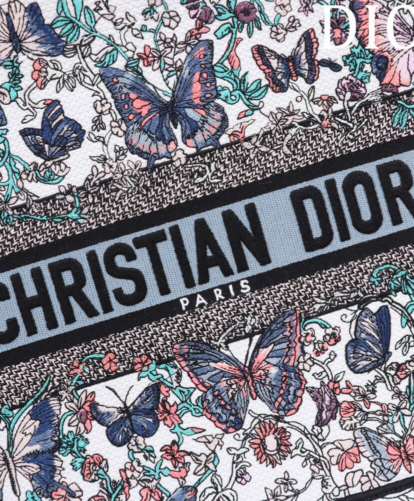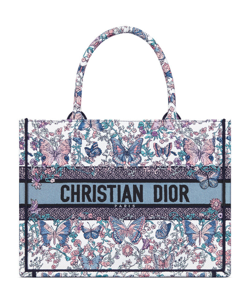 Introduced by Maria Grazia Chiuri, Creative Director of Christian Dior, the Dior Book Tote has become a staple of the Dior aesthetic. Created to hold all the daily essentials, the style is fully embroidered with Pietro Ruffo's white and blue Toile de Jouy Papillon motif, showcasing delicate butterflies in an elegant and dreamlike floral setting.