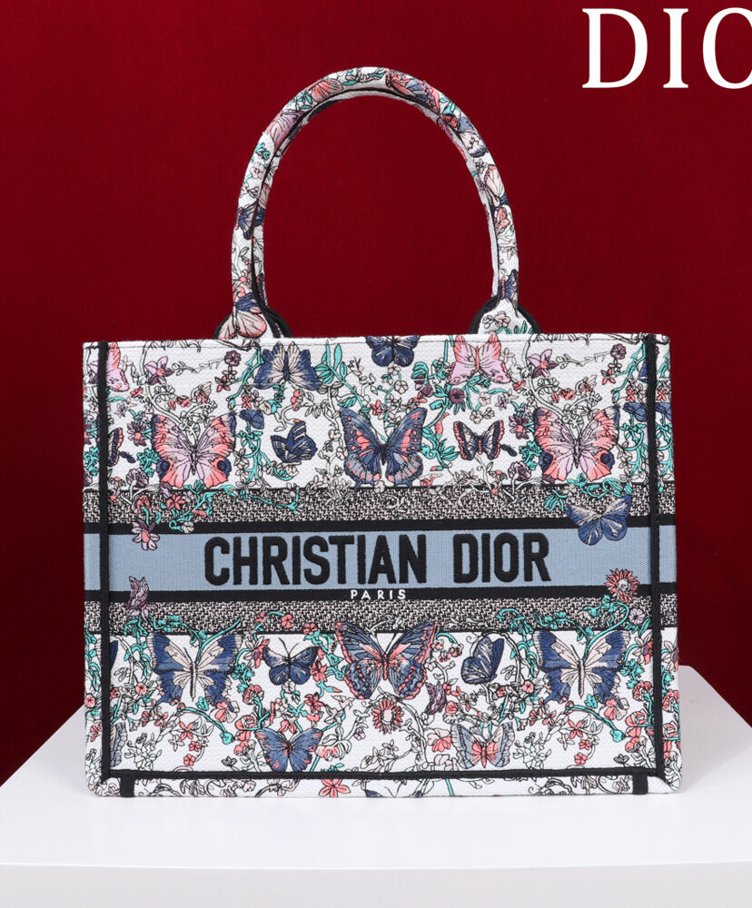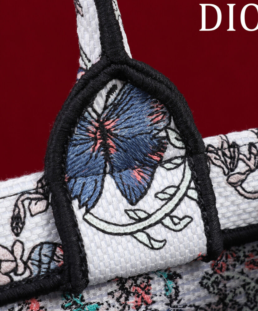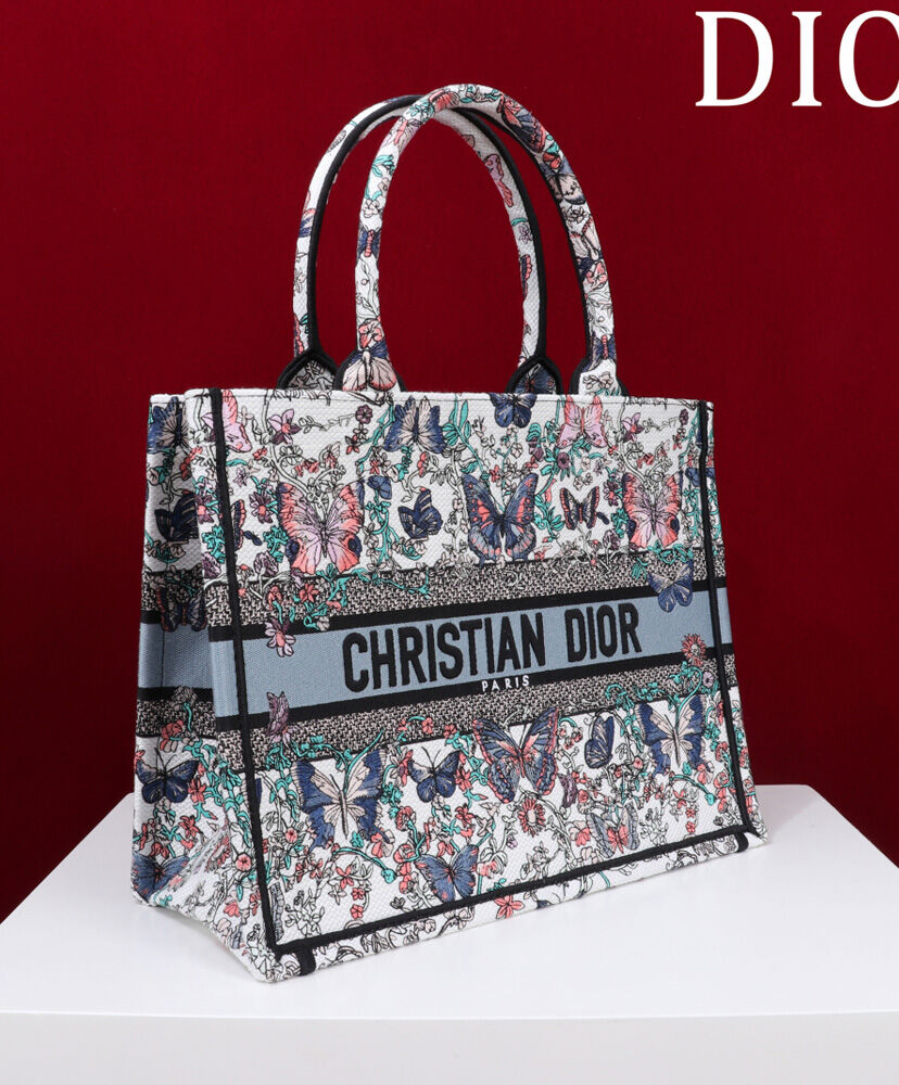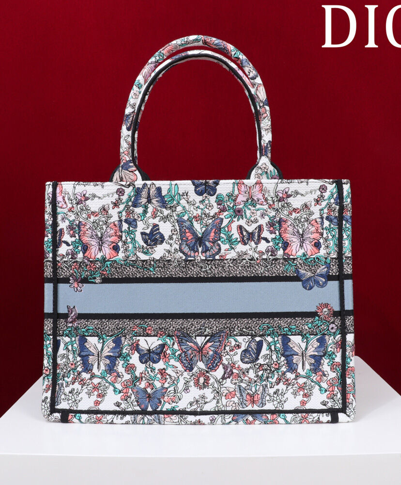 Introduced by Maria Grazia Chiuri, Creative Director of Christian Dior, the Dior Book Tote has become a staple of the Dior aesthetic. Created to hold all the daily essentials, the style is fully embroidered with Pietro Ruffo's white and blue Toile de Jouy Papillon motif, showcasing delicate butterflies in an elegant and dreamlike floral setting.