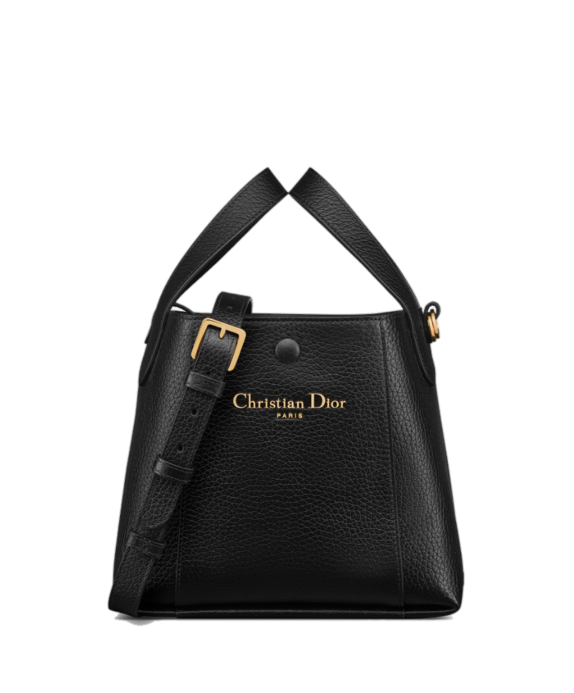New for Summer 2025, the Signature bucket bag showcases a supple silhouette and versatile design. Crafted in black grained calfskin, it is adorned with an antique gold-finish metal Christian Dior Paris signature on the front. The spacious compartment, equipped with a snap and tab to secure the essentials, is completed by a slip pocket. The leather top handles and adjustable, removable strap allow the small bag to be effortlessly carried by hand, worn over the shoulder or crossbody.