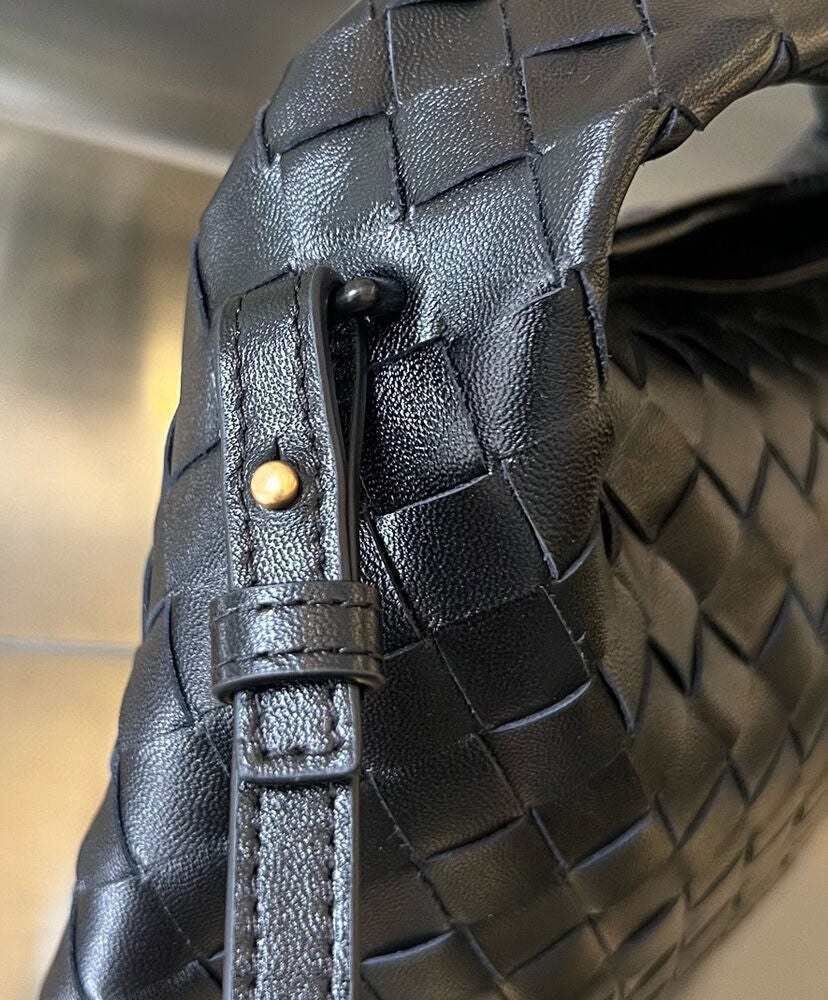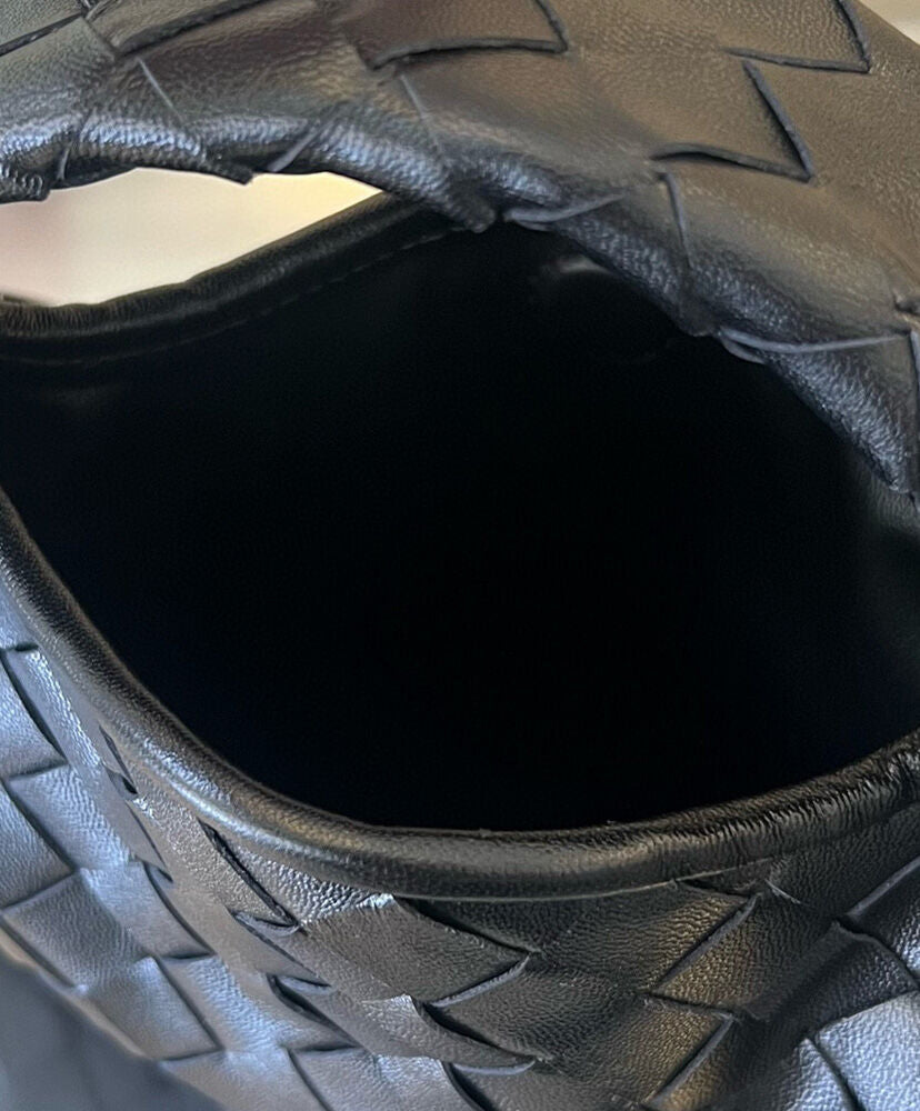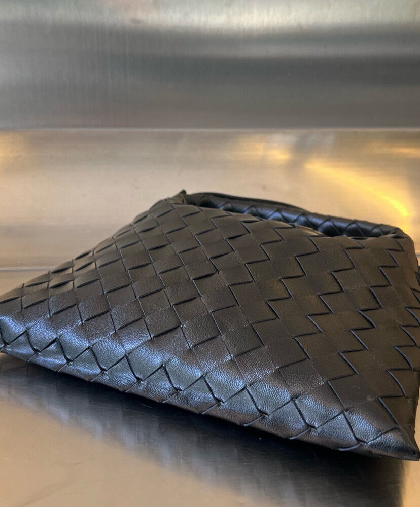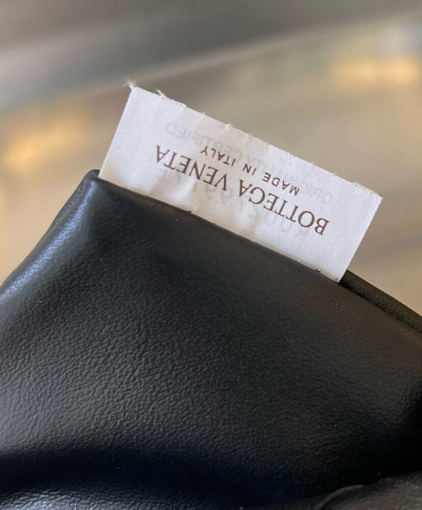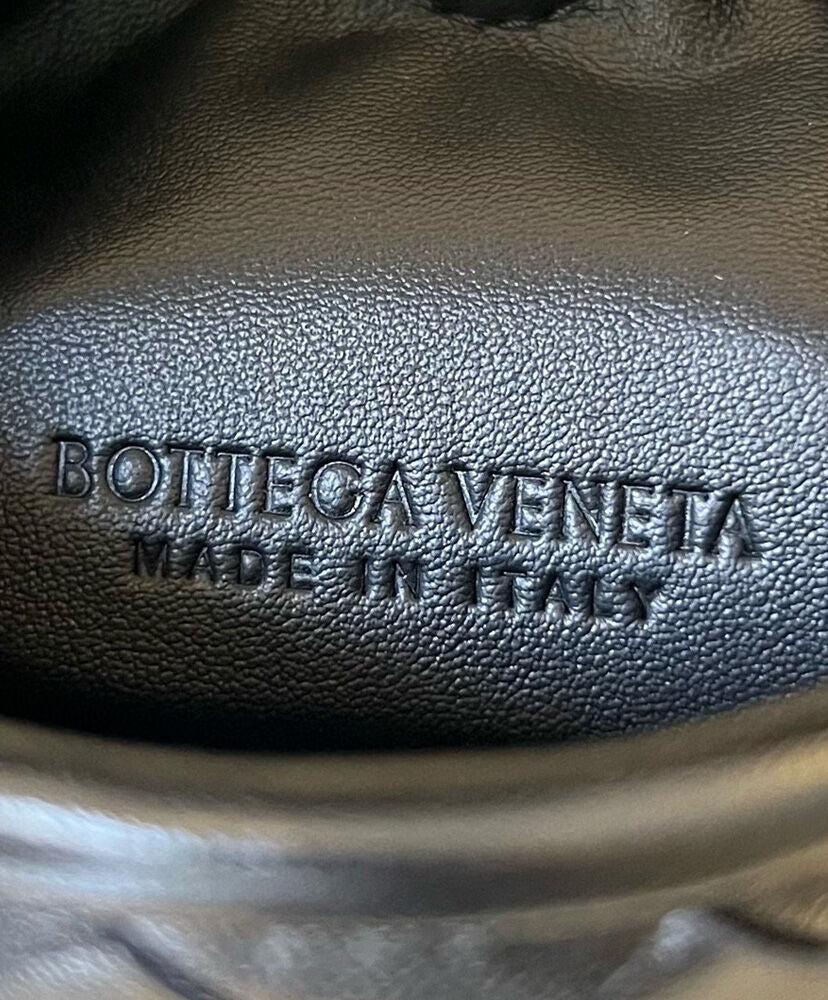 Bottega Veneta's bag is made from strips of black leather using its signature intrecciato technique, which not only looks good but also strengthens the design. It has a small opening at the top to slip your phone, cardholder and keys into, and comes with a detachable strap to carry it over your shoulder.